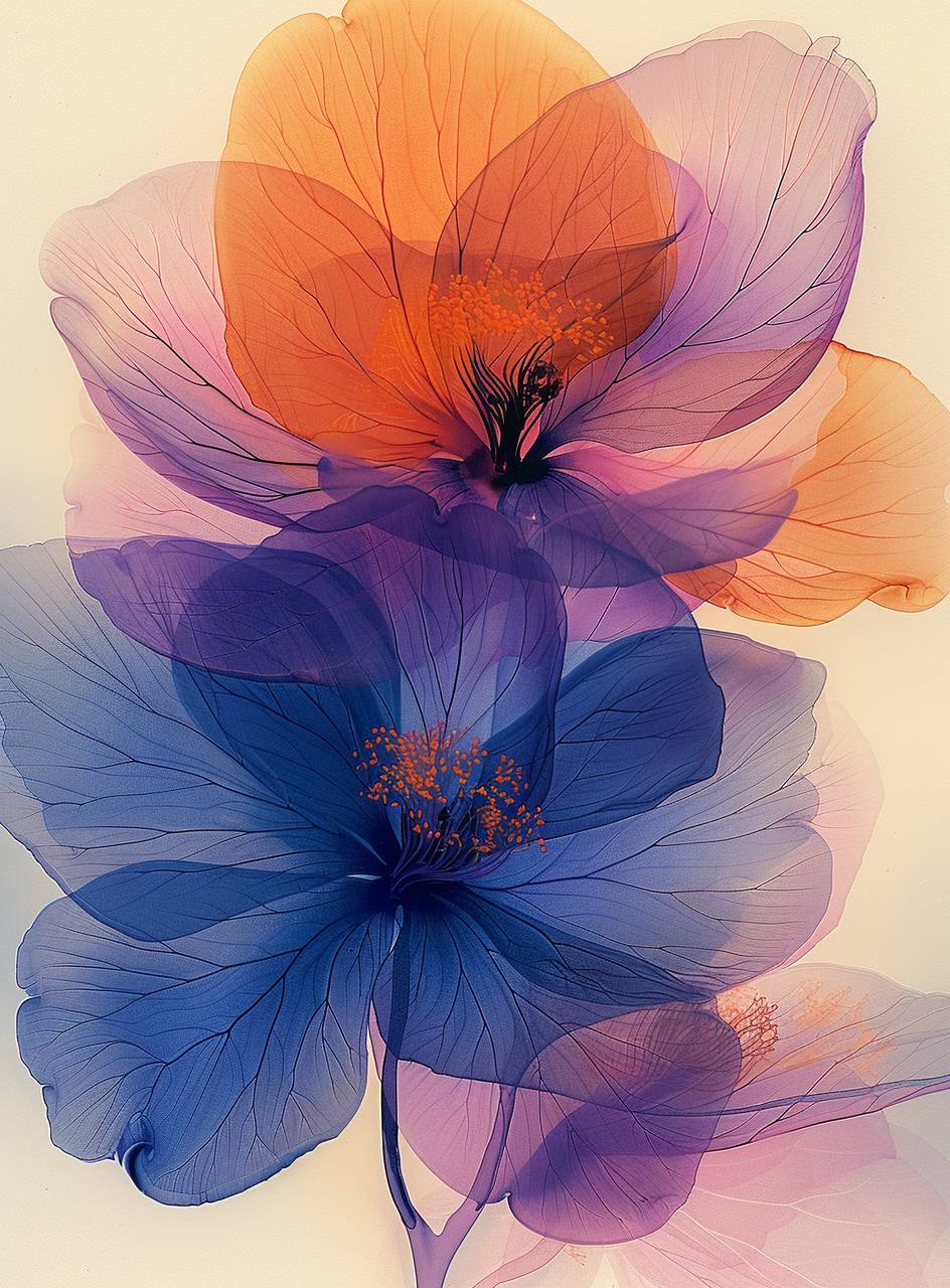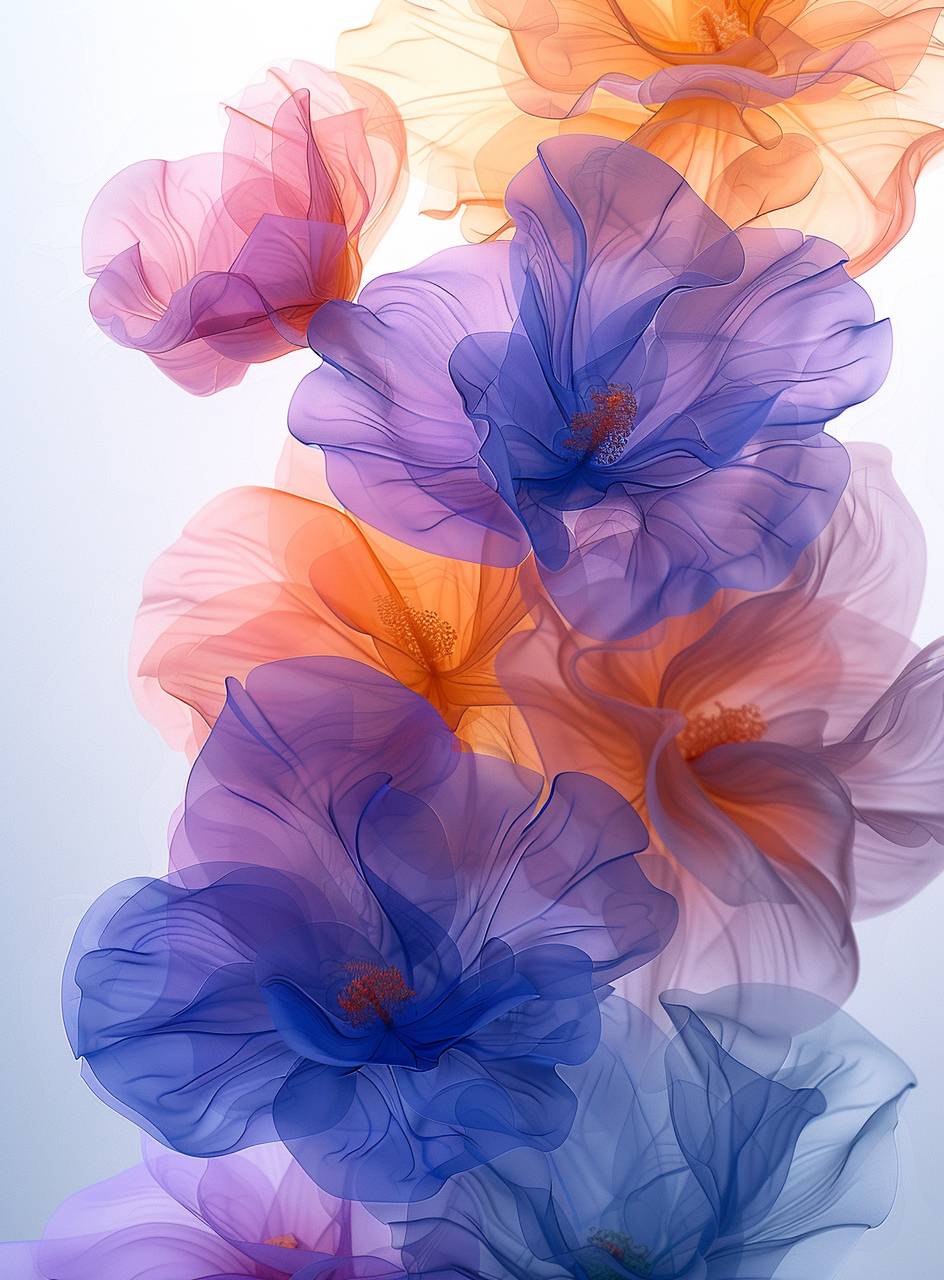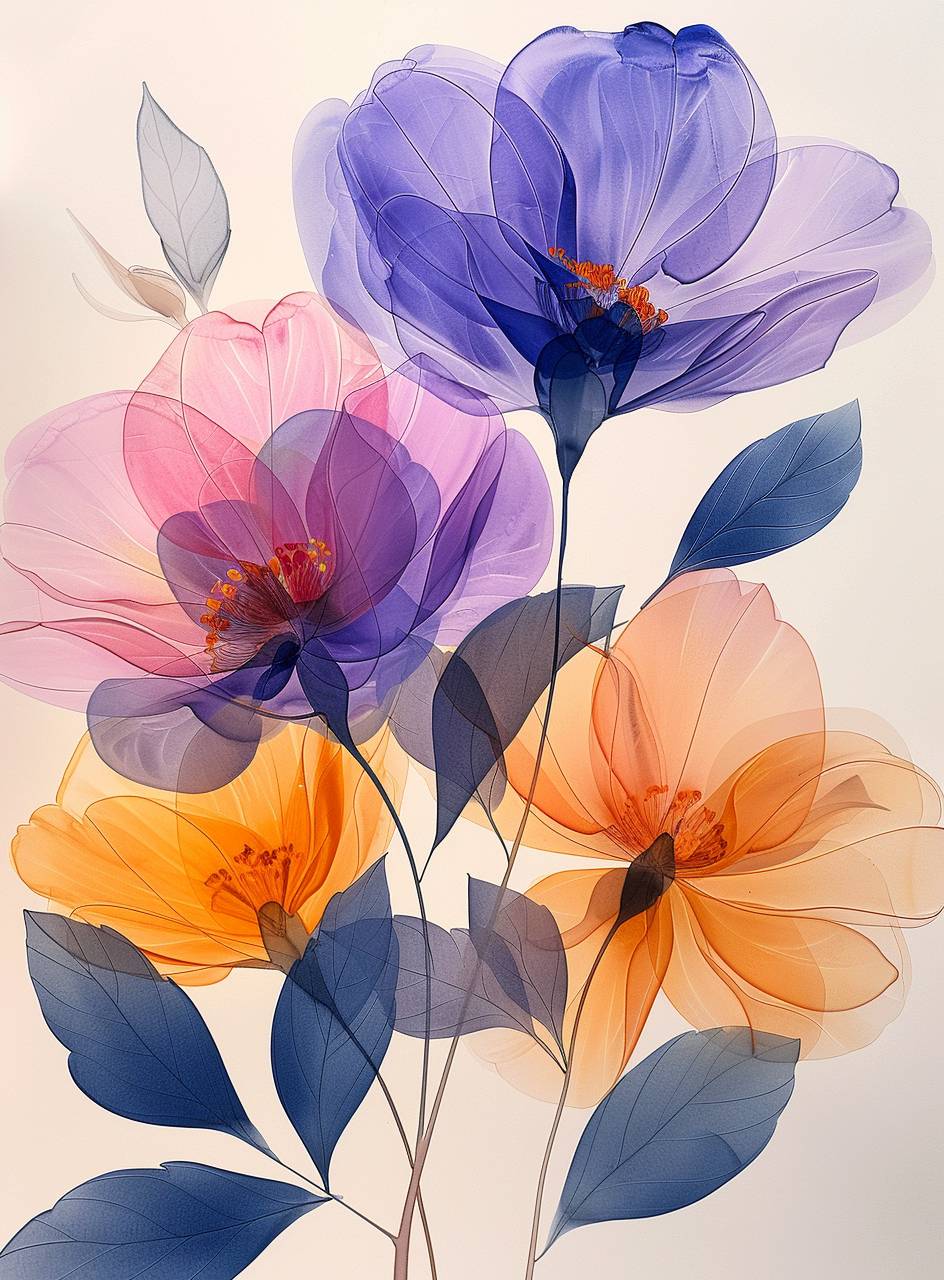 Тонкая акварельная живопись с абстрактным цветочным дизайном, выполненная в мягких пастельных тонах и обтекаемых линиях, создающих нежные лепестки в оттенках фиолетового, синего, розового, желтого, оранжевого и белого на поверхности бумаги. Фон чисто белый, без видимых теней или текстур. Это произведение искусства было создано с использованием алкогольных чернил для создания светящегося эффекта. Также есть тонкий черный контур вокруг каждого цветка, чтобы придать глубину и объем, в стиле Матисса.