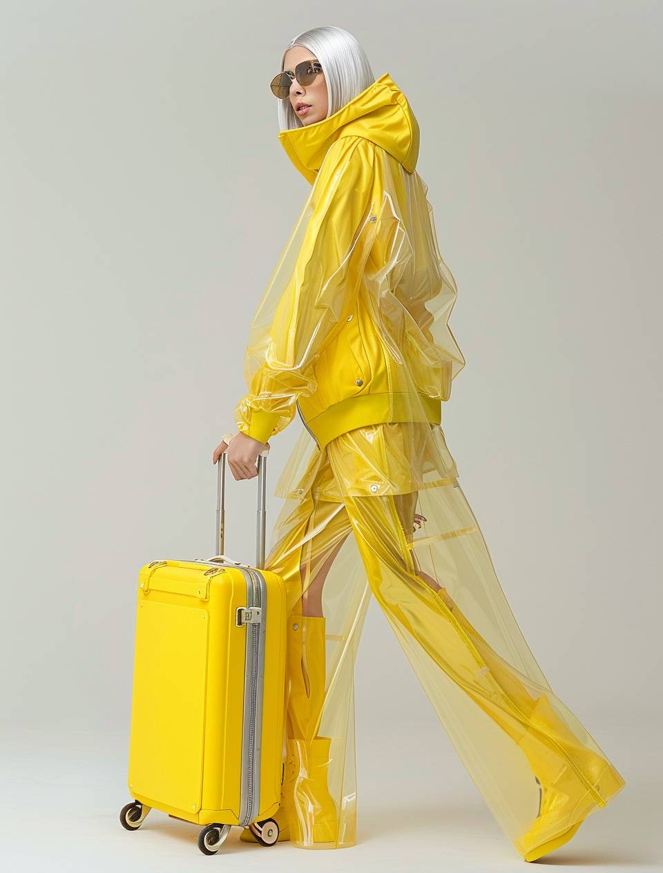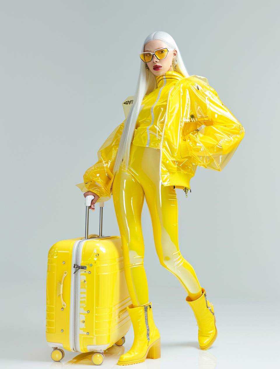 A beautiful woman dressed in yellow futuristic technology with silver-white hair and transparent futuristic glasses with one hand pulling a suitcase full body shot with minimalist background and studio lighting with soft light creating soft shadows on white background with clear focus, Canon photography. --ar 97:128 --v 6.0