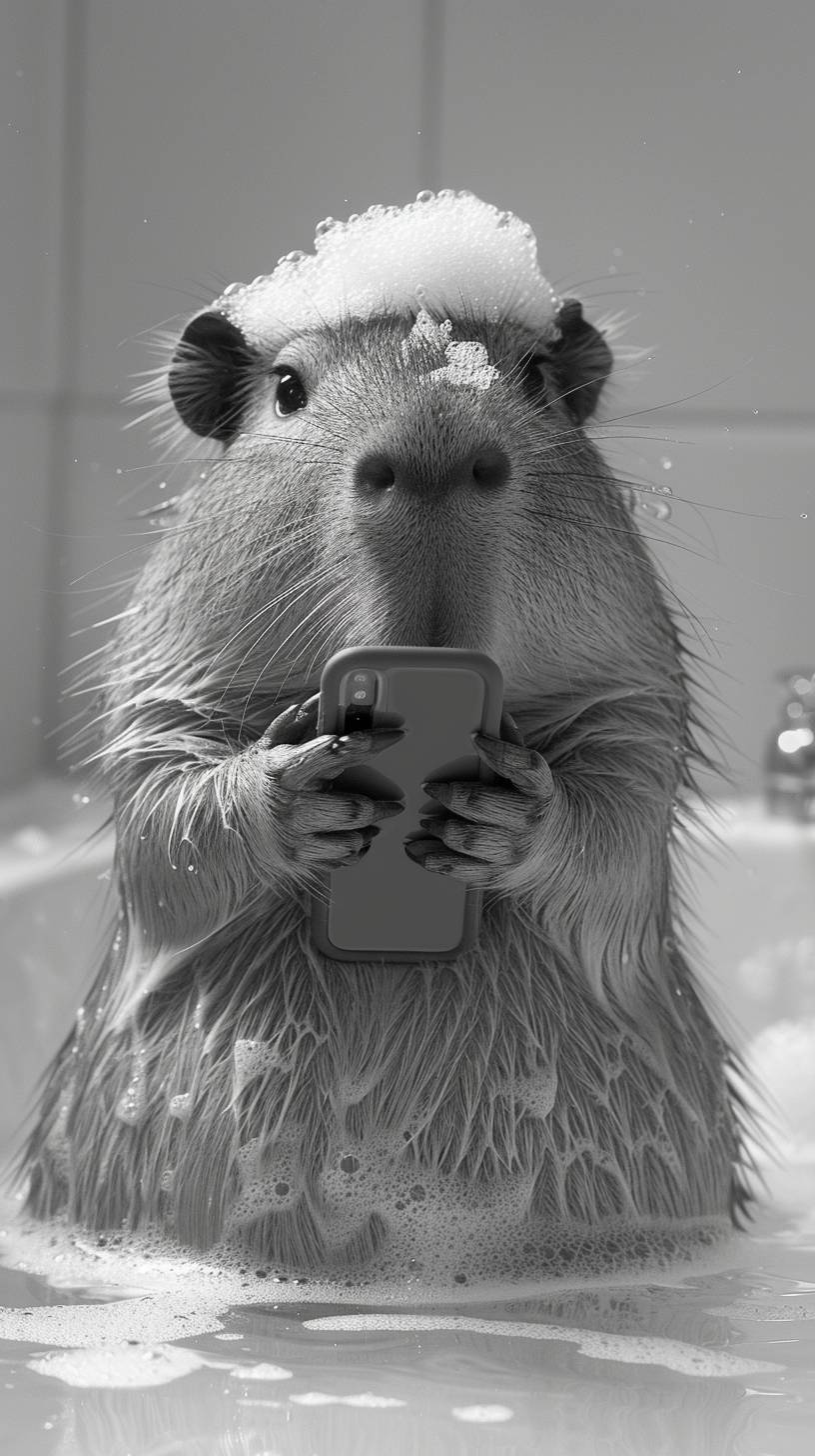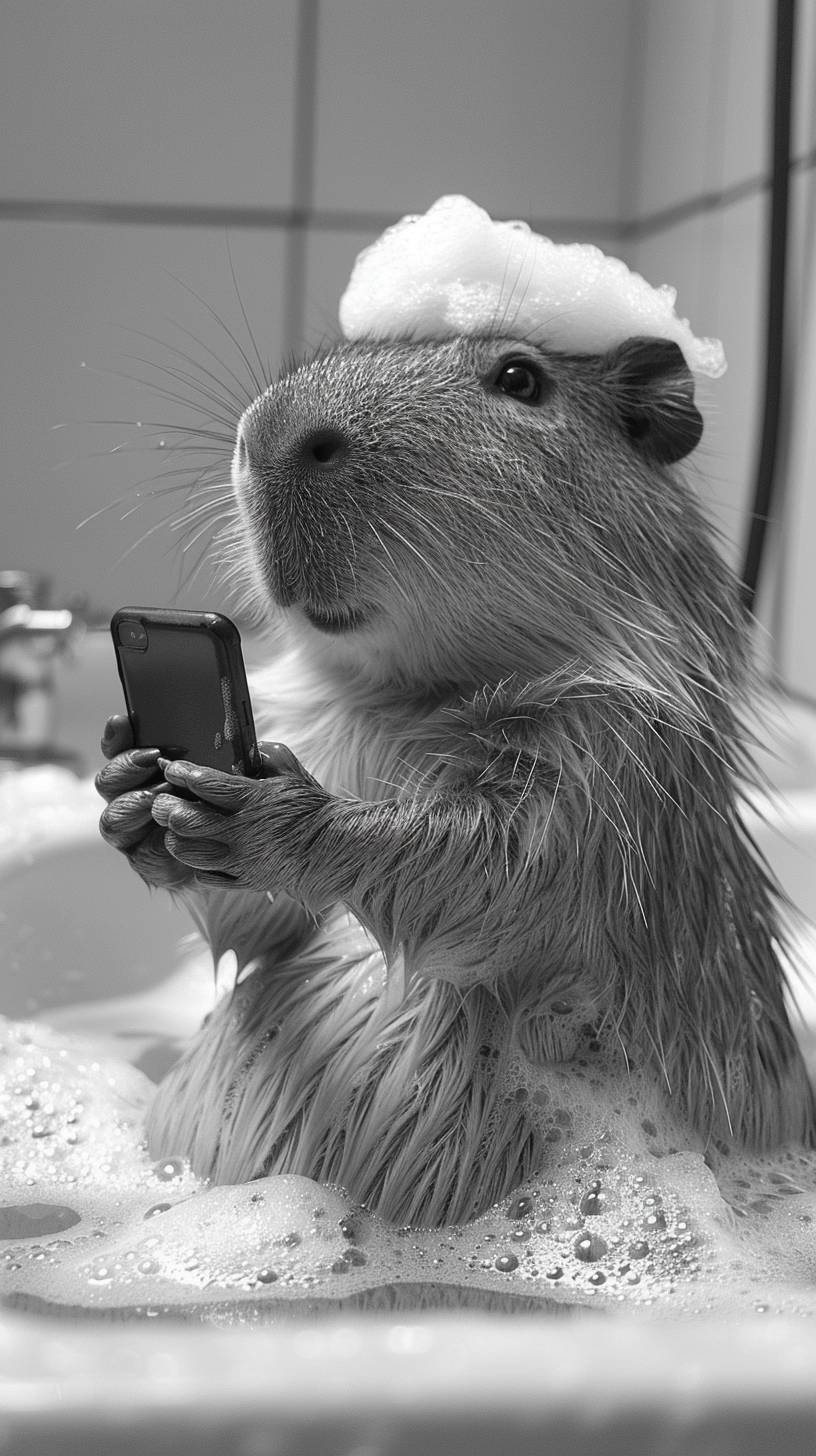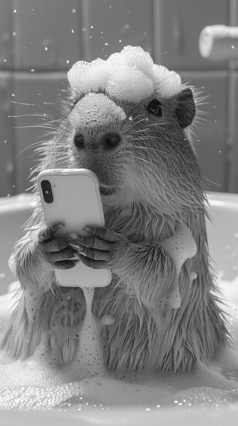 A capybara sitting in a clean white foam-filled bathtub with both hands is typing on a mobile phone, it still has some white foam on its head, frontal view, white background, black and white photo, Canon R5 camera, 50mm lens, photographic light --ar 9:16 --stylize 750 --v 6.0