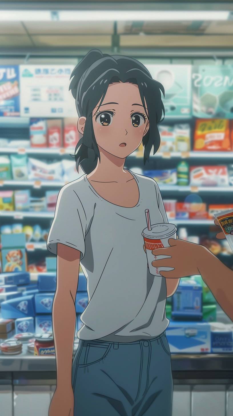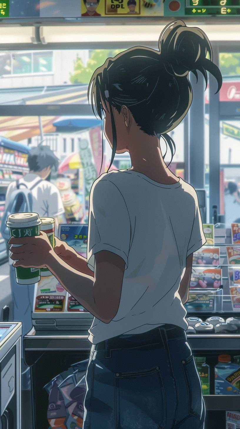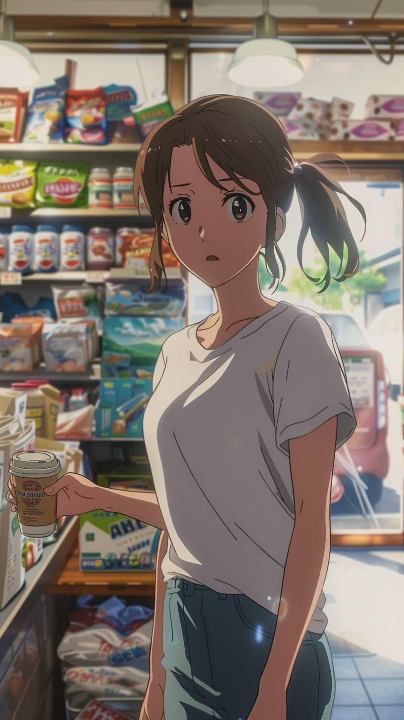 In Makoto Shinkai animation style, POV of convenience store staff, front view, close-up shows Emily face to camera and buying lottery ticket at the counter, Emily is a woman tie up her hair and holding 2 cups of coffees on right hands and left hands, she wears white T-shirt, jeans, shoes, america convenience store, daylight, bright, animation, --ar 9:16 --v 6.0