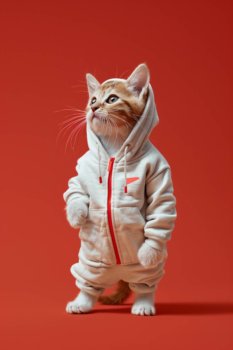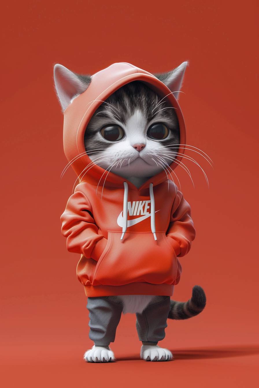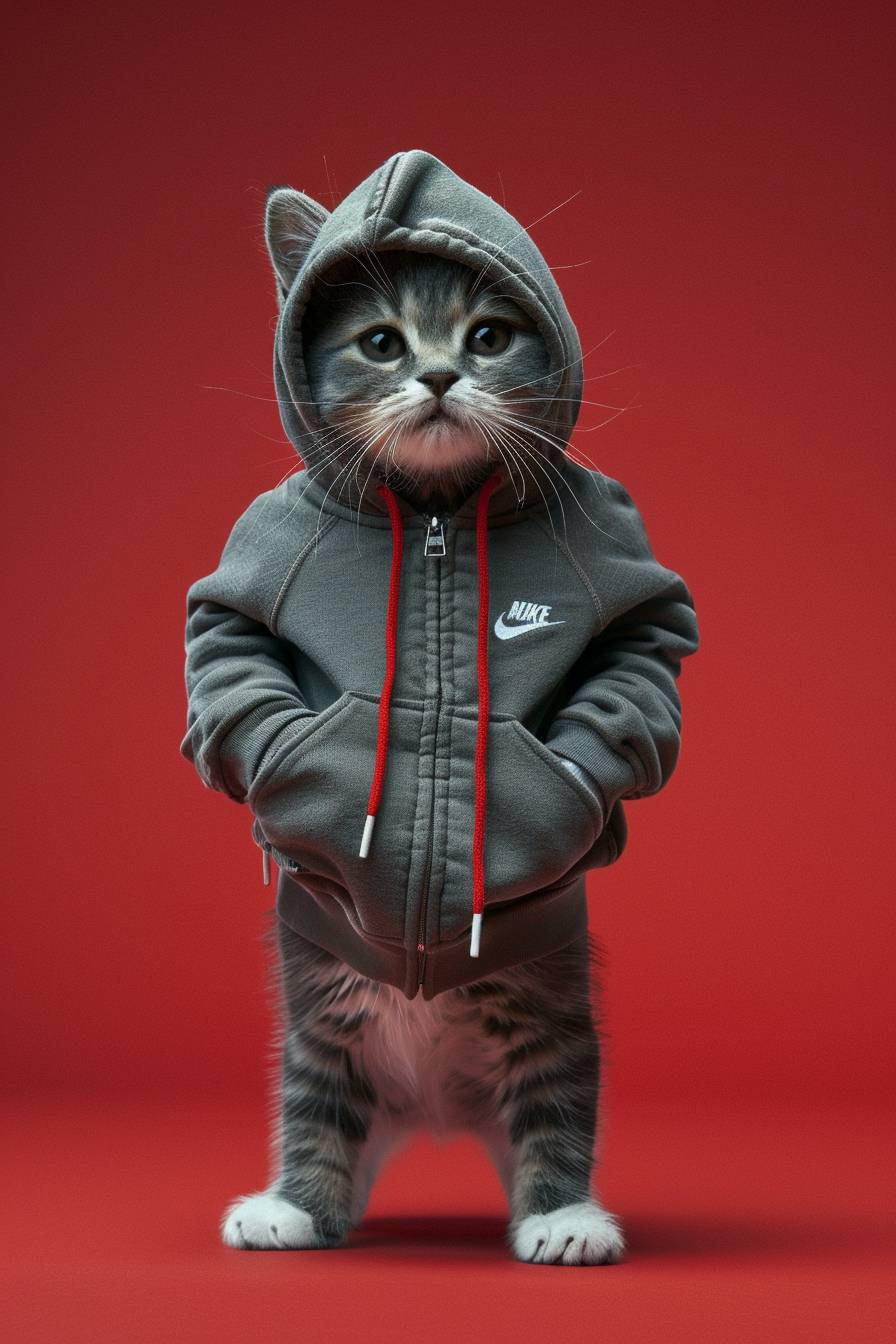 commercial nike sport photo, blind box design, cute little cat wearing a hoodie, standing posture, solid red background, super detailed photo --ar 2:3 --v 6.0