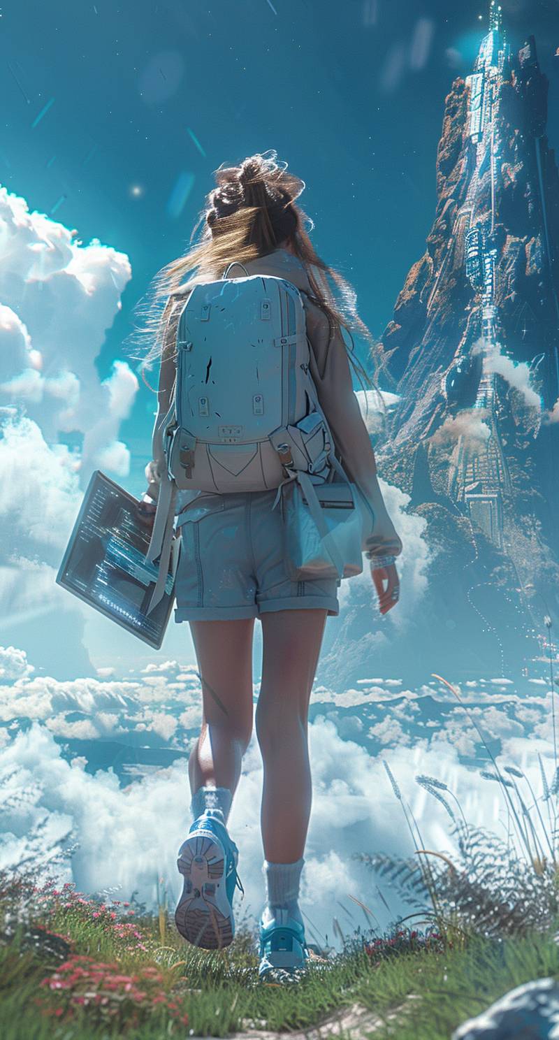 A girl with long fair hair, wearing blue sneakers and shorts on her legs, carrying an open laptop computer in one hand while walking on the grassland, with blue sky and mountains behind her. The background is a futuristic world, It has a cool tone of light blue and purple color scheme, high detail, high resolution, octane rendering, bright colors, hyperrealistic, detailed textures, full body portrait, professional photography, magazine cover photo, beautiful, cinematic effect, 3D design, and C4d rendering. --ar 69:128 --style raw --stylize 250 --v 6.0
