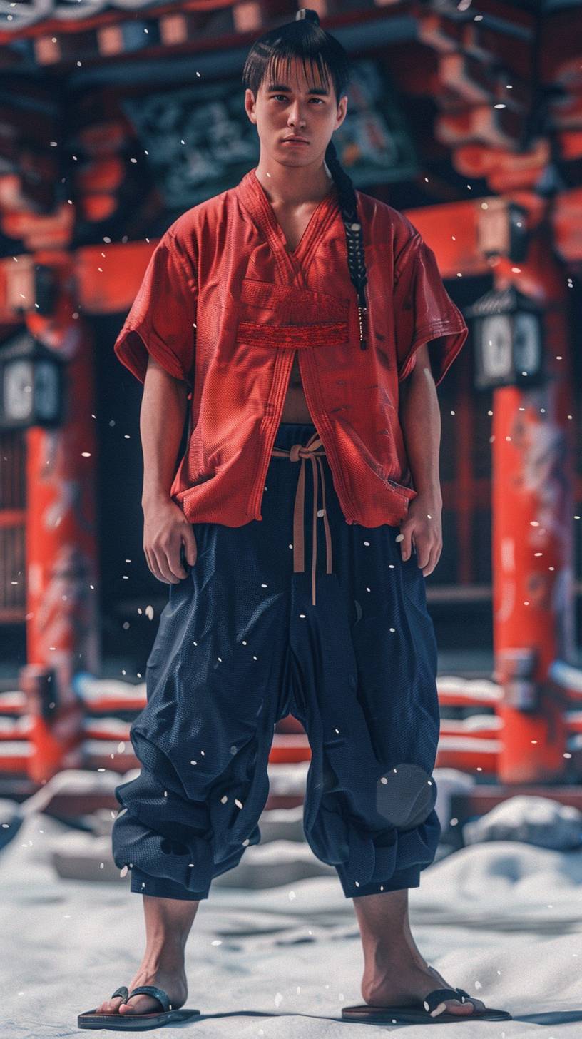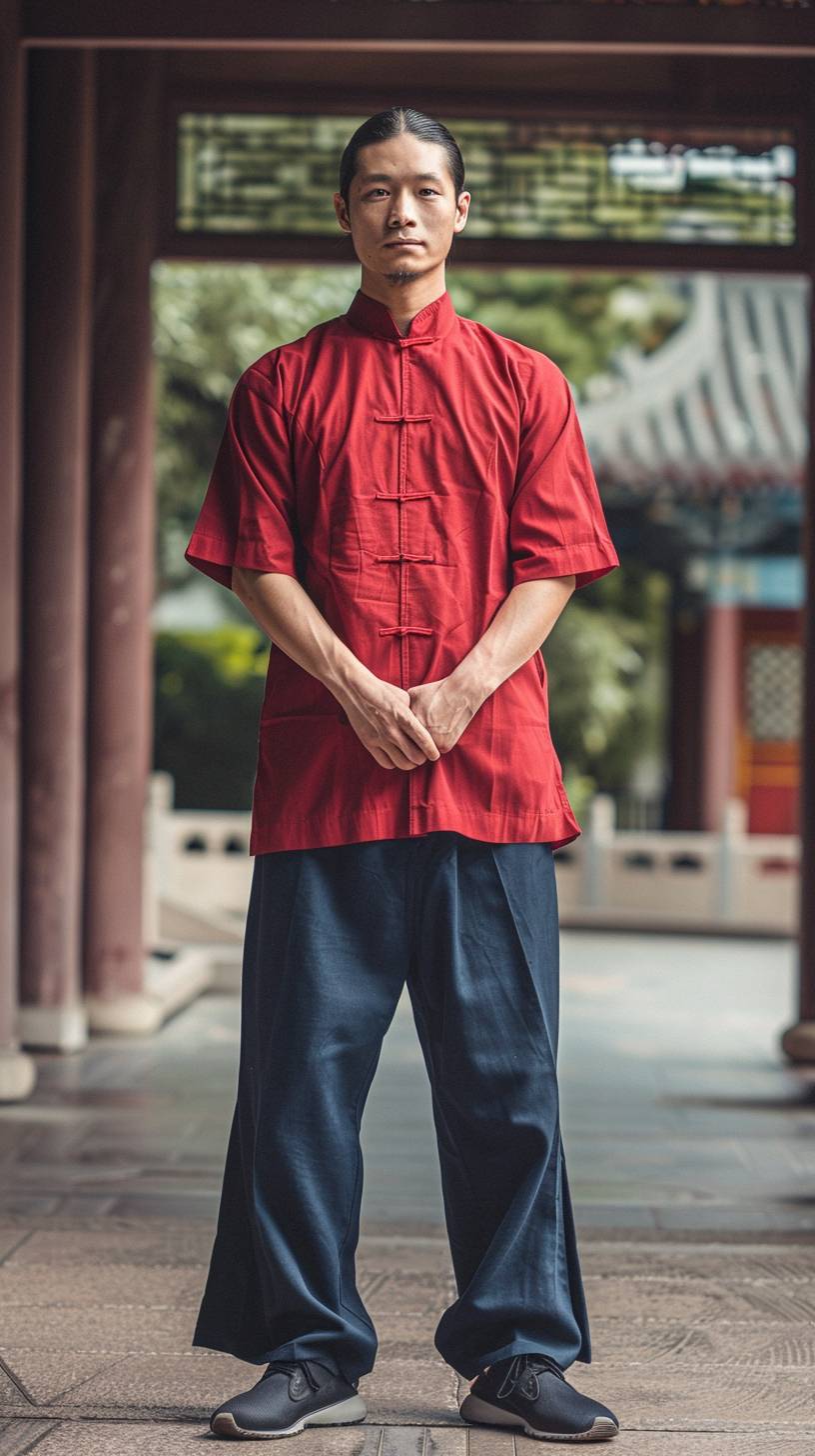 real life,BLACK hair,short hair,short braid,red kungfu shirt,navy blue kungfu pants,Japanese man ,full body shot,--no bun hair --ar 9:16 --v 6.0