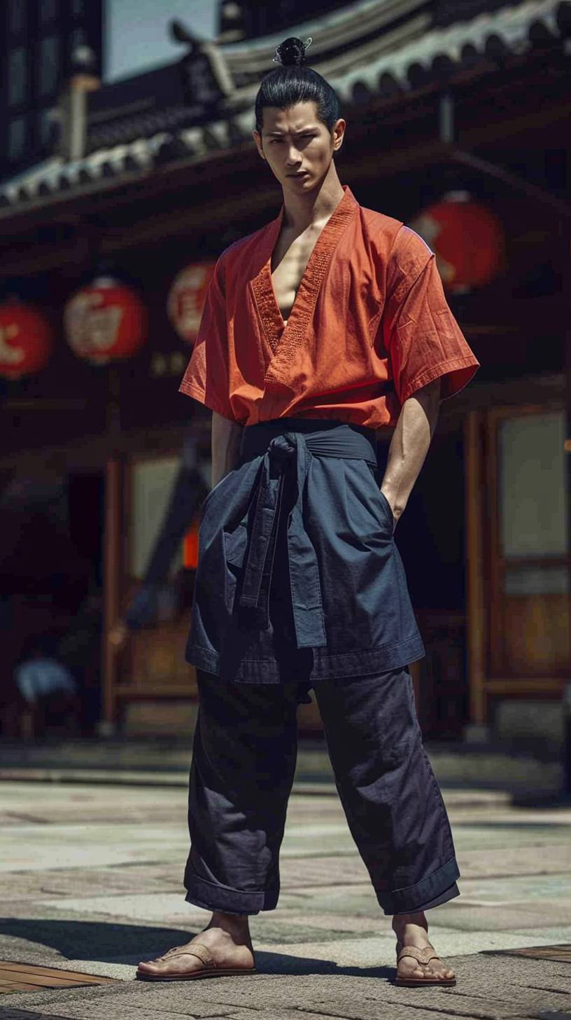 реальная жизнь, черные волосы, короткие волосы, короткая коса, красная краватка кунг-фу, брюки глубокого синего кунг-фу, японский мужчина, полный снимок