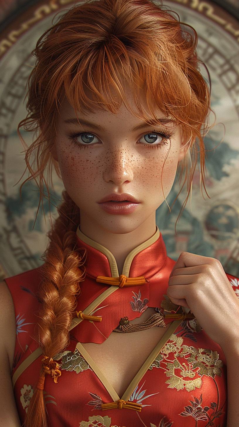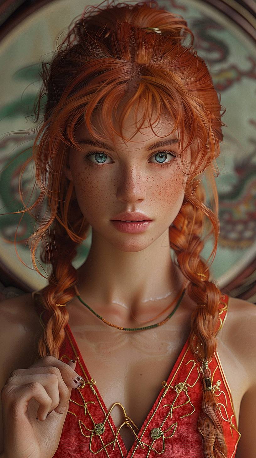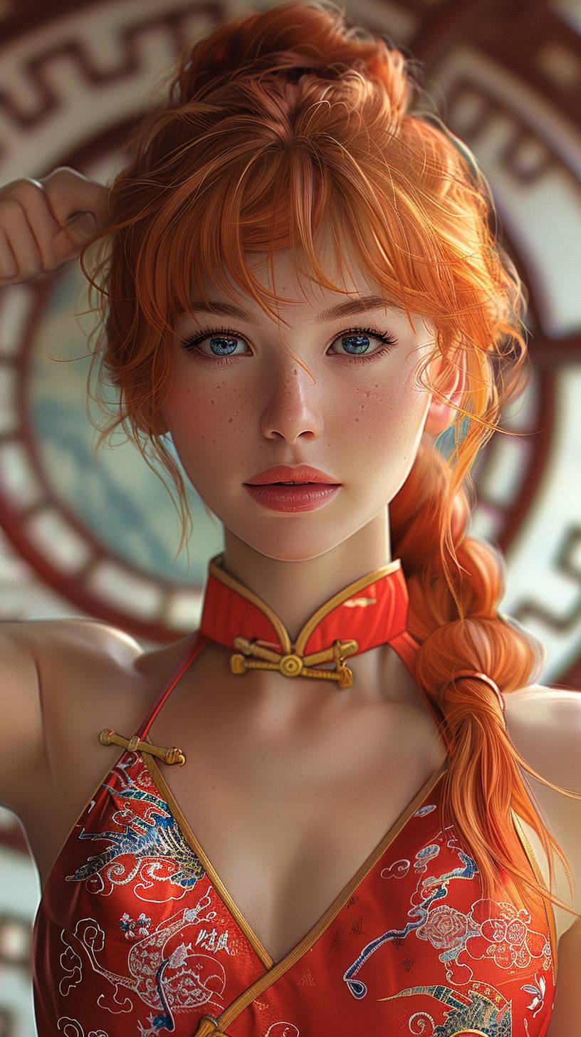 Фотореалистичный портрет, сосредоточенный на верхней части тела яркой 16-летней девушки с смешанными японскими и европейскими чертами, напоминающей женскую форму Ранмы Саотомэ. У нее гладкая, чистая кожа, большие миндалевидные глубокие голубые глаза, искрящиеся решимостью, и яркие ярко-красные волосы, заплетенные в низкую тройную косу у основания шеи. Ее лицо демонстрирует сочетание тонких азиатских черт и слегка более выраженных европейских характеристик. Она носит традиционную китайскую красную безрукавку с желтыми застежками, которая слегка облегает ее атлетичное телосложение. Девушка запечатлена в момент действия, ее верхняя часть тела динамично скручена, как будто она выполняет высокий удар. Ее правая рука высоко поднята, кулак сжат, в то время как левая рука согнута в локте, находится в защитной позиции близко к груди. Ее выражение энергичное и уверенное, с широкой, живой улыбкой, демонстрирующей ее решимость и радость в боевых искусствах. Изображение передает ощущение движения и жизненной силы, подчеркивая ловкость и дух борьбы Ранмы. На фоне стилизованного фона с большим круговым узором, представляющим традиционные китайские дизайны. Динамичные линии движения подчеркивают силу и гибкость ее позы. Высококачественное детализированное изображение с яркими цветами, четкими контрастами и драматическим освещением, подчеркивающим контуры ее лица и верхней части тела.