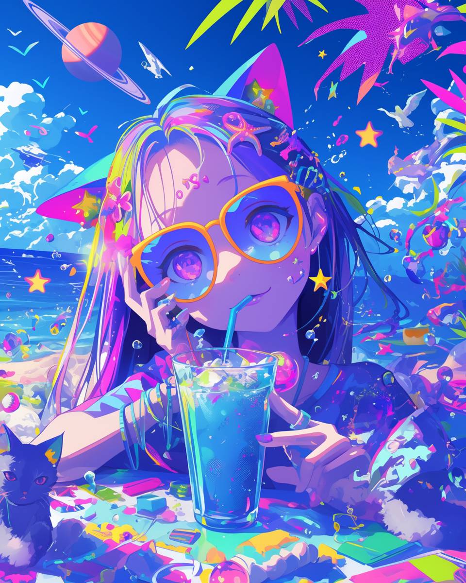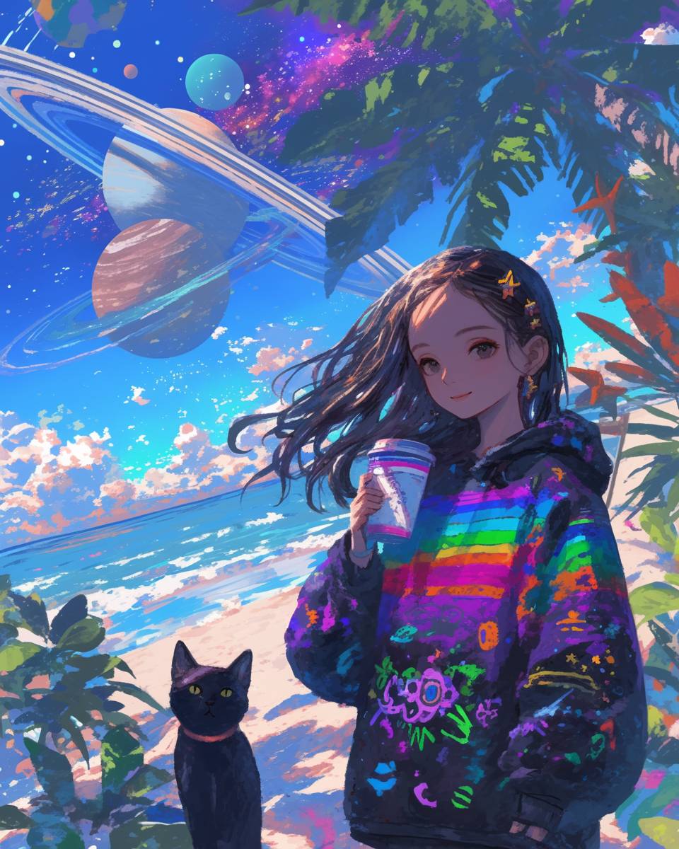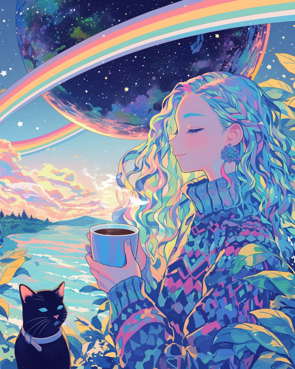 rainbow themed woman at the beach drinking rainbow coffee, cat on shoulder, galaxy sunrise with multiple planets --s 1000 --ar 4:5 --niji 6