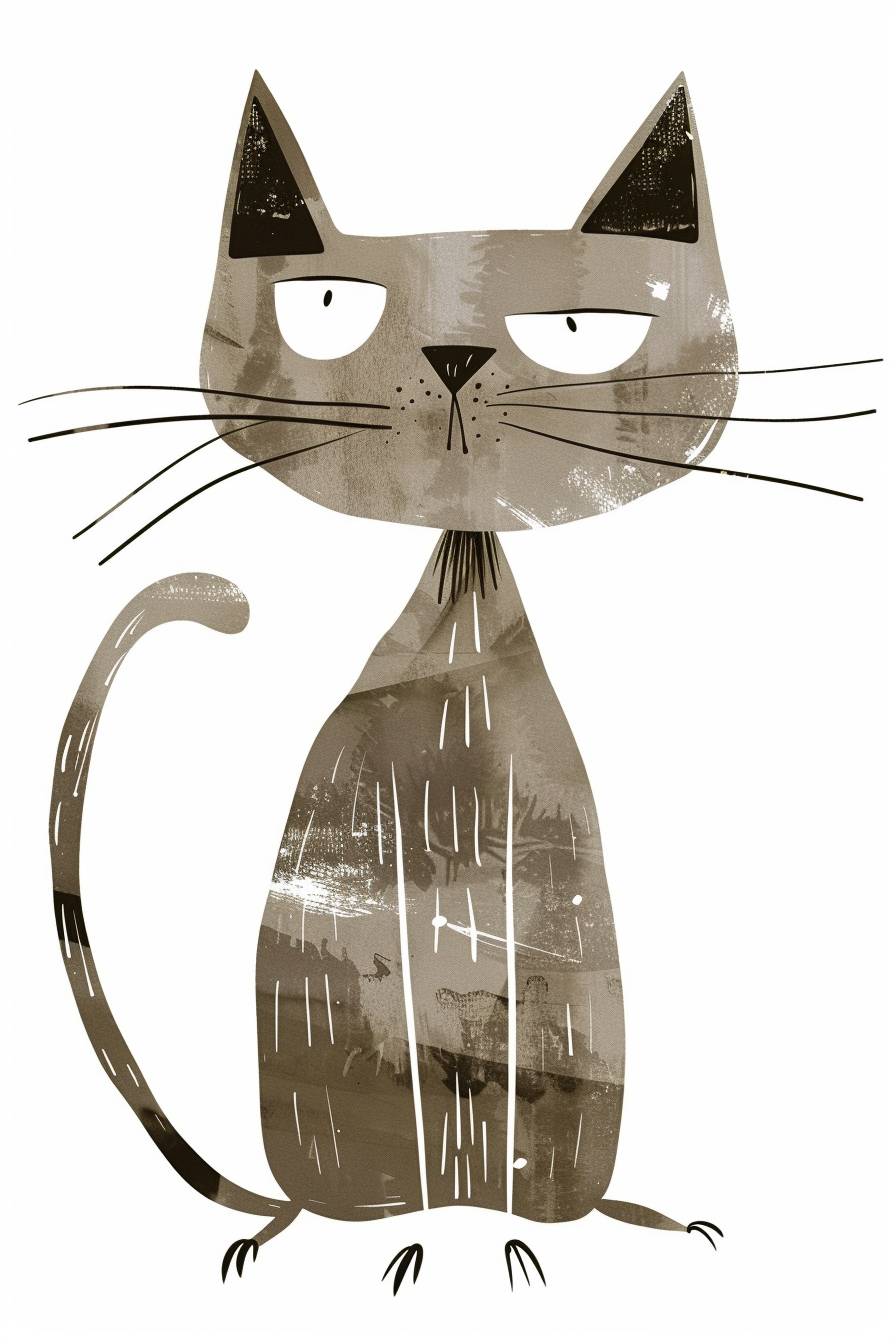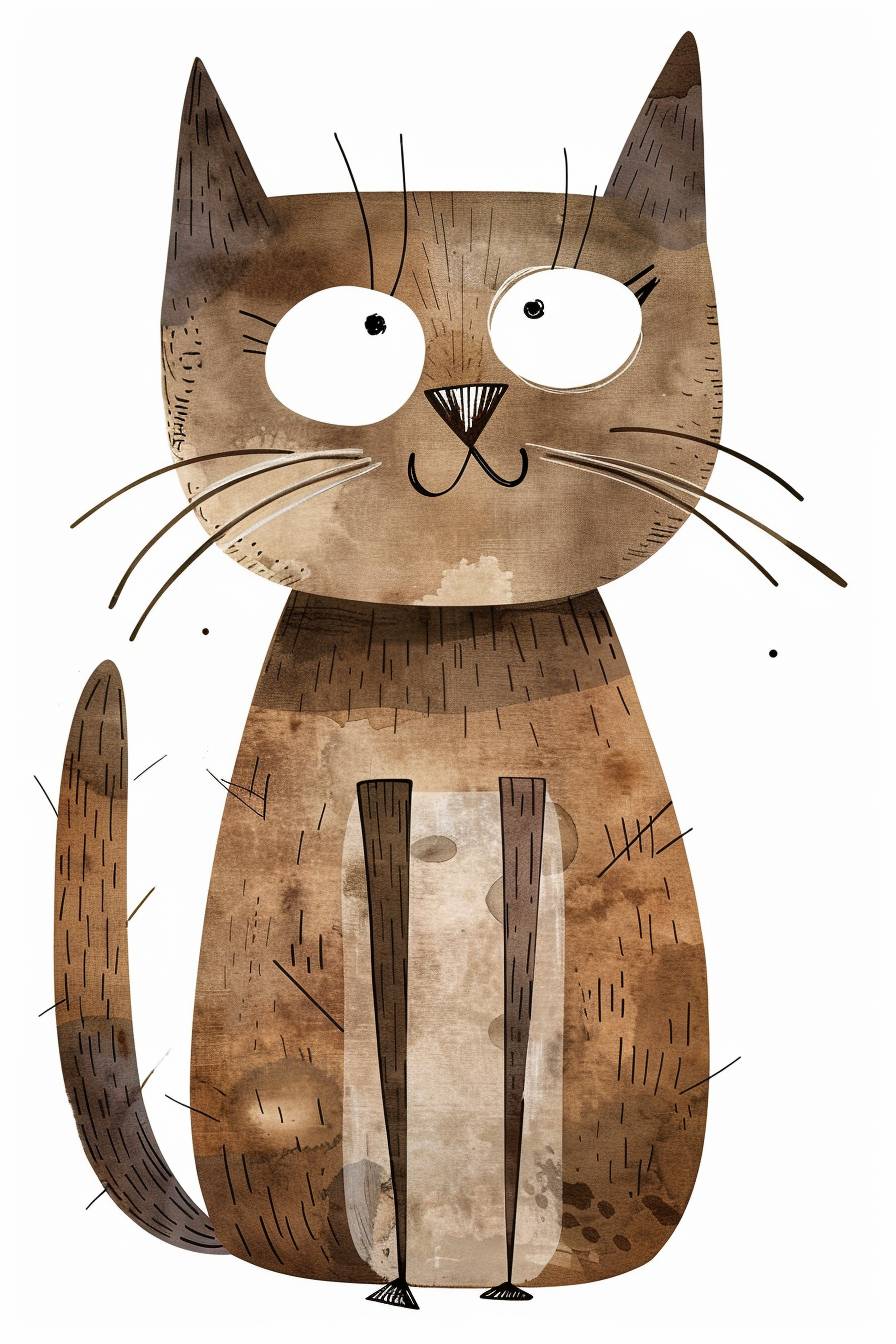 A minimalist full body cartoonish Cat isolated and cut-out on white background. Widely spaced eyes. Small pupils. In the style of childish and whimsy illustrations. Anthropomorphic style. Endearing and funny. Muted tones. In the style of watercolor paintings. Isolated on white background. --no outline, realistic photo details --ar 2:3 --v 6.0