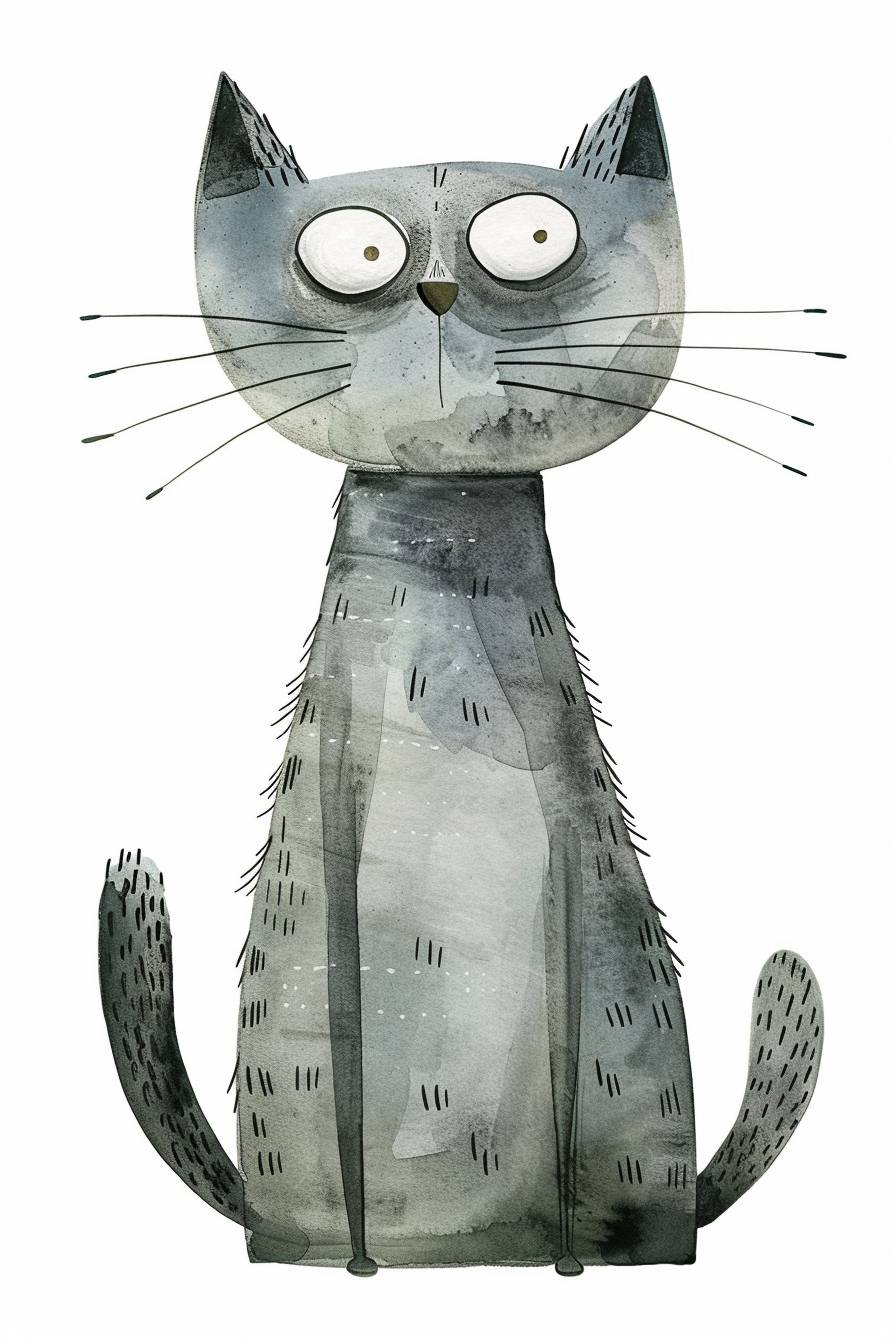 Минималистская карикатура кота в полный рост, изолированная и вырезанная на белом фоне. Широко расставленные глаза. Маленькие зрачки. В стиле детских и причудливых иллюстраций. Антропоморфный стиль. Симпатичный и смешной. Приглушенные тона. В стиле акварельных картин. Изолирован на белом фоне.