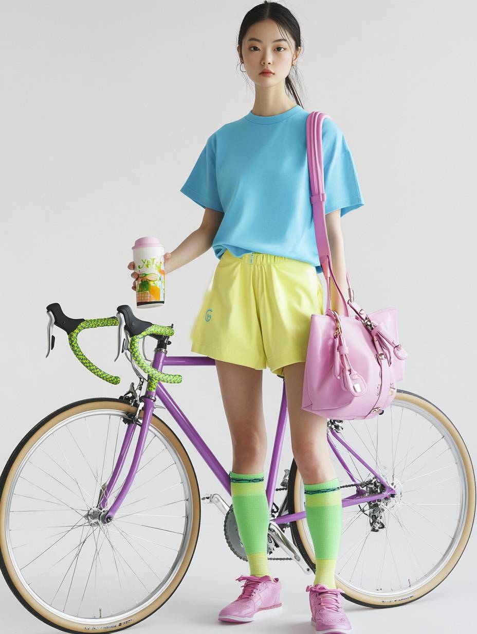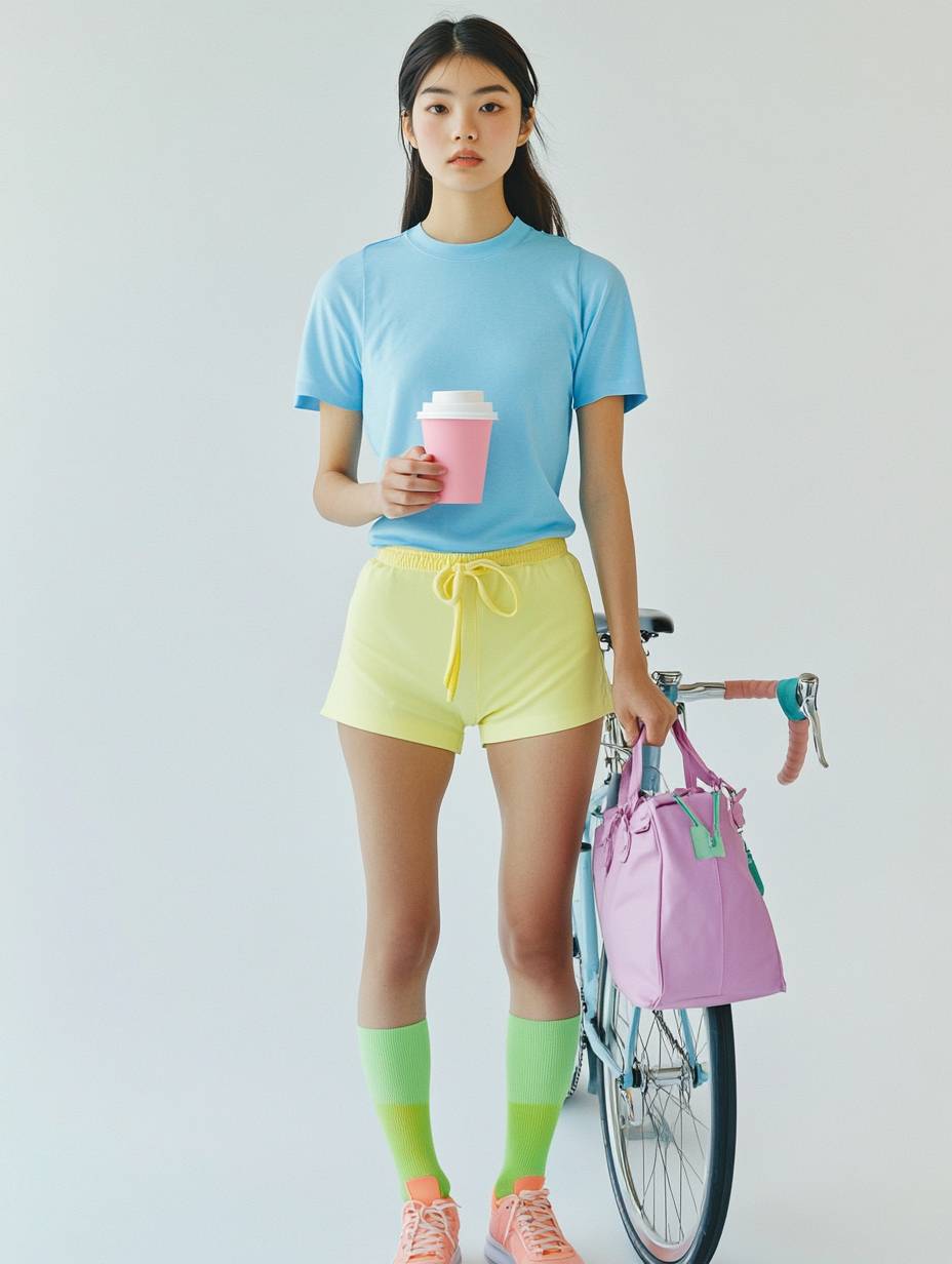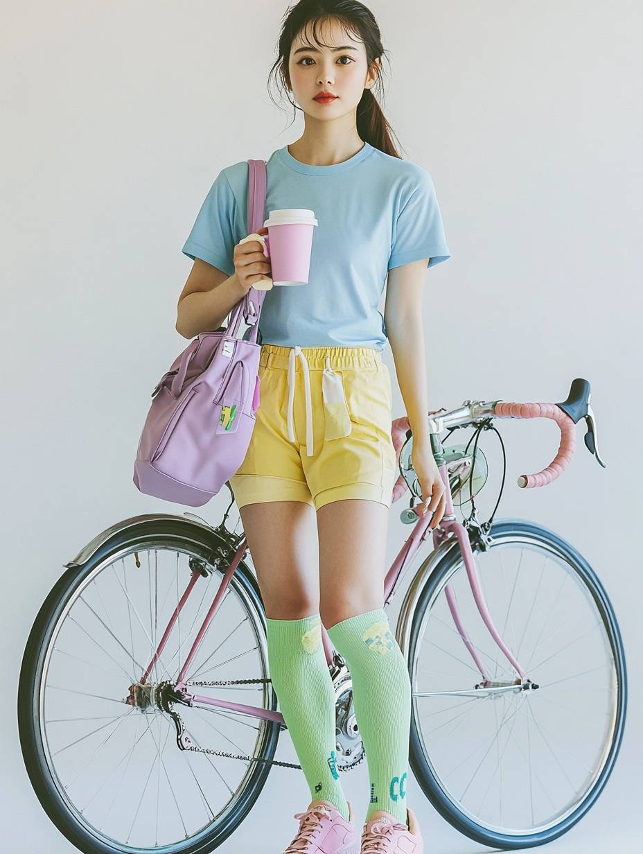 Gucci photoshoot of a Japanese woman standing next to her bike, holding a handbag and coffee cup wearing colourful socks with lime green laces. She is dressed in a bondi blue solid color Tshirt, a pair of yellow cycling shorts and pink sneakers. the photo shows well the loose shape and the fast-drying fabric texture of the blue tshirt. She has dark hair tied back in a tight ponytail. Her bags are pastel pink and purple. A full body shot against a white background with soft light in the style of editorial photographer Tim Walker. --ar 3:4 --v 6.1