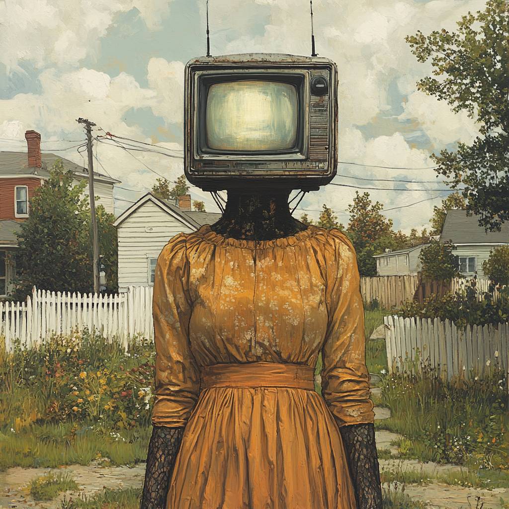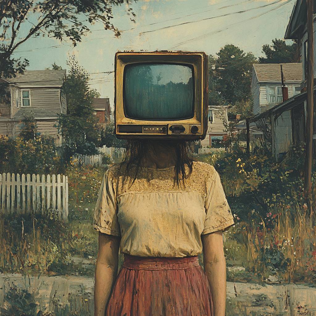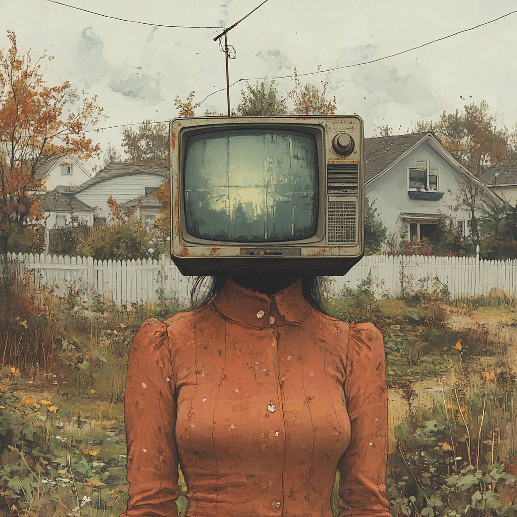 Пригородная телевизионная голова: создайте художественный полуэскиз и полупиктографию женщины с головой старого телевизора, стоящей в тихом пригородном районе. Экран телевизора отображает статичное изображение. Она одета в повседневную одежду, а на фоне должны быть дома, деревья и белый забор, подчеркивающий странное сопоставление телевизионной головы в типичной пригородной обстановке.