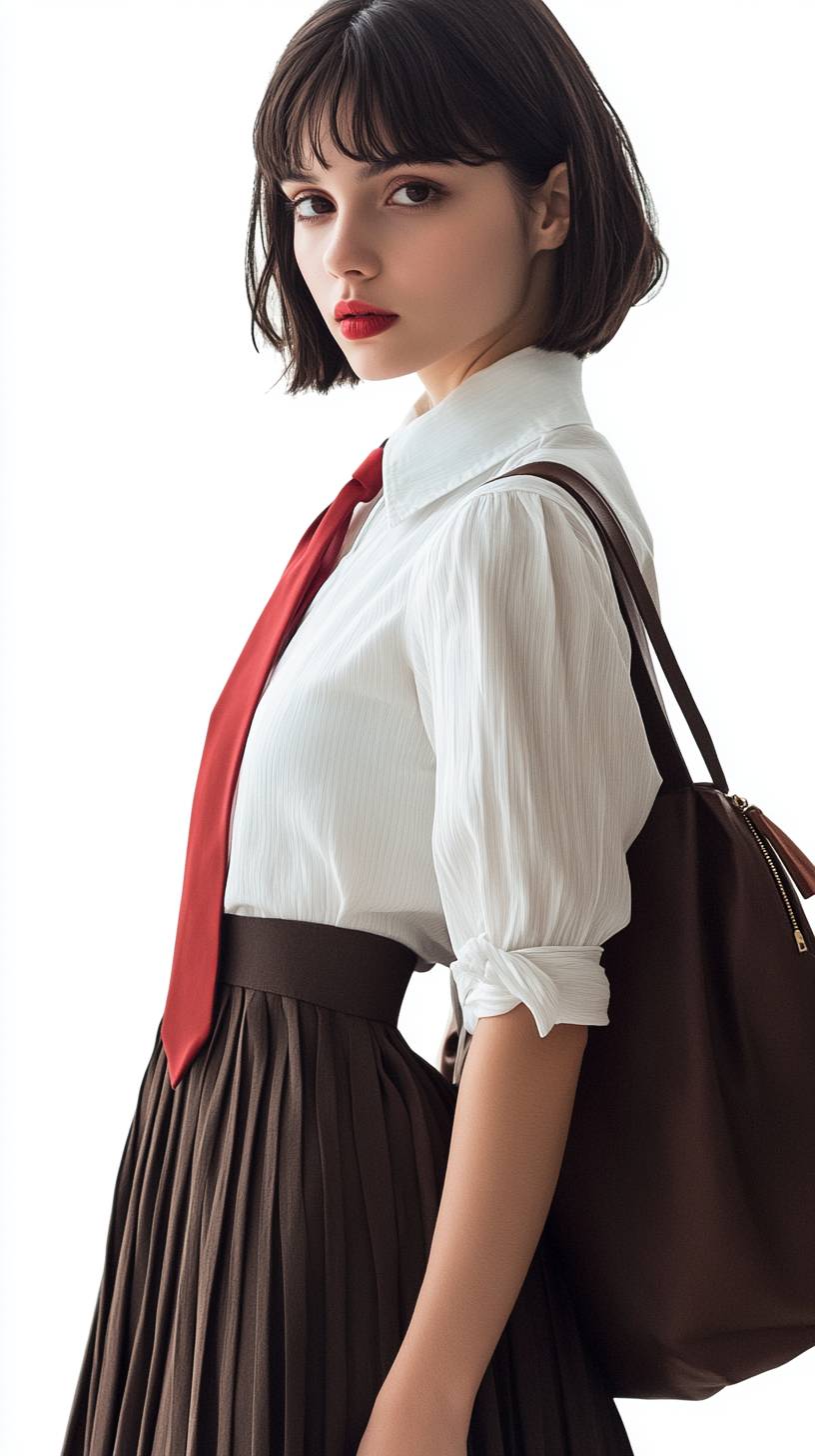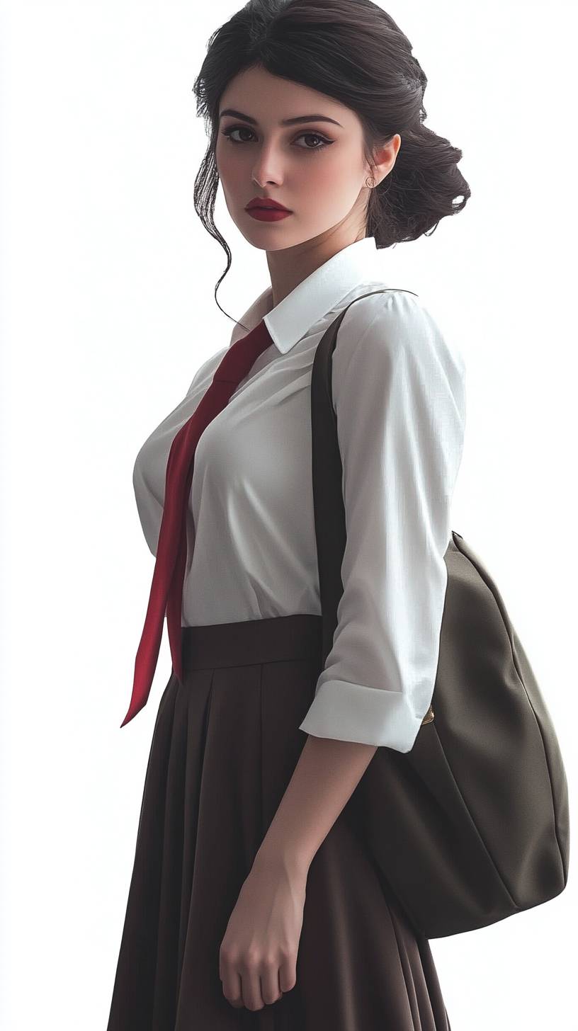 Beautiful dark haired woman with short asymmetrical haircut wearing white shirt with red tie dark brown long skirt carrying school bag on transparent background looking at camera hyperrealistic photography style raw style --ar 9:16 --v 6.1