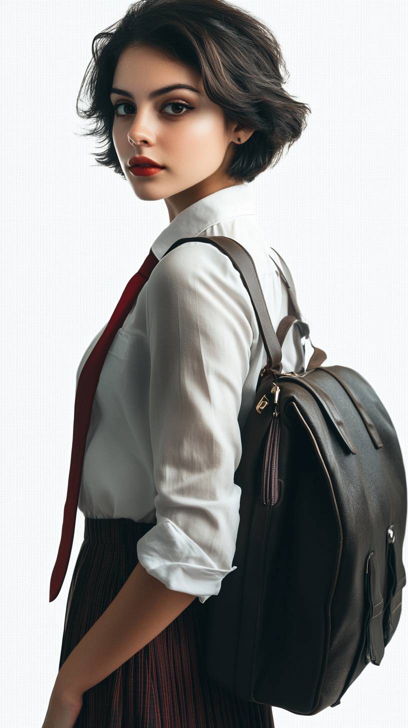 Красивая женщина с темными волосами и короткой асимметричной стрижкой, в белой рубашке с красным галстуком, тёмно-коричневой длинной юбке, держащая рюкзак на прозрачном фоне, смотрящая в камеру, стиль гиперреалистичной фотографии, сырой стиль