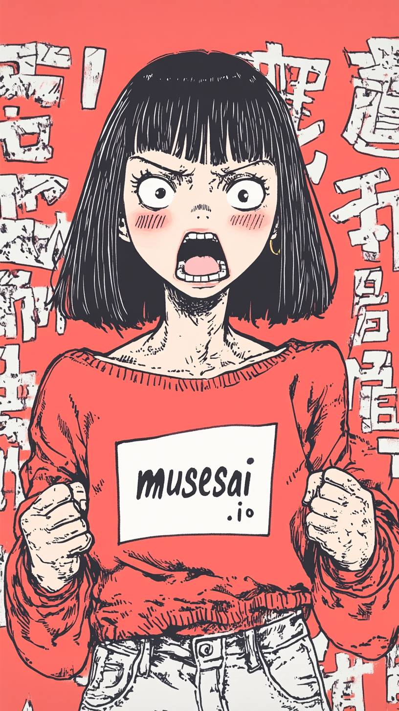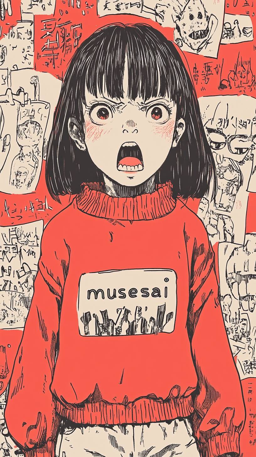 Постер аниме-фильма "musesai", девочка в красном свитере с текстом на груди “.io”, милая девочка, руки на экране, сердитое выражение, в стиле китайских иероглифов, черно-белые комиксы, плоские панели комиксов, фронтальная перспектива, простые линии, в стиле японского манги, цветные анимационные кадры, цветовая схема с высоким контрастом, красная стенка. Она носит блузку с открытыми плечами из шелкового материала, а ее короткие волосы собраны в две косы с чёлкой. За стенами написано традиционным шрифтом.