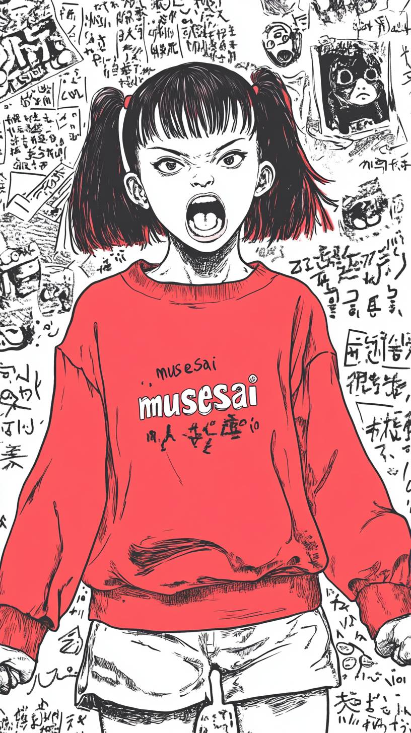 anime movie poster "musesai" , girl in a red sweater with text on a chest ".io" cute little girl with her hands on the screen, angry expression, in the style of Chinese character, black and white comics, flat comic panels, frontal perspective, simple lines, in the style of Japanese manga, colorful animation stills, high contrast color scheme, red background wall. She is wearing an off-the-shoulder top made of silk fabric, and she has short hair tied in two pigtails in the style of bang hairstyle. The walls behind have traditional written all over them. --ar 9:16 --personalize fxs6ml4 --v 6.1