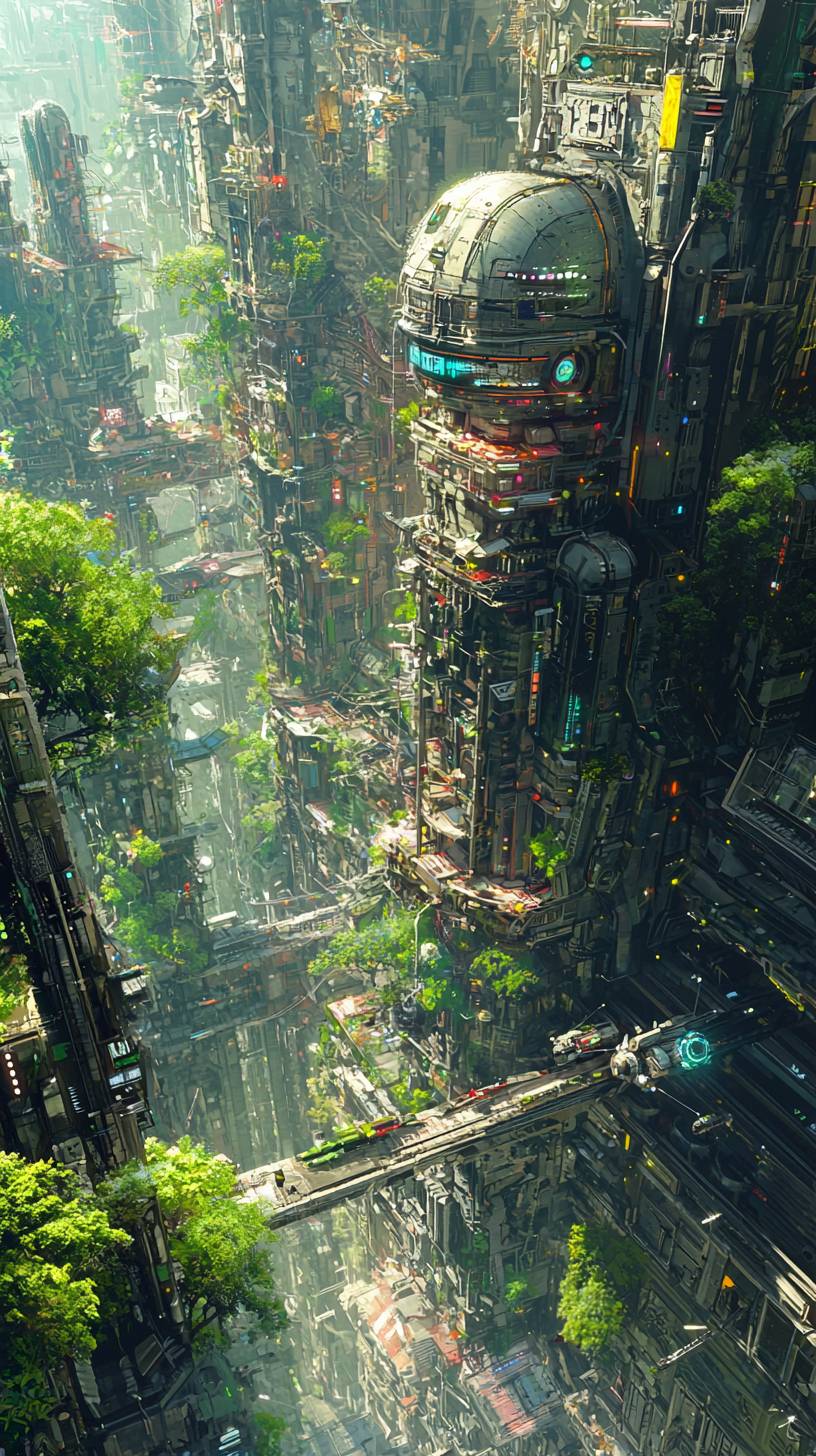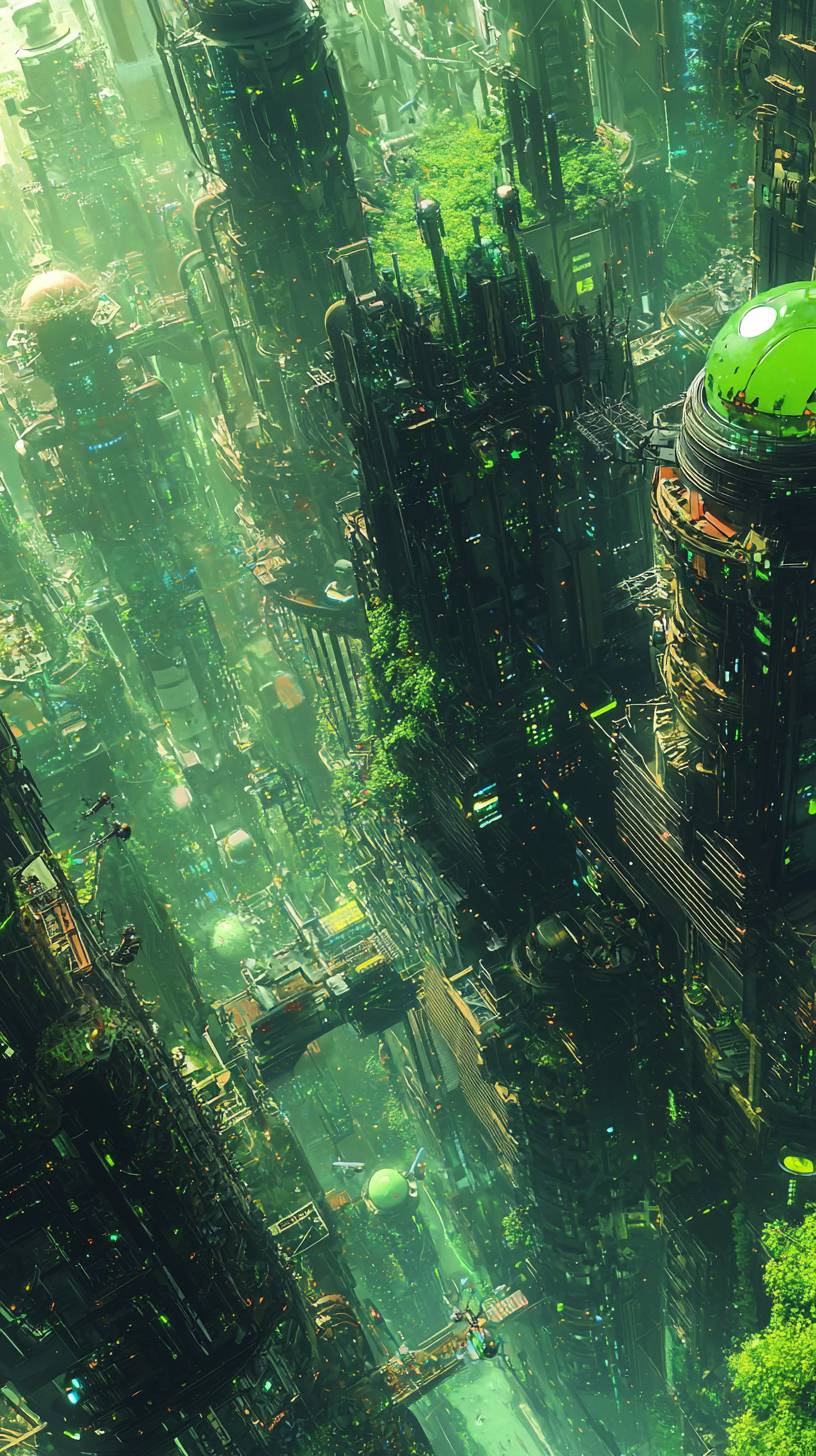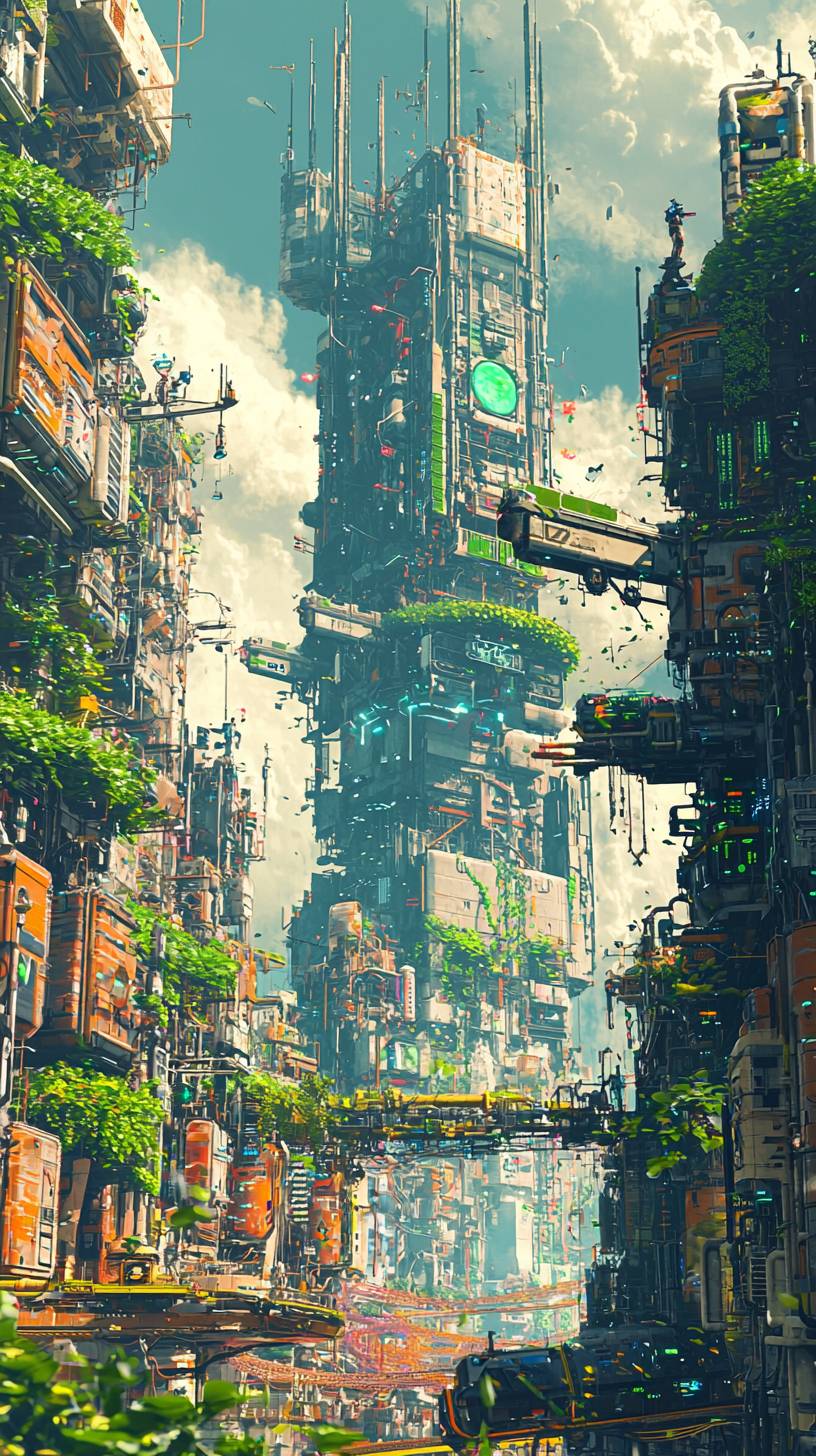 splarpunk, lots of saturated green like spring, sunny, juicy colours. Makke it futuristic, include small robots. Triving place, far distance, detailed --ar 9:16 --quality 2 --v 6.1
