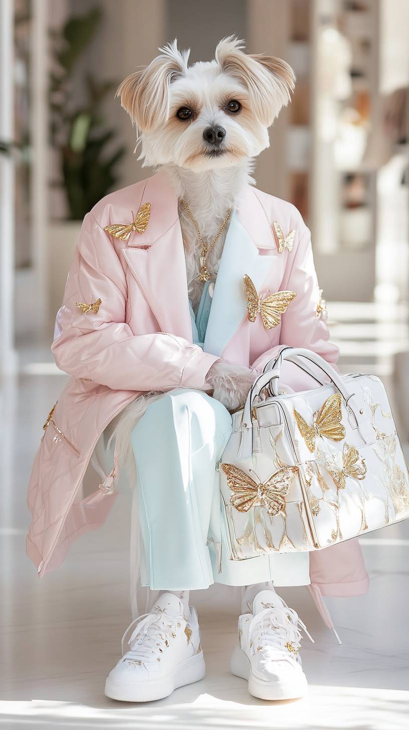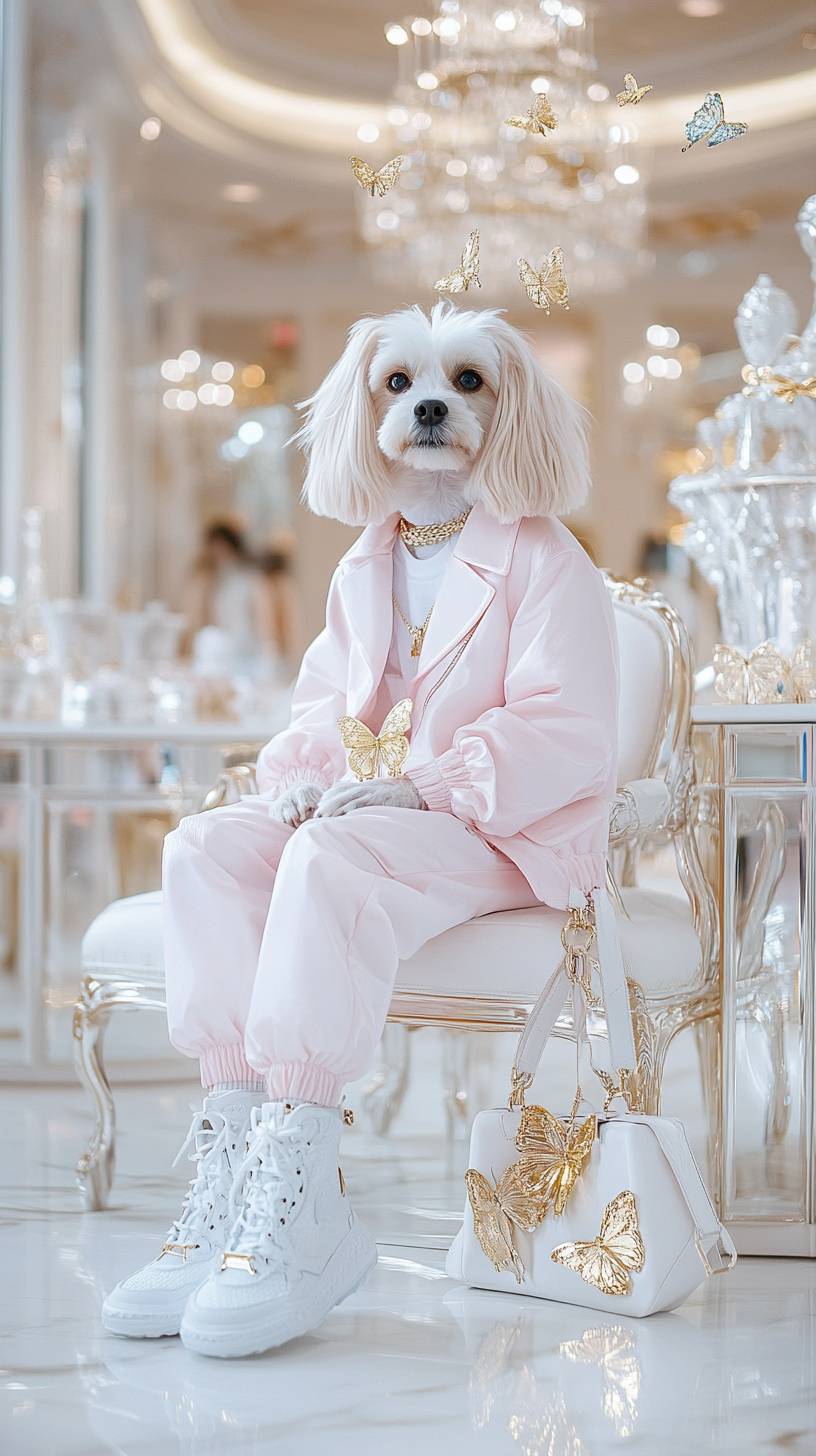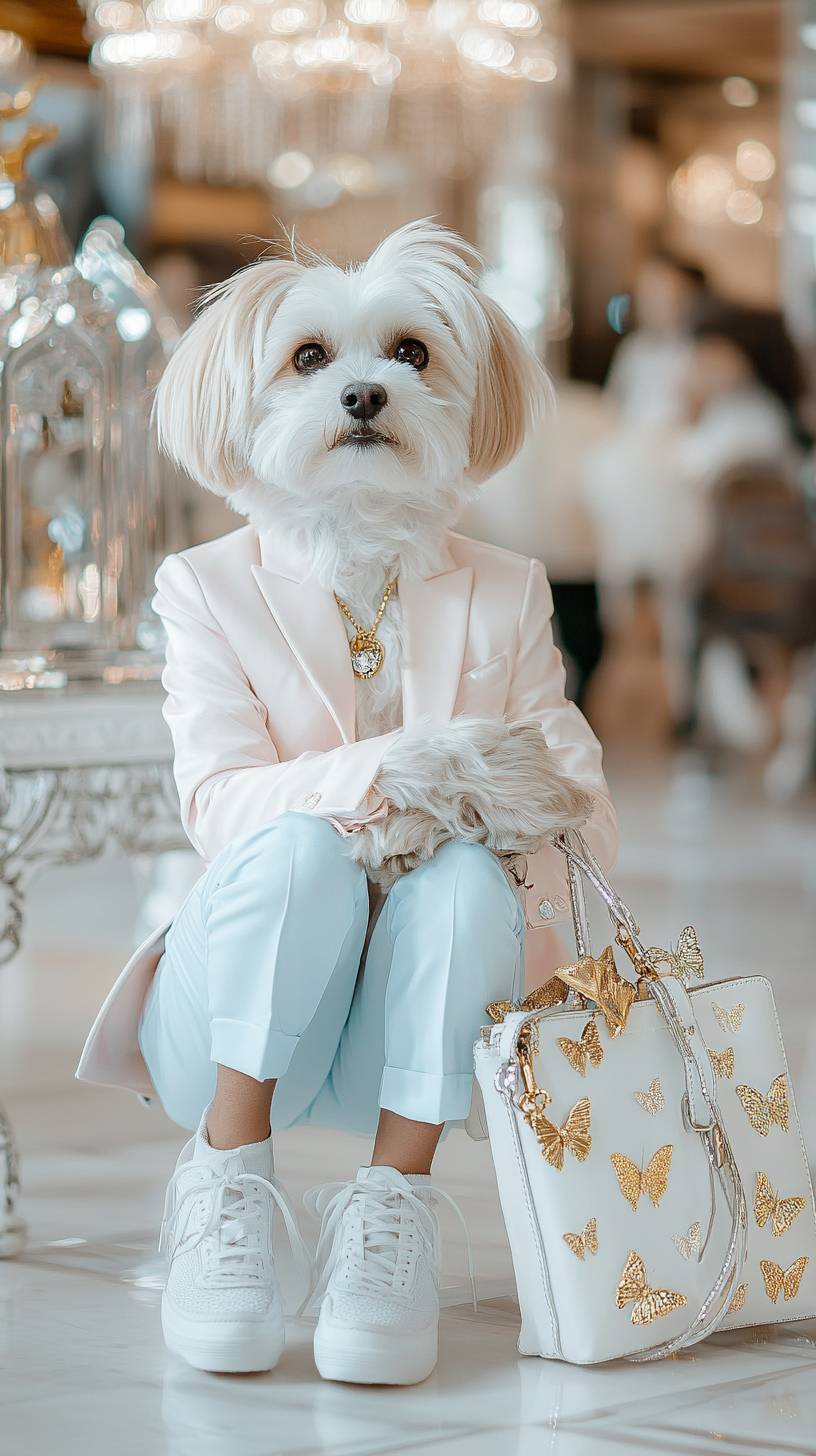 Cute anthropomorphic maltese dog with stylish haircut, in pink and blue suit, wearing white sneakers with golden butterfly and holding designer bag with golden butterfly on the store floor of Paris fashion brand shop with exquisite interior --ar 9:16 --style raw --personalize pj9b4ls --stylize 750 --v 6.1