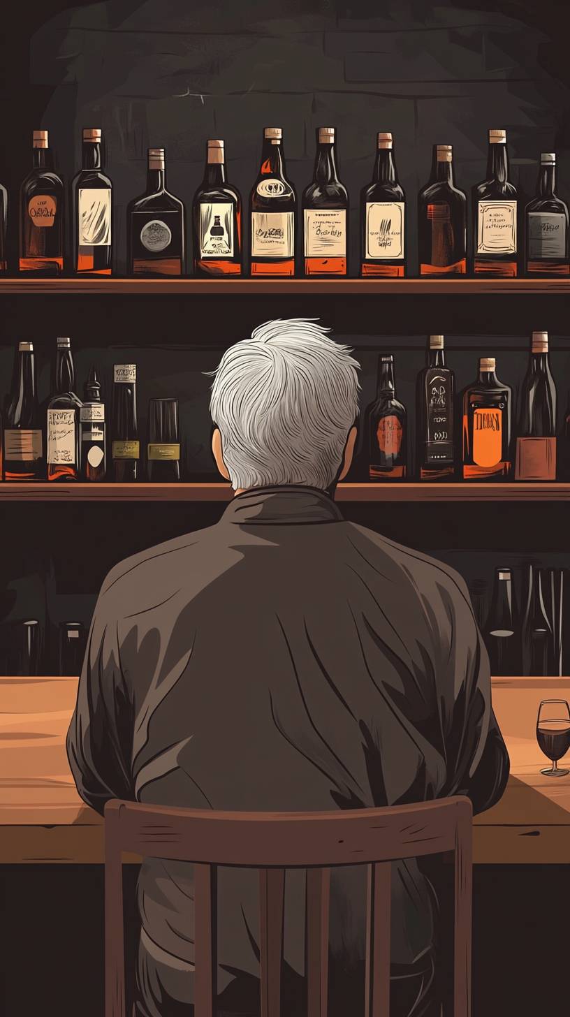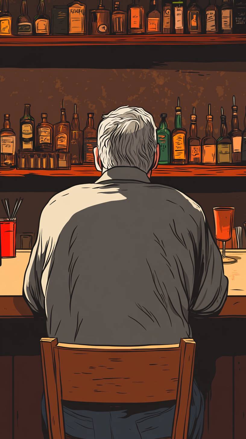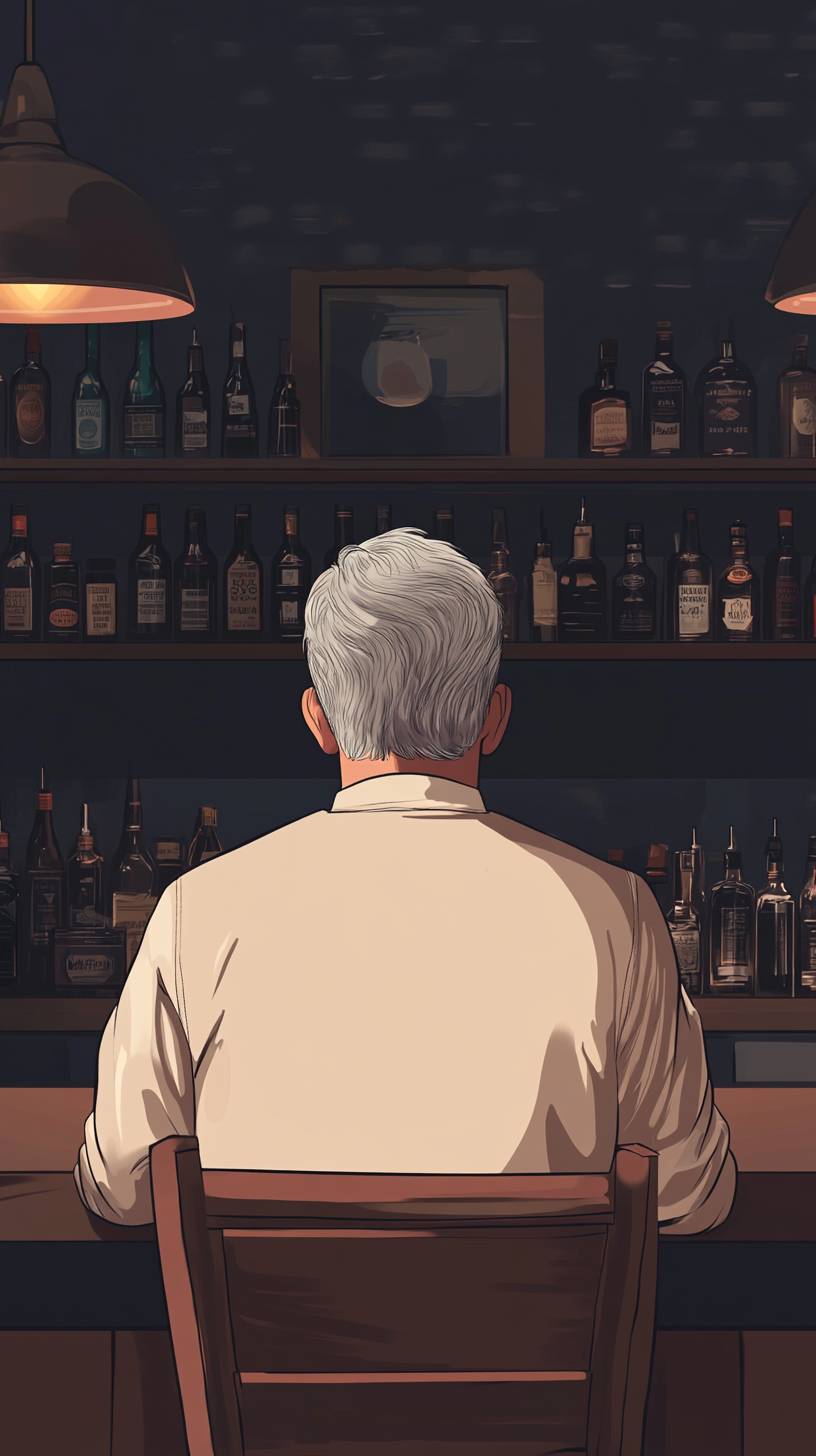 Седой мужчина сидит за барной стойкой, вид сзади, в стиле мультфильма.