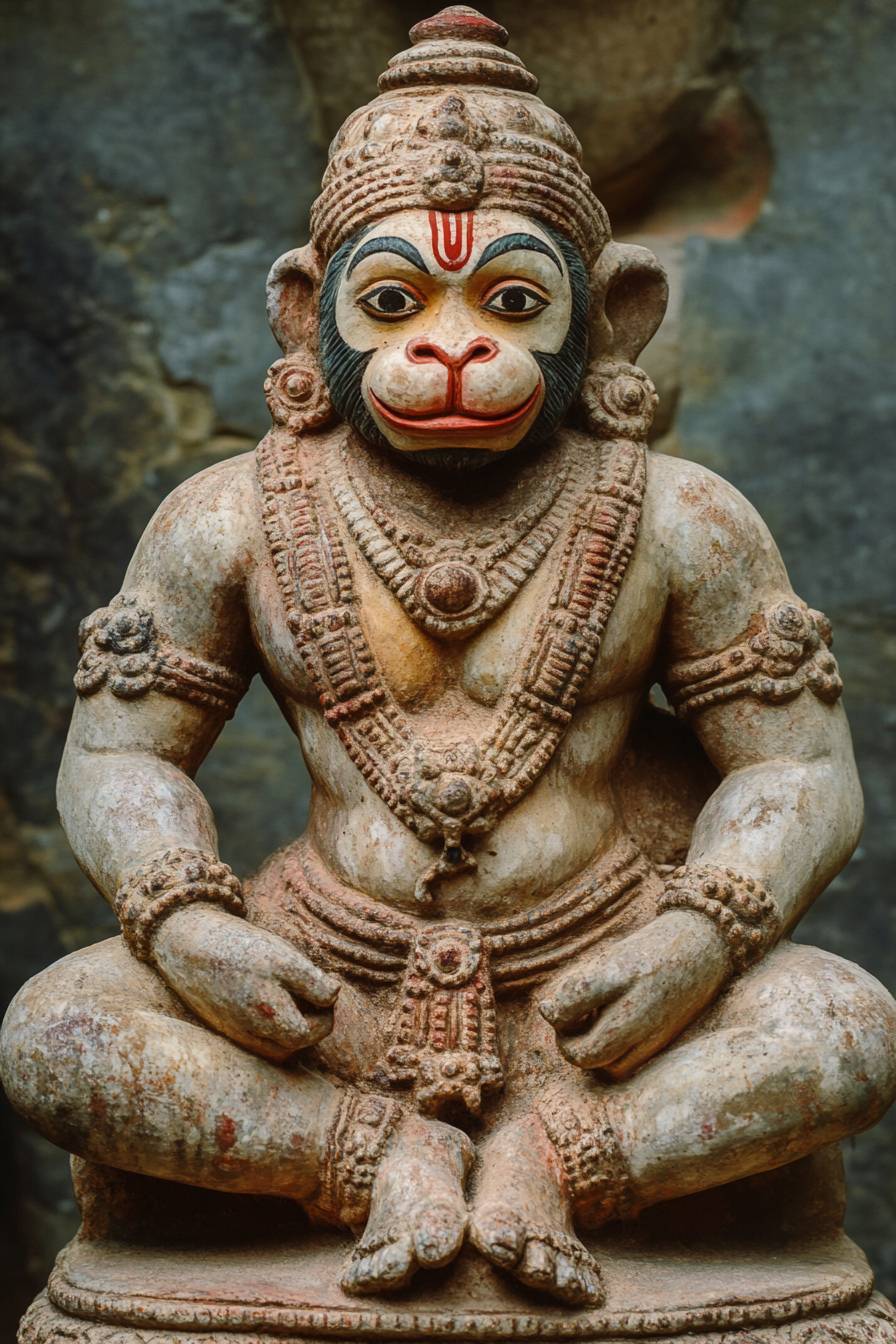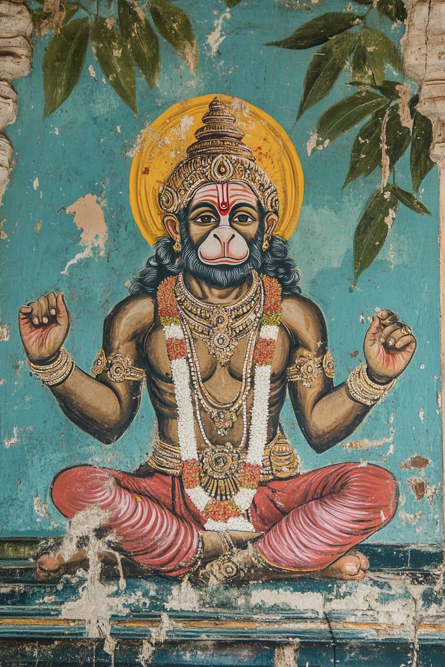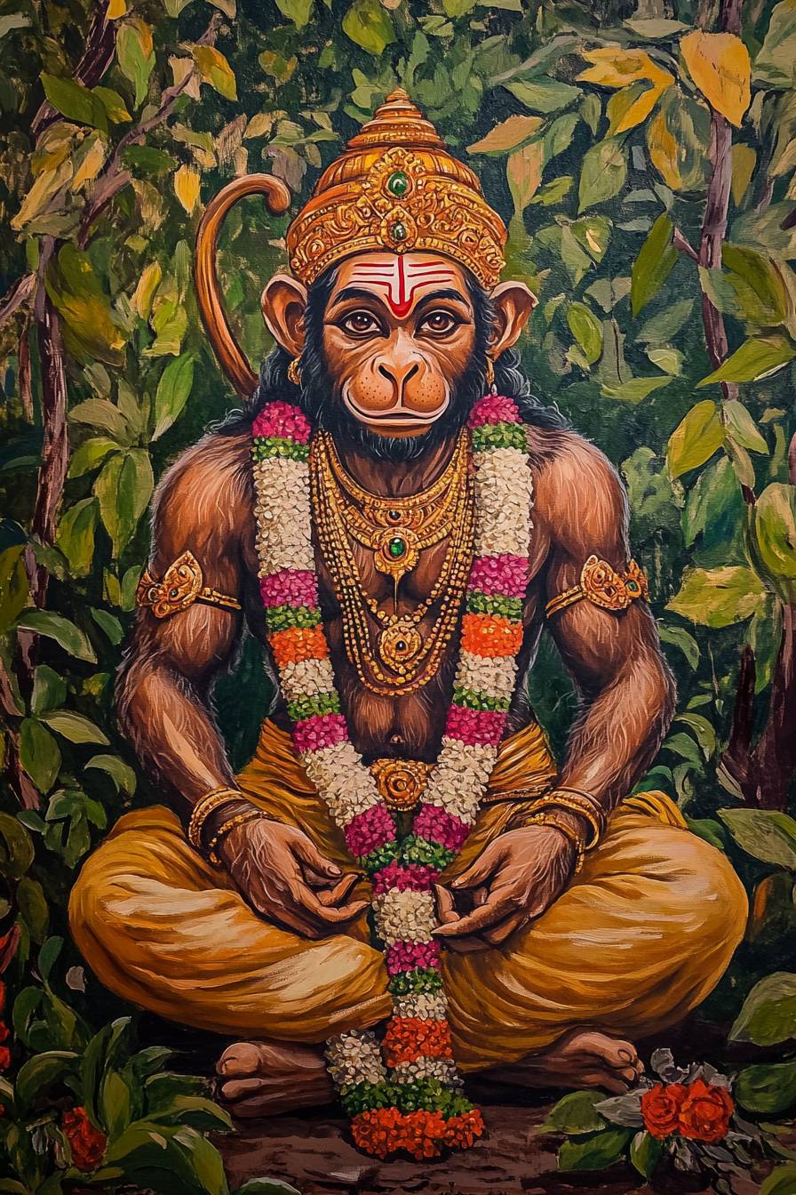 Индийский стиль искусства Бхил из Мадхья-Прадеш, изображающий Господа Ханумана на фоне зелени.