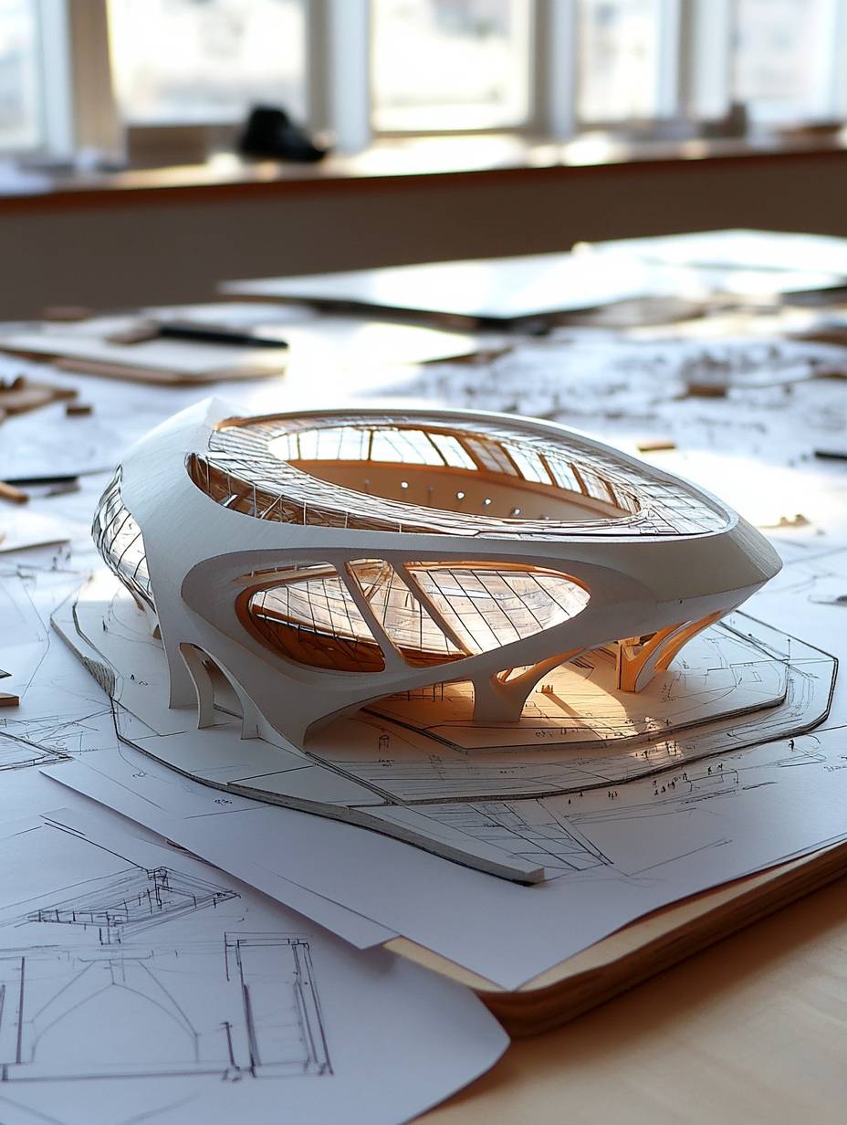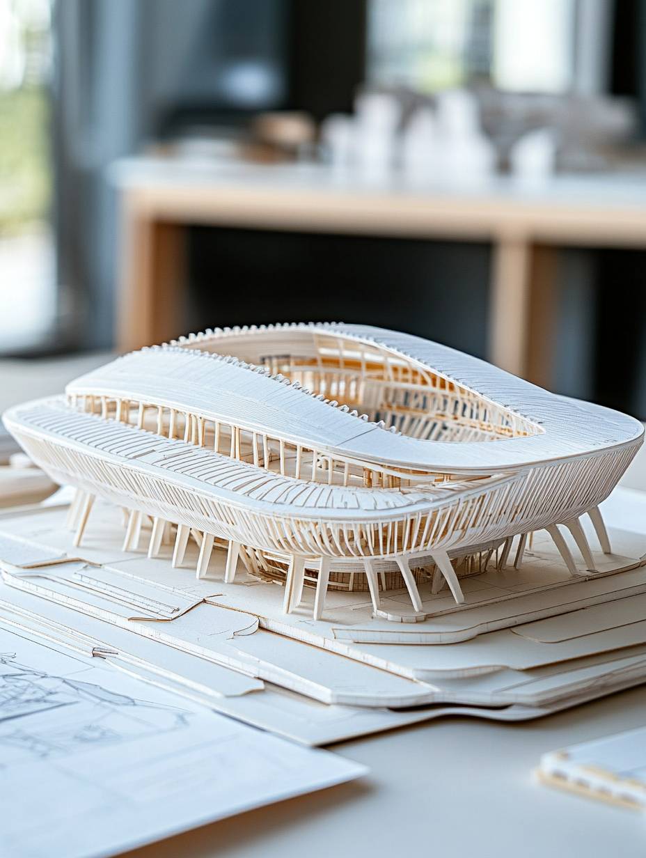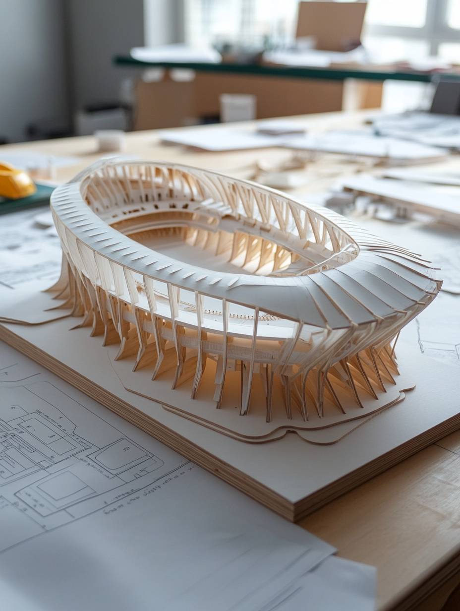 Модель современного футуристического стадиона, полностью изготовленная из белого материала, с верхним видео, модель на столе, окруженная архитектурными чертежами, в стиле прямых линий, спроектирована Норманом Фостером. Модель незавершенная, все сделано из дерева, архитектурные чертежи вокруг с острыми линиями.