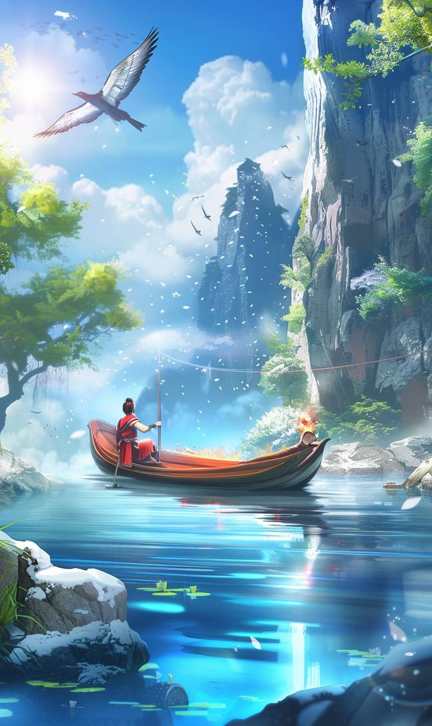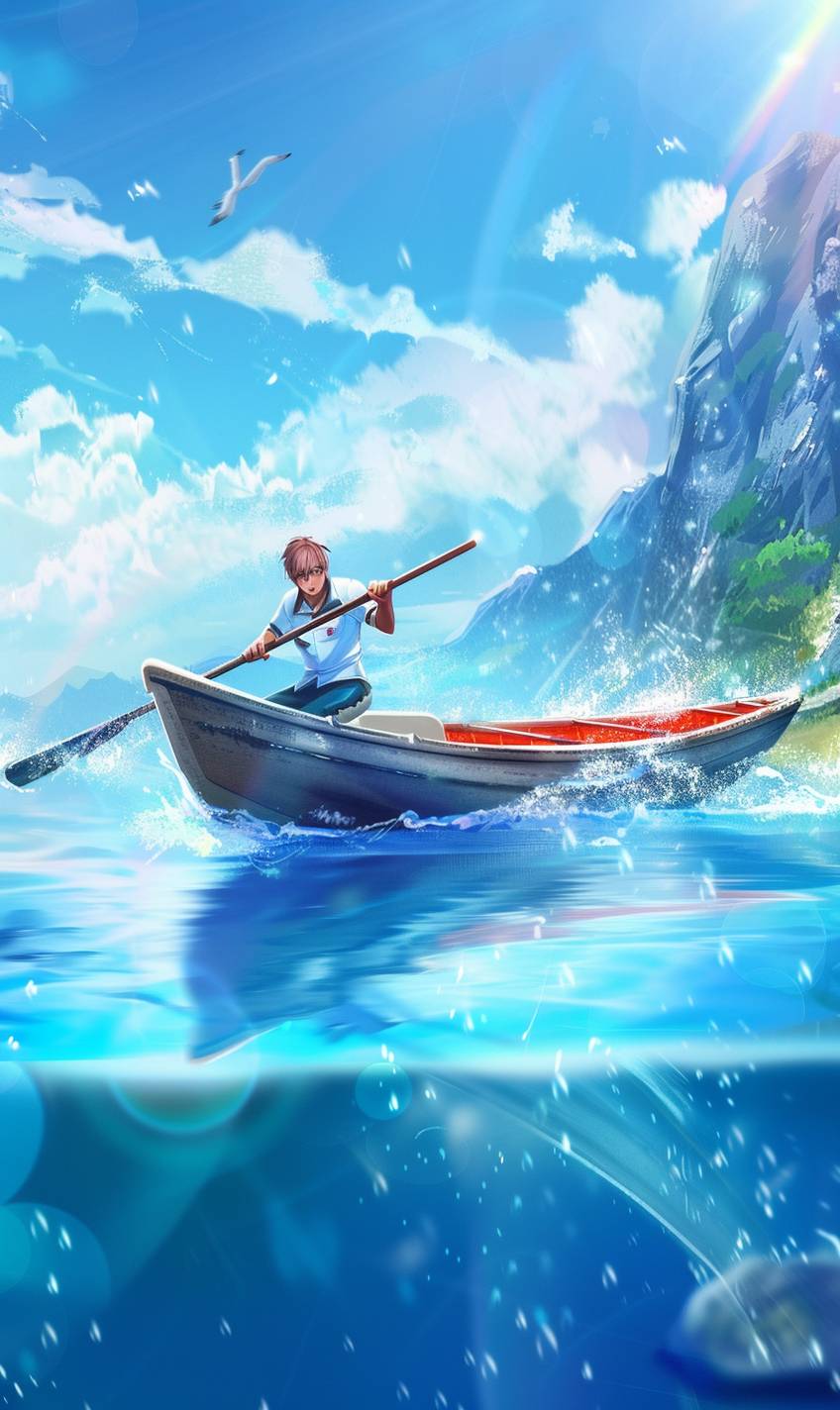Хироши гребет на лодке на спокойном озере.