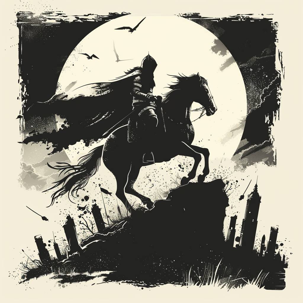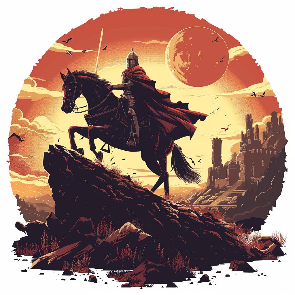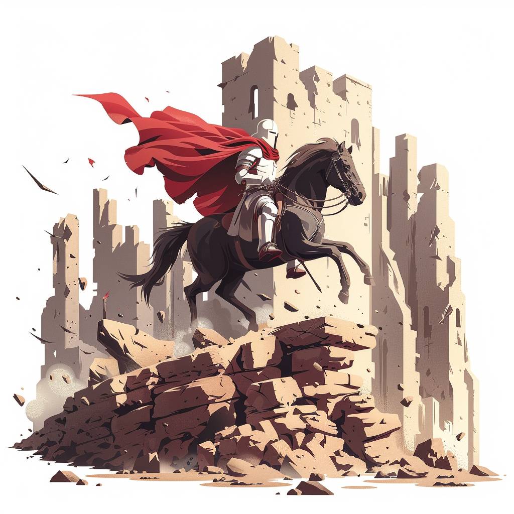 Simple flat vector illustration of a medieval warrior on horseback, fiercely charging across a rugged battlefield surrounded by ancient ruins, isolated on a white background. --stylize 250 --v 6.0