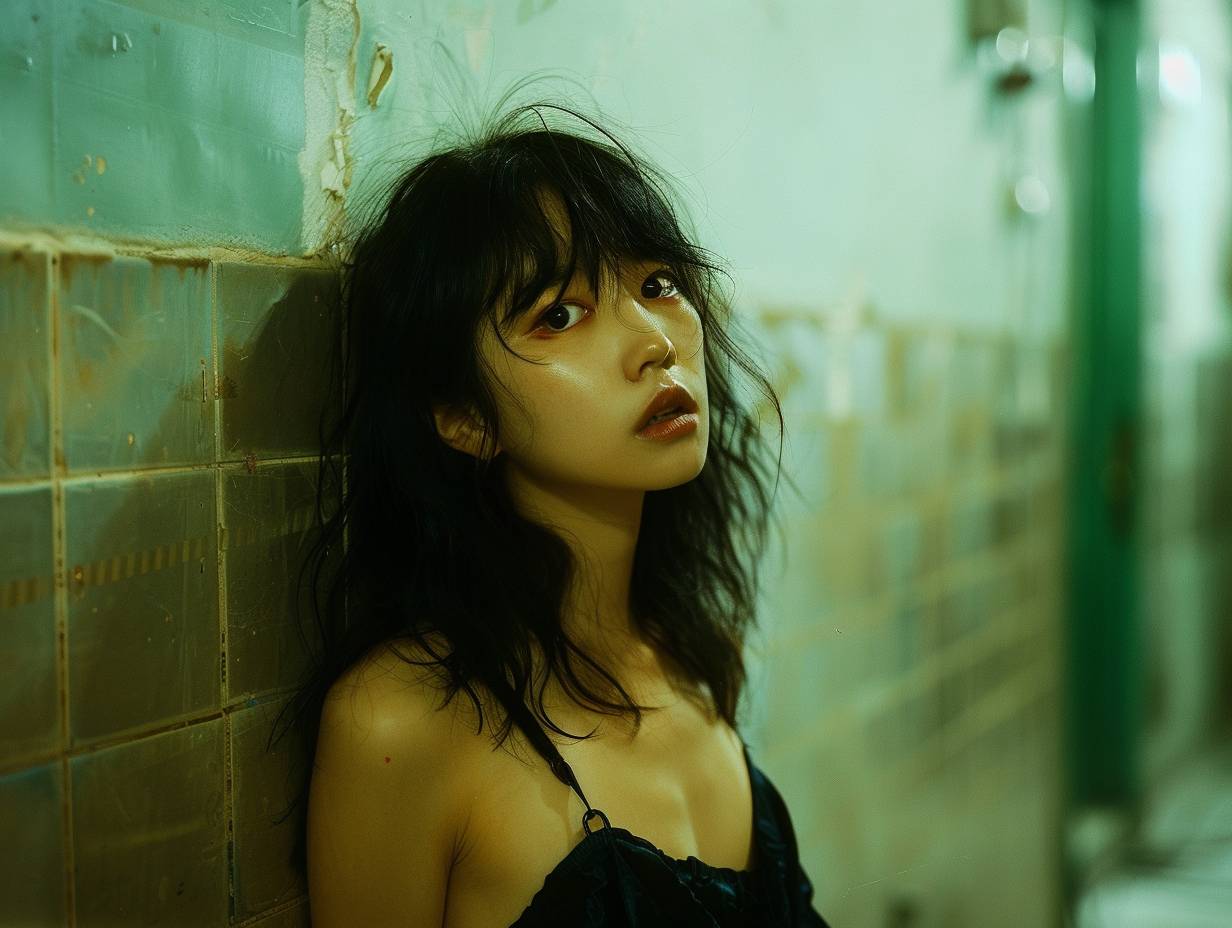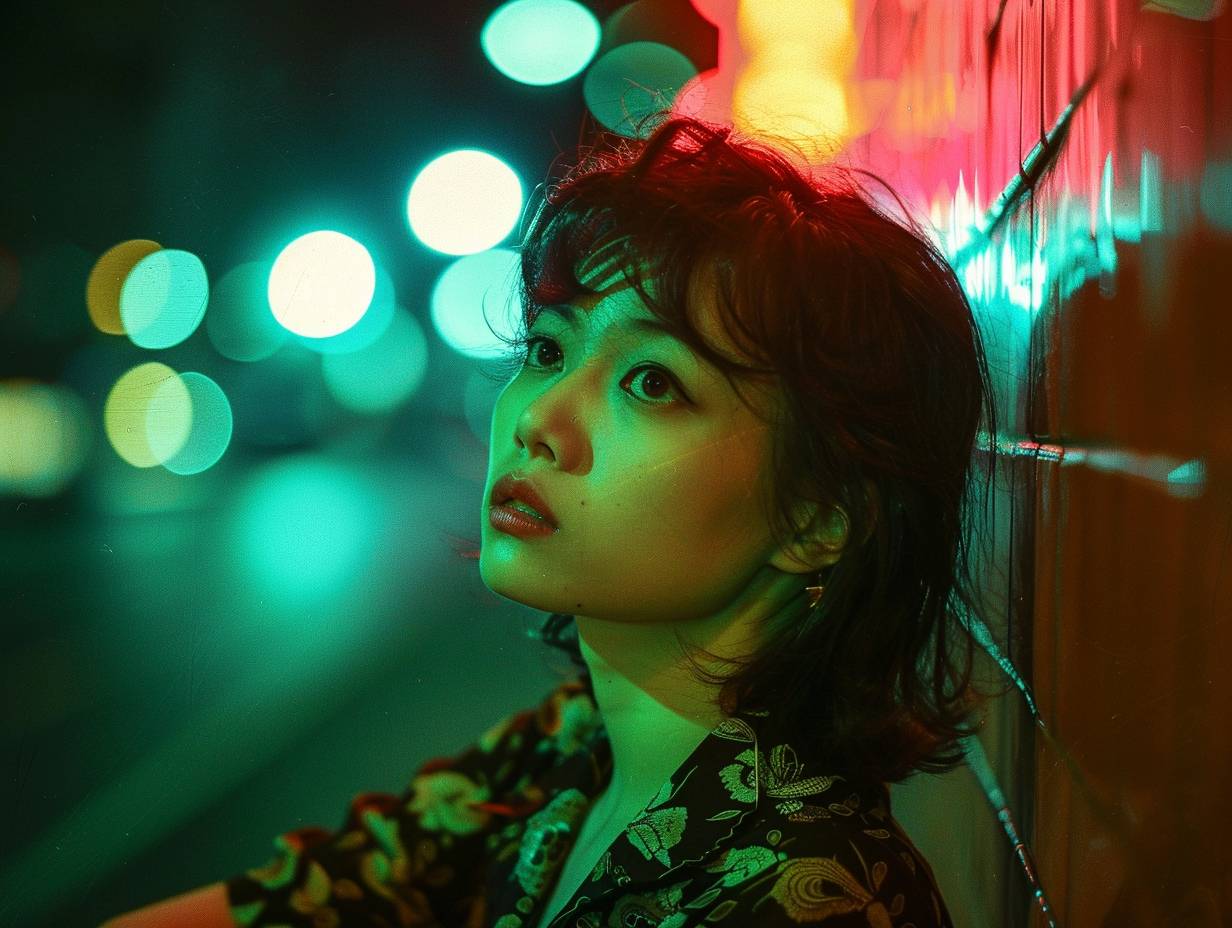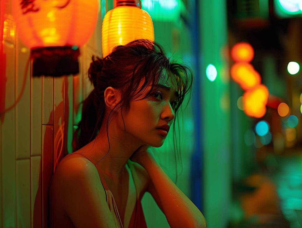 Фильм в стиле Уонг Кар Вая, молодая женщина в замешательстве смотрит вбок