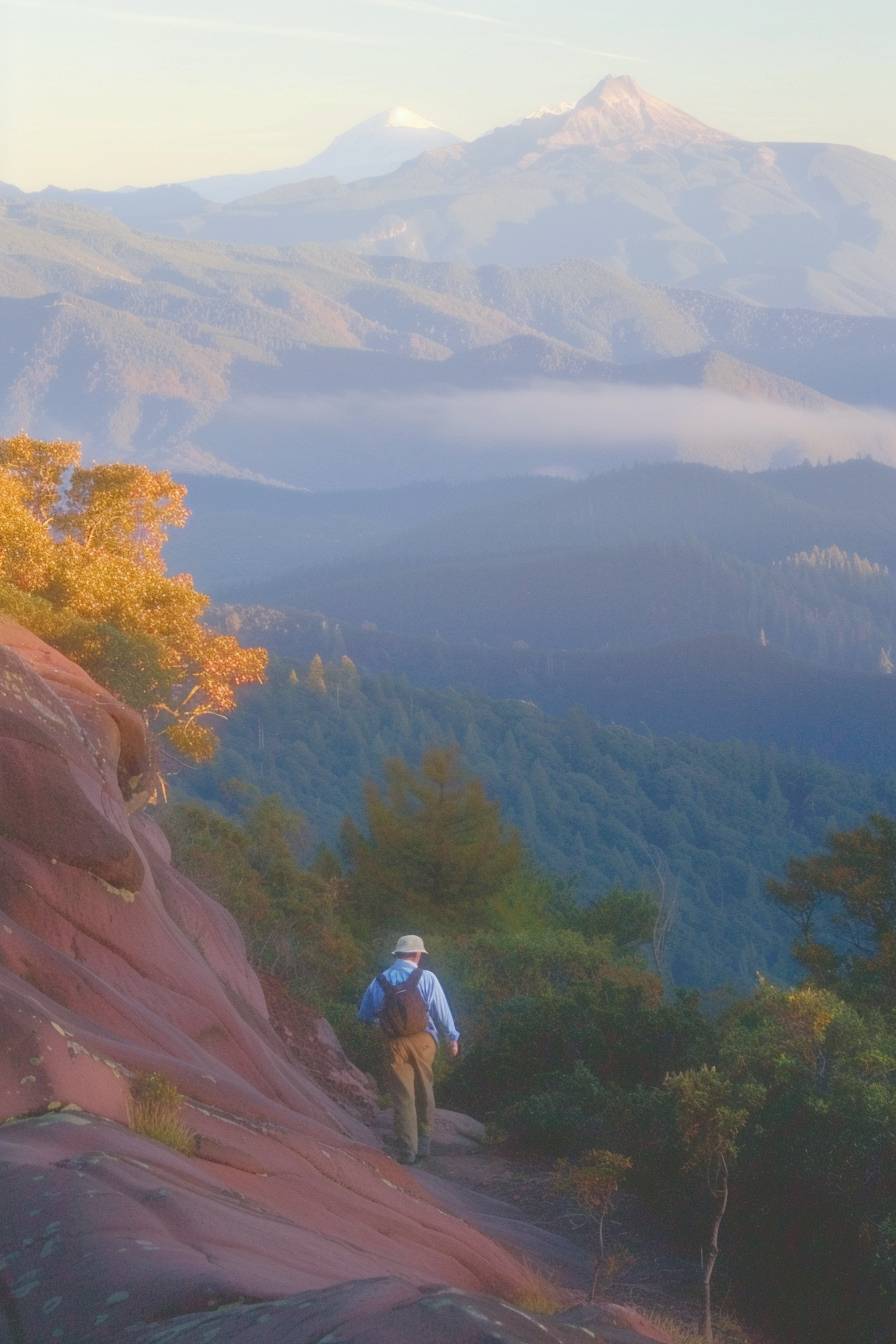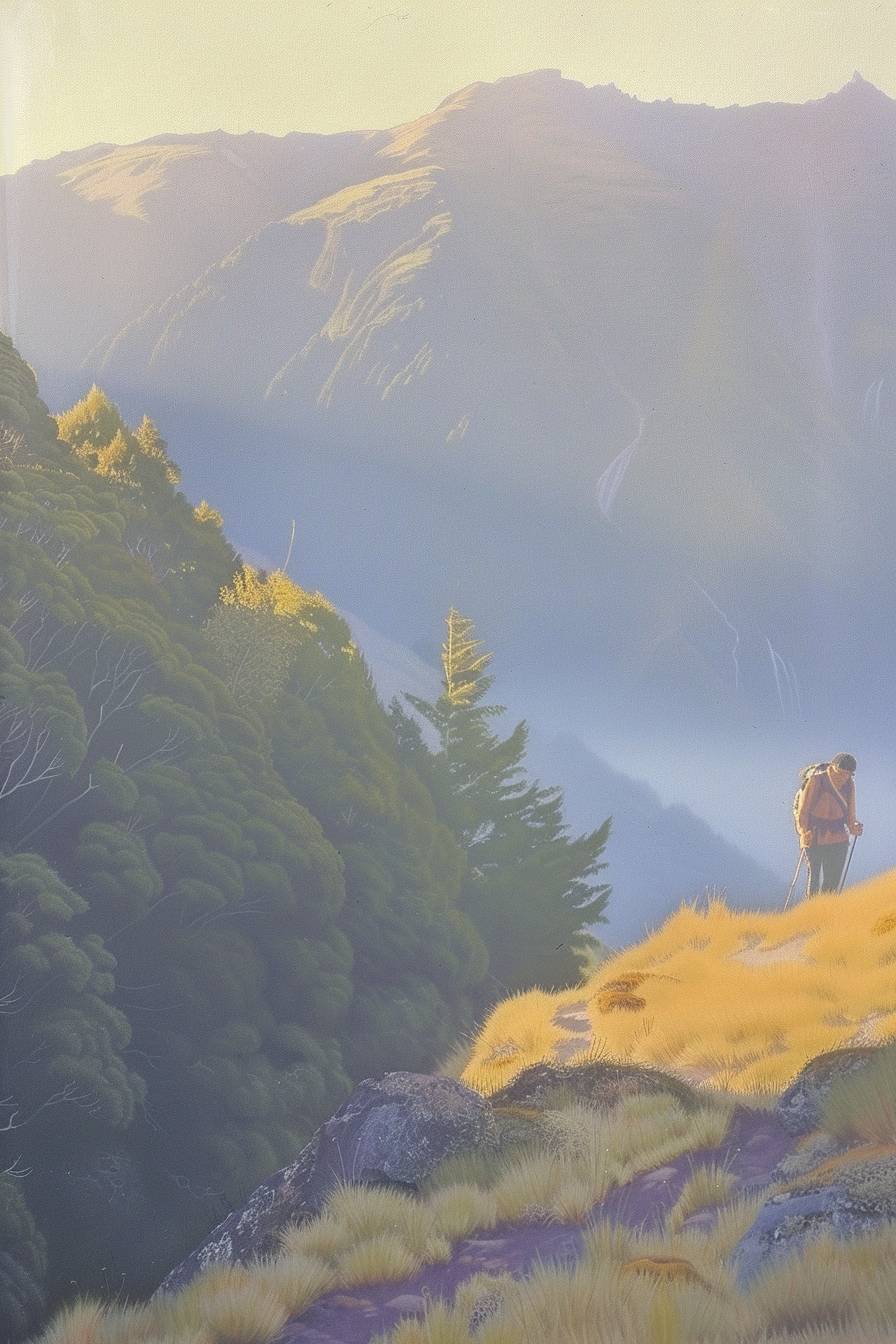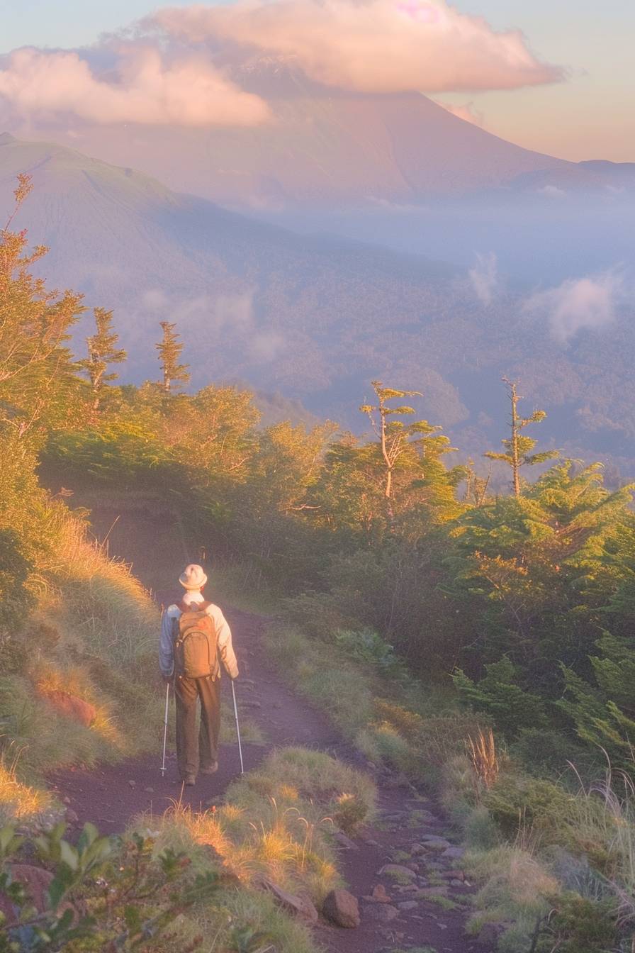 Юто идет в поход по горной тропе.