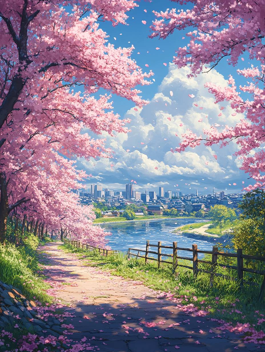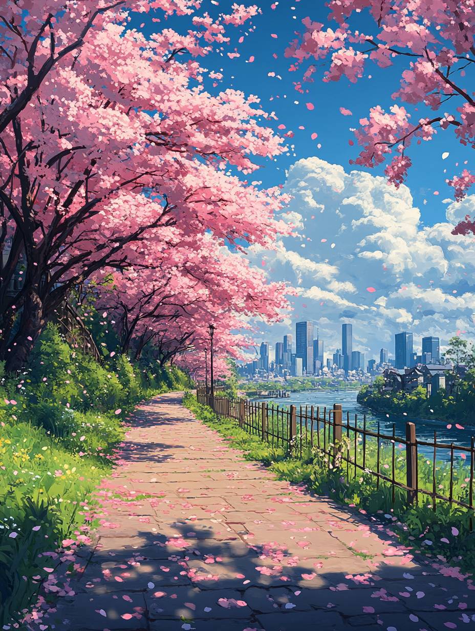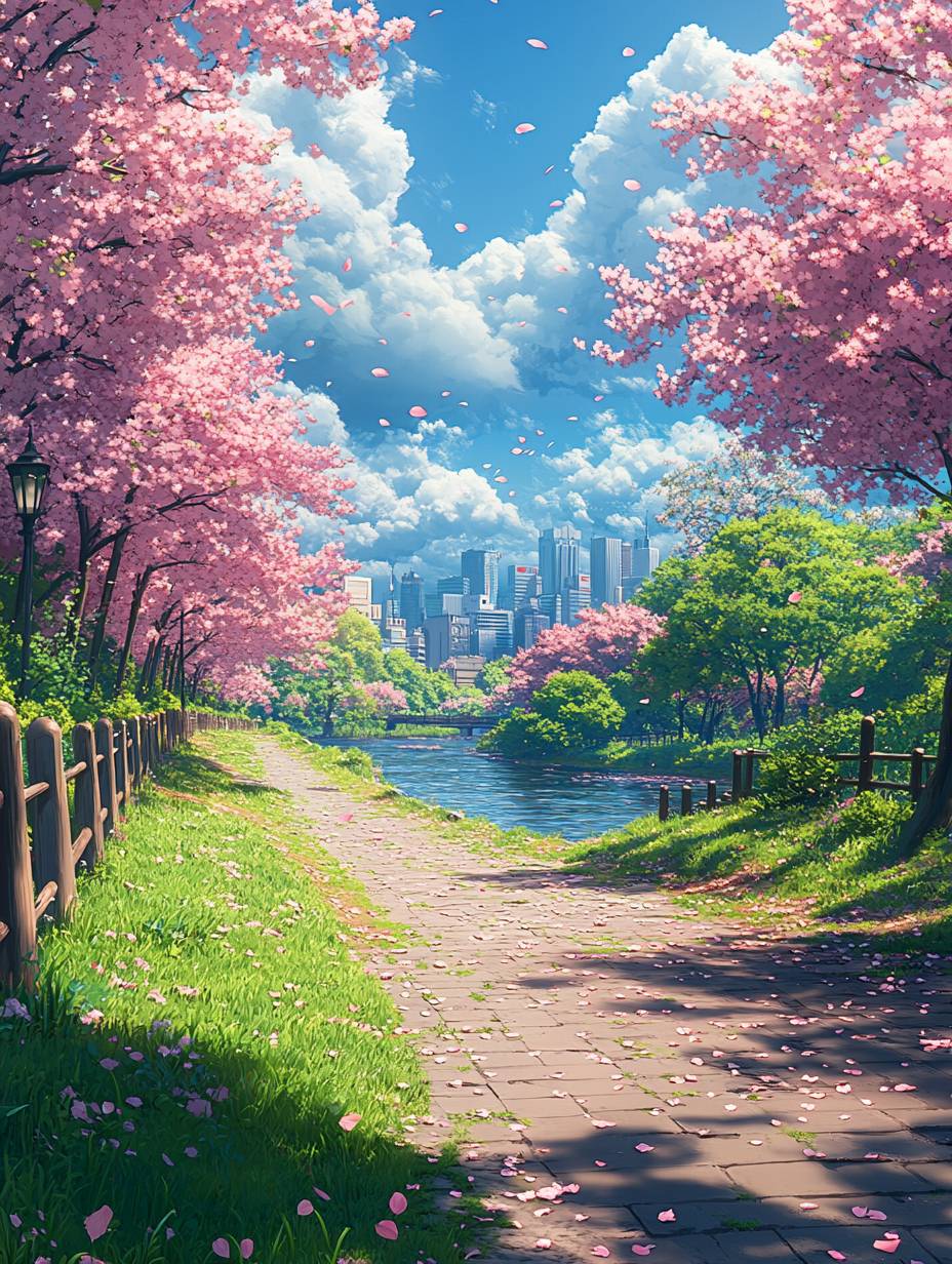 A beautiful park with cherry blossom trees, blue sky and white clouds, city skyline in the distance, green grass on both sides of the path, light pink petals falling from the tree branches, a small fence along the riverbank, in the style of anime art, vibrant colors, a digital painting, high resolution. --ar 3:4 --stylize 750 --v 6.1