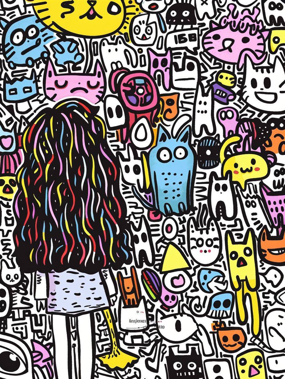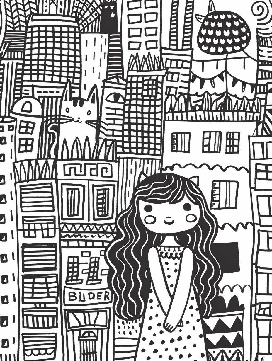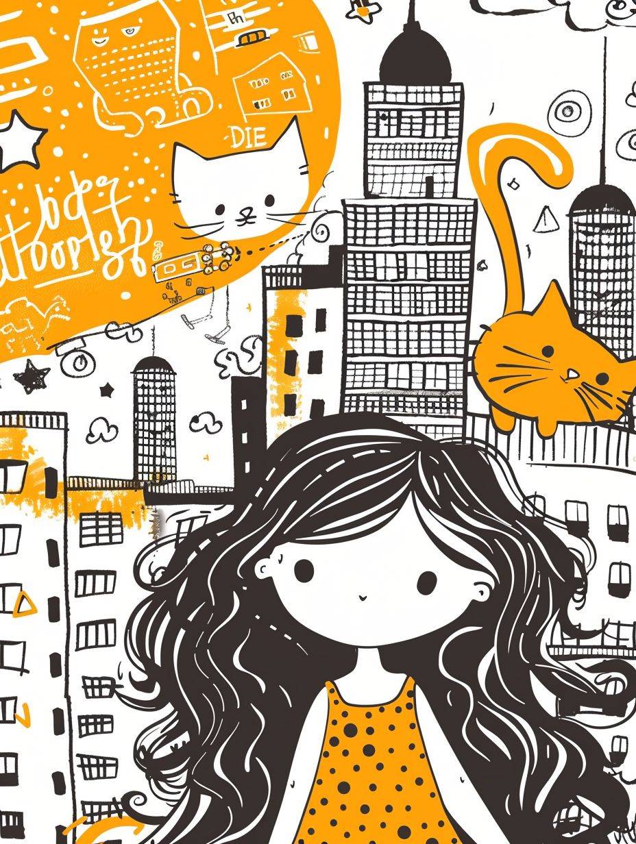 A cute little girl and a giant cat, Girl with long curly hair standing on the road of the city, Full frame cute doodle art, Keith Haring, Cute color scheme, White background, Simple strokes, anthropomorphic, cute, doodle in the style of Keith Haring, sharpie illustration, bold lines, in the style of grunge beauty, mixed patterns, text and emoji installations, Rock girl style, Illustration style, MBE illustrations, Perfect detail, High quality --ar 3:4