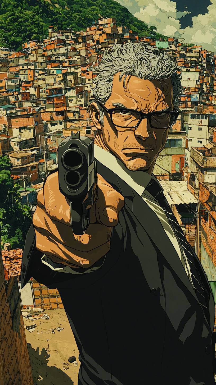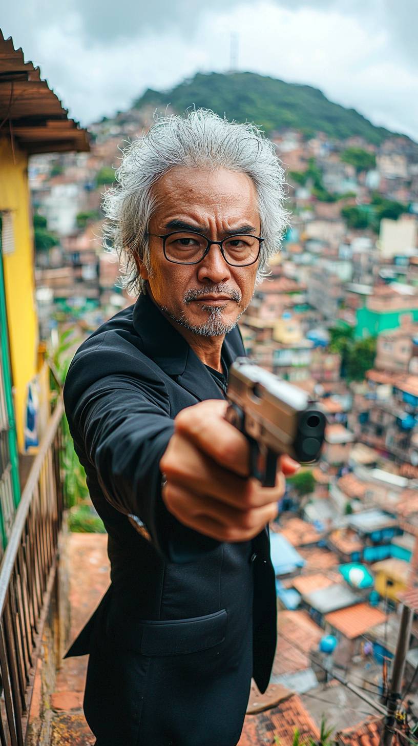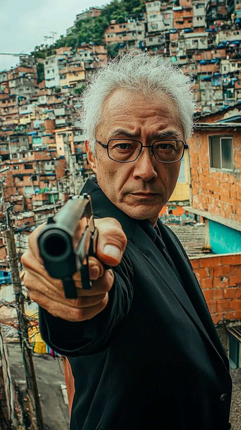 by Katsuhiro Otomo, photo of slim man with grey hair and glasses wearing a black suit, holding gun in hand ,with the other hand is in his trouser pocket, pointing the barrel to camera, with the background of a favela in Rio de Janeiro --ar 9:16 --quality 2 --stylize 250 --v 6.1