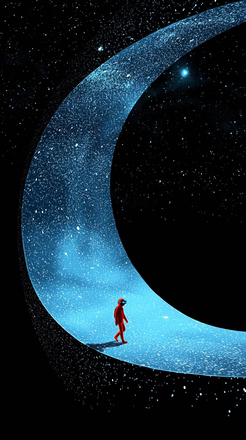 Небольшой красный человек в AR-гарнитуре идет по огромной синей ленте Мёбиуса, плавающей в черном пространстве, в стиле обложки альбома GENESIS 70-х годов.