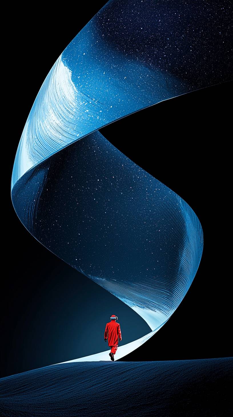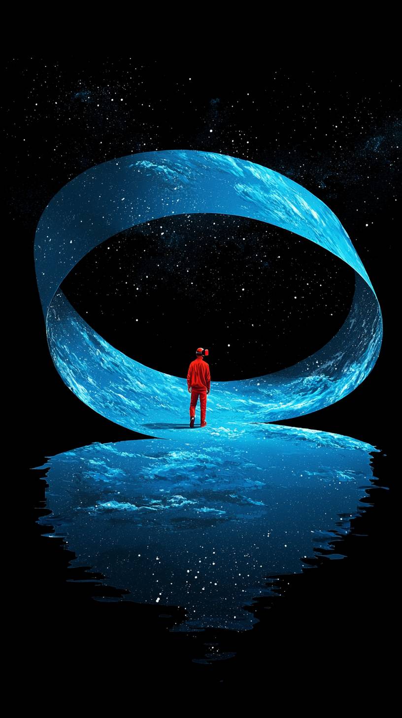 A small red man wearing an AR headset is walking through a huge blue sky Möbius strip floating in black space. In the style of the 70s GENESIS album cover --ar 9:16 --quality 2 --style raw --stylize 250 --v 6.1