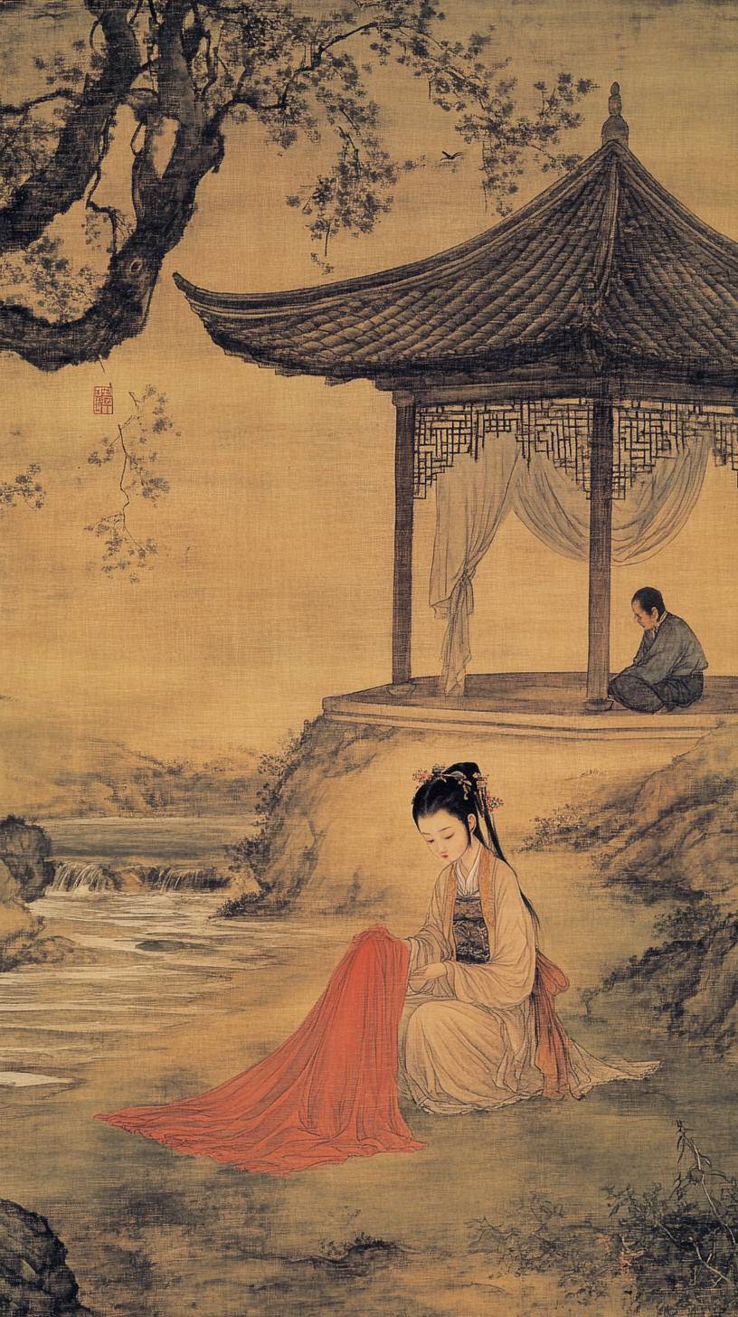 В традиционной китайской сцене девушка в традиционной одежде династии Сун сидит у маленькой реки и стирает красный шелк в руках. Маленький поток извивается из верхней части картины. В открытом пространстве над картиной находится большое дерево, рядом с которым сидит мужчина. Рядом с девушкой расположен павильон с шелковыми занавесками, развевающимися на ветру. Картина выполнена в стиле ручной росписи с тонкими деталями и высоким разрешением.