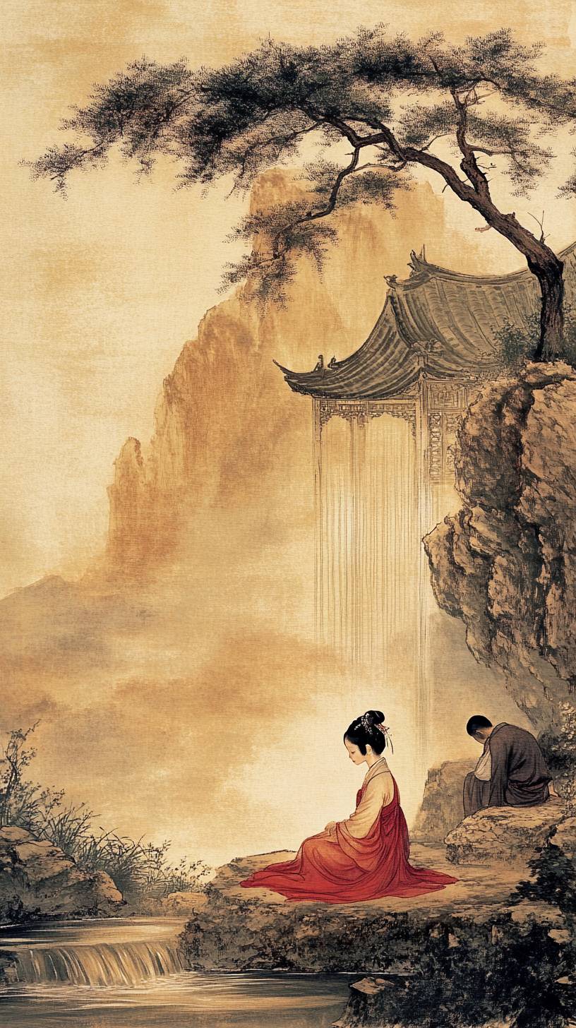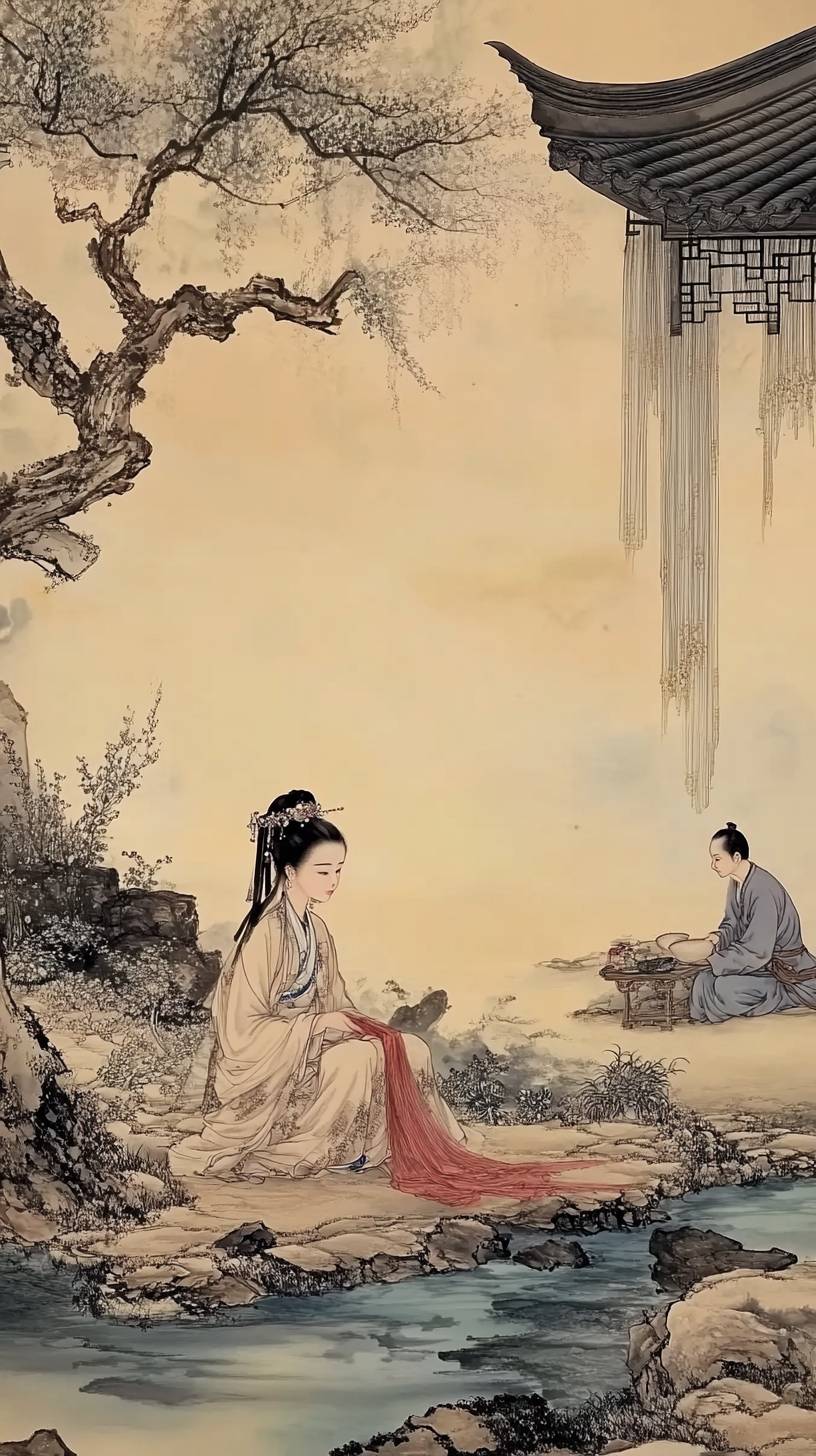 In a traditional Chinese-style scene, a girl dressed in traditional Song Dynasty clothing sits by a small river, washing the red silk in her hands. A small stream winds down from the top of the picture. In the open space above the picture, there is a large tree, beside which a man is crouching. Next to the girl is a pavilion with gauze curtains fluttering in the breeze. The picture is in a hand-painted style, with intricate details and high definition --ar 9:16 --v 6.1