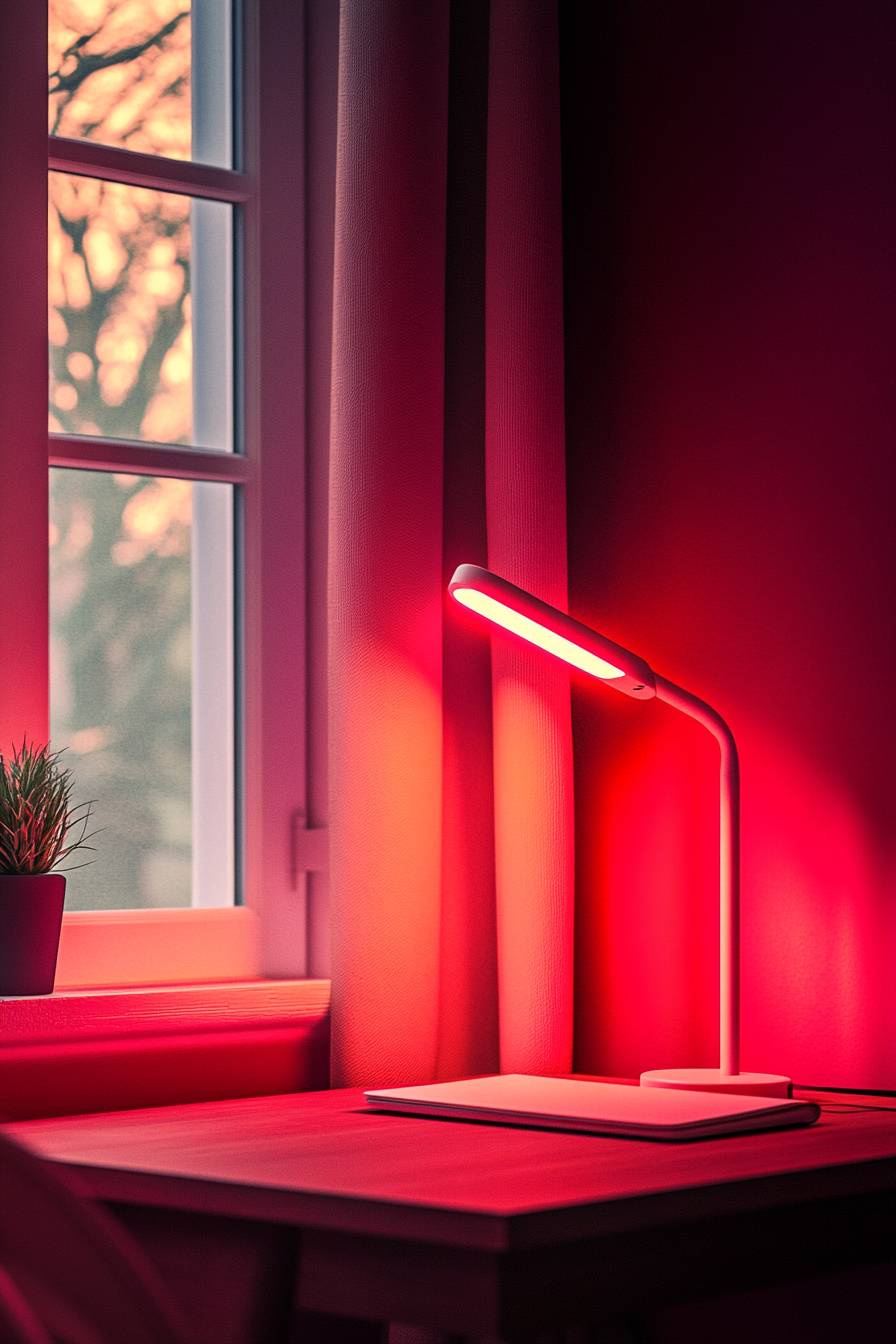 Product photography, interior scene with a desk lamp on the table, a simple desktop in dark red and pink tones, the desk lamp illuminating a notebook on top of the wooden furniture, a window on the side, the desk lamp casting a soft light, the product details are clear, a close-up view, a depth of field effect, high-resolution photography, indoor lighting, and a warm atmosphere. The overall color tone is mainly dark red and pink, creating an elegant style in the style of the artist. --ar 85:128 --iw 2 --v 6.1