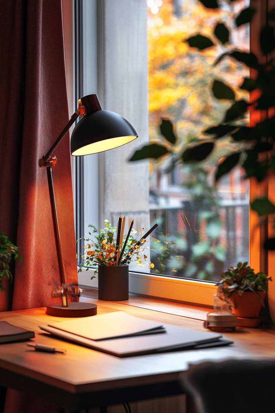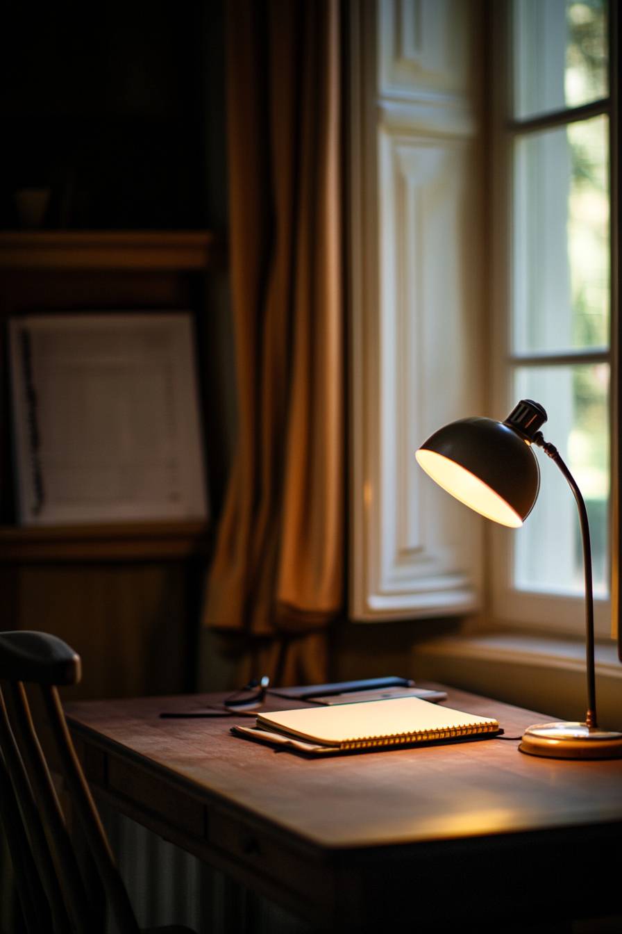 Элегантная интерьерная фотография с настольной лампой, освещающей блокнот.