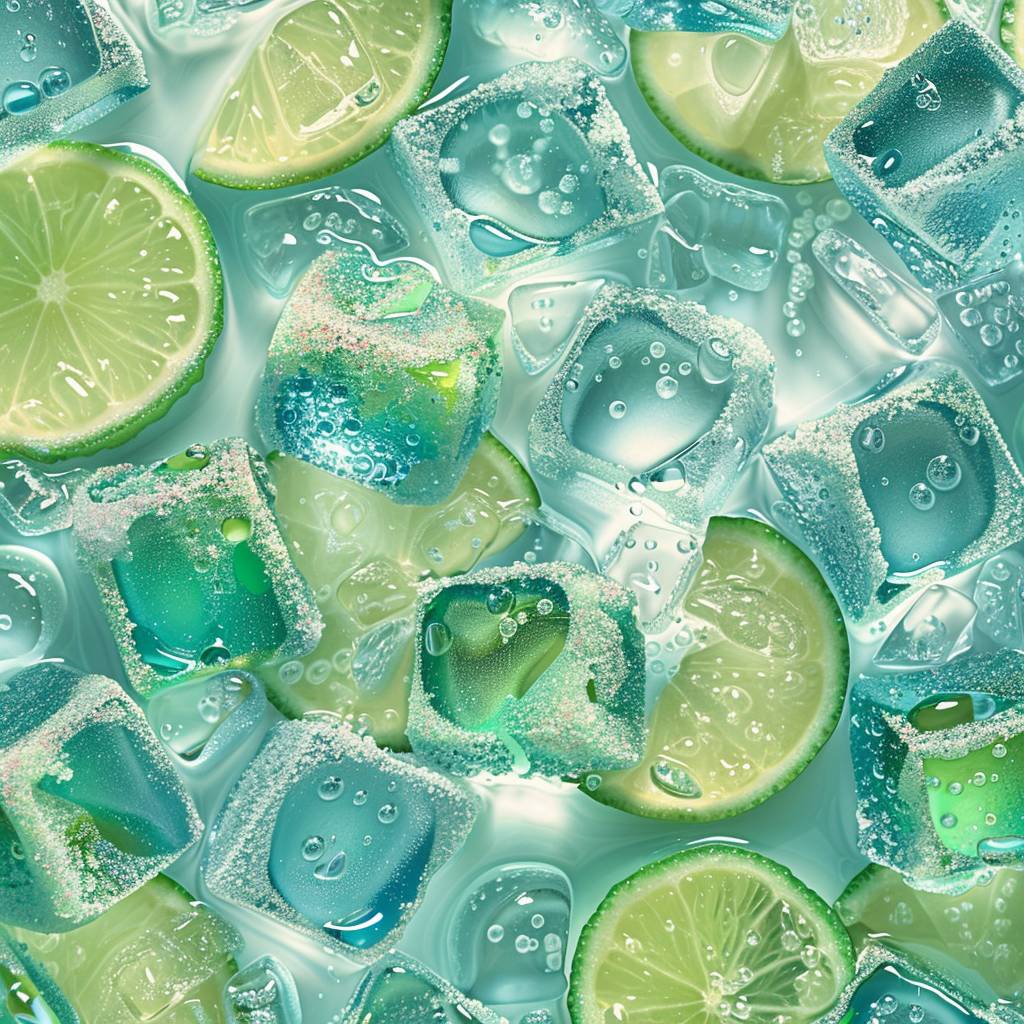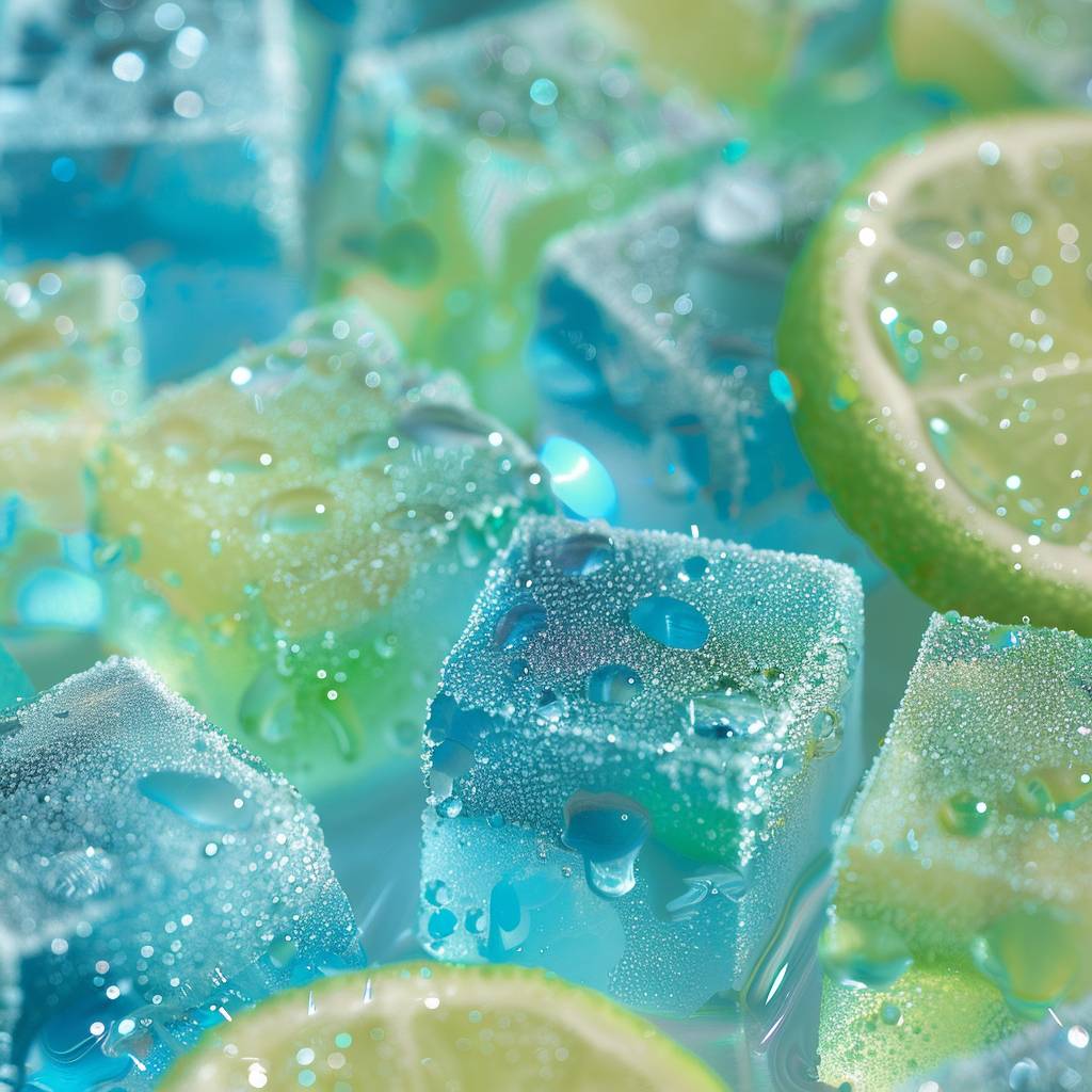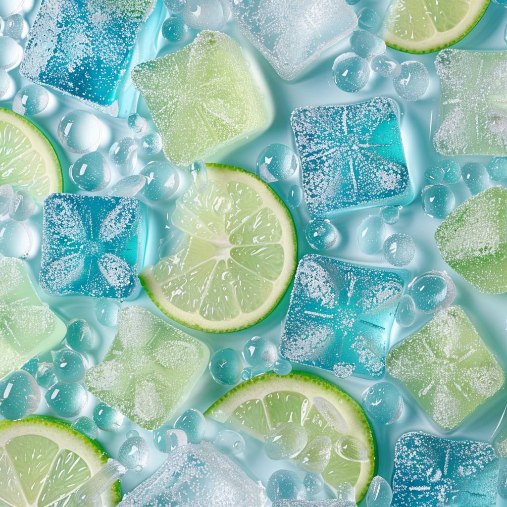 Close-up of blue and green gummy candy ice cubes, lime slices, and water drops glittering to form an artistic pattern. The background is in soft pastel tones, creating a tranquil atmosphere for a candy themed wallpaper. High resolution, high quality --ar 1:1 --v 6.0