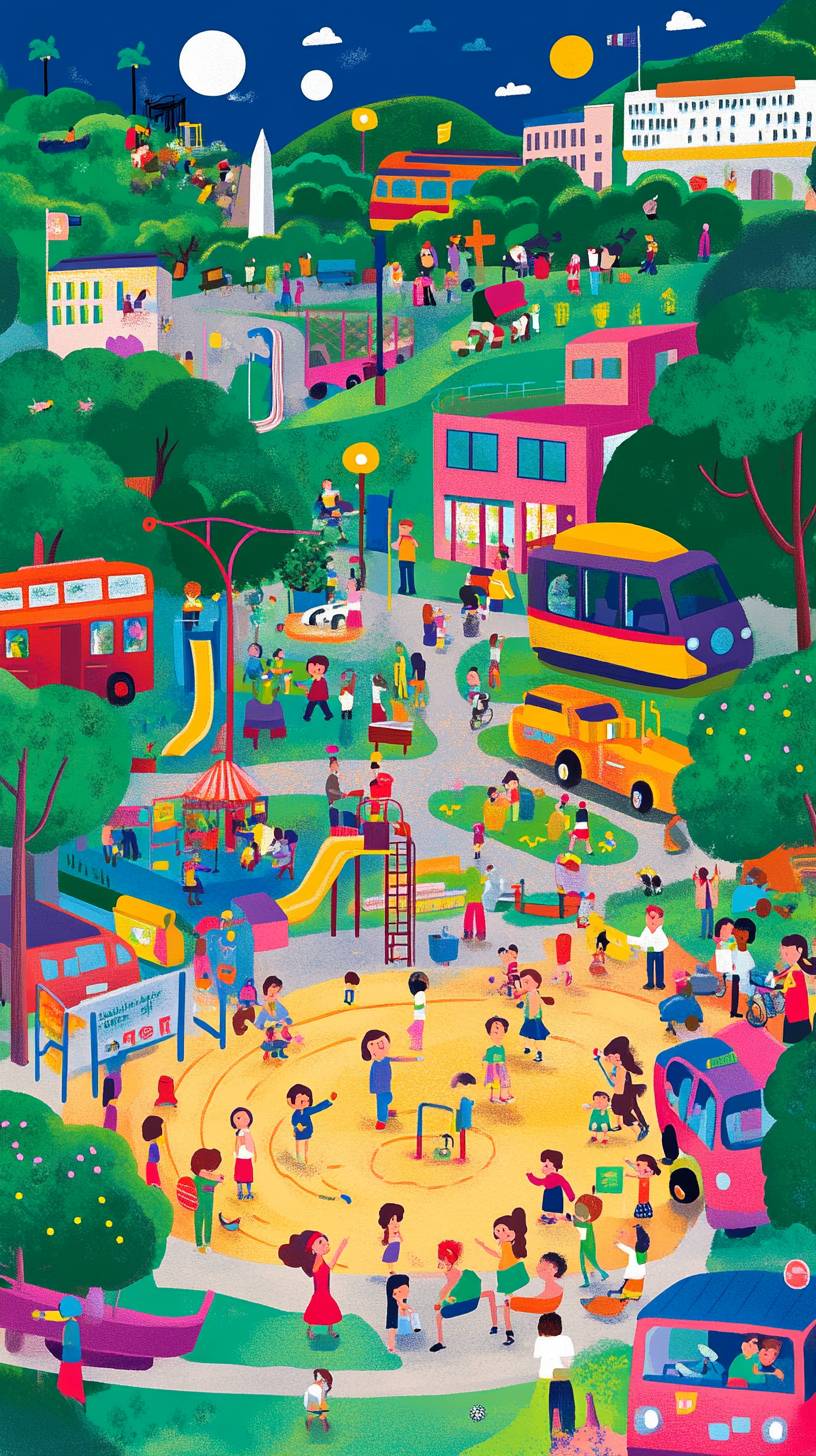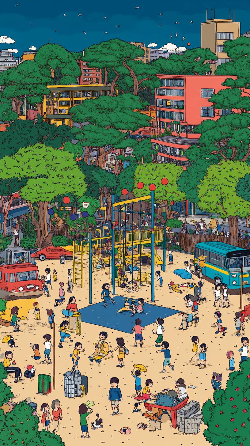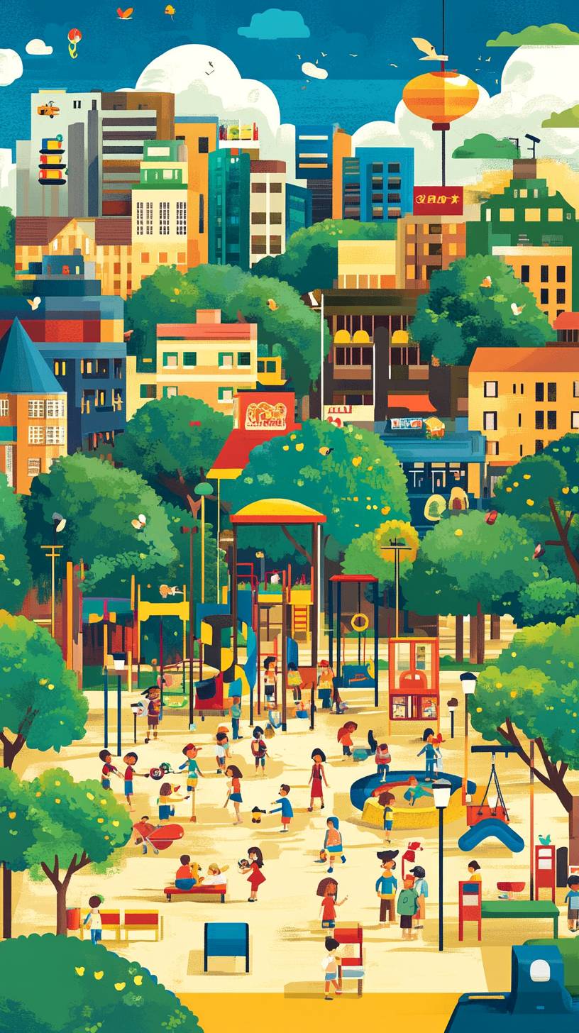 A vibrant and colorful illustration of the school playground, filled with various characters engaged in different activities like playing sports or having fun on sunny days. The background features trees, buildings, vehicles such as cars, buses, boats, street lights, and people walking around. In the style of Hiroshi Nagai,32K,high definition, ultra high definition, --ar 9:16 --v 6.1