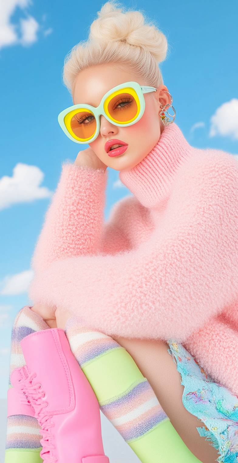 super high fashion boots, neon pink, neon blue, neon yellow, neon green, a blond supermodel posing outside on a sunny day, extreme close up shot, wearing a cool super high fashion trendy mohair sweater, skirt, striped socks, super high fashion boots, high fashion makeup, super curly long black hair, 90s hairband, oversized print sweatshirt, high end fashion editorial vibe --ar 49:95 --style raw --personalize wbjzr65 --stylize 1000 --v 6.1