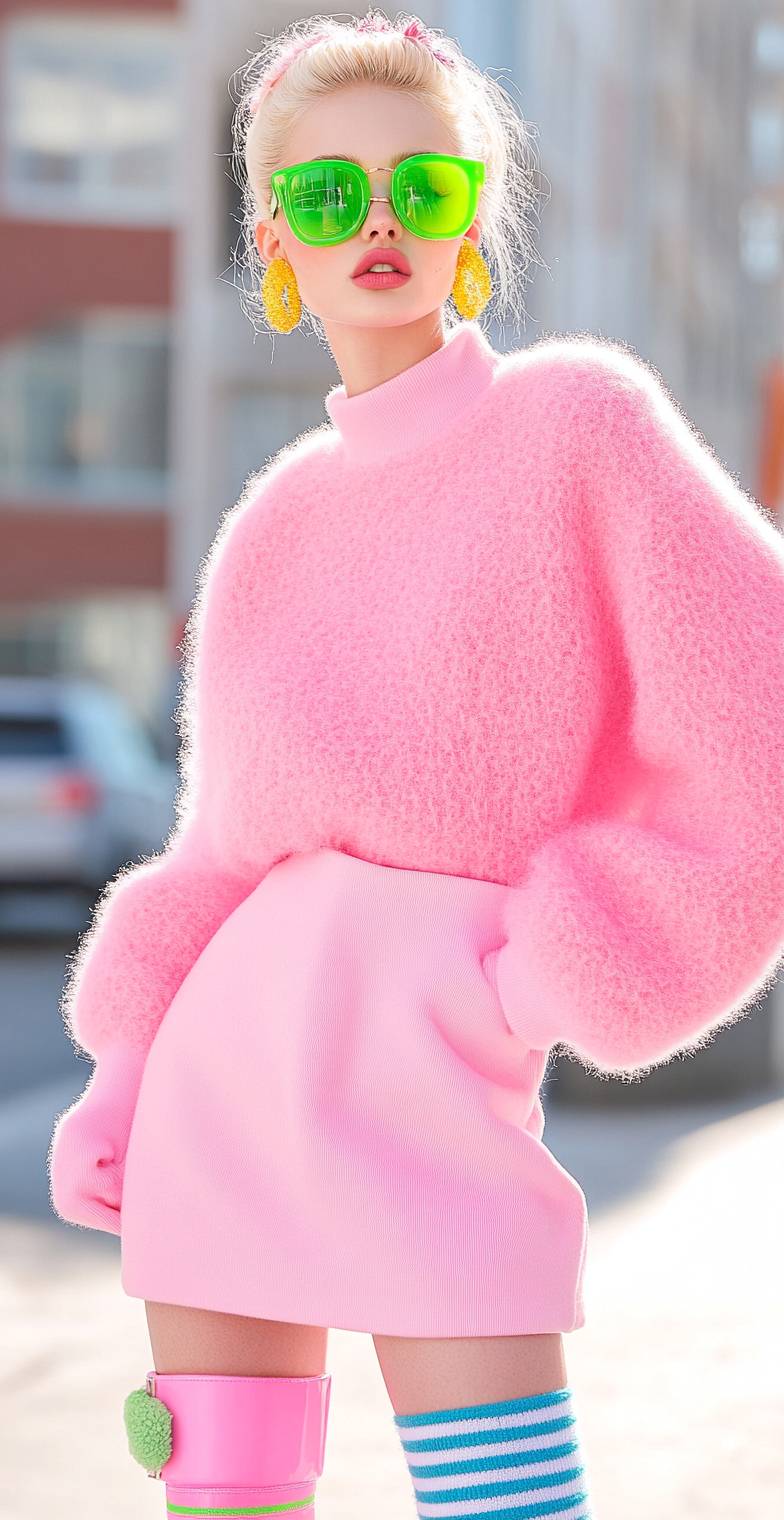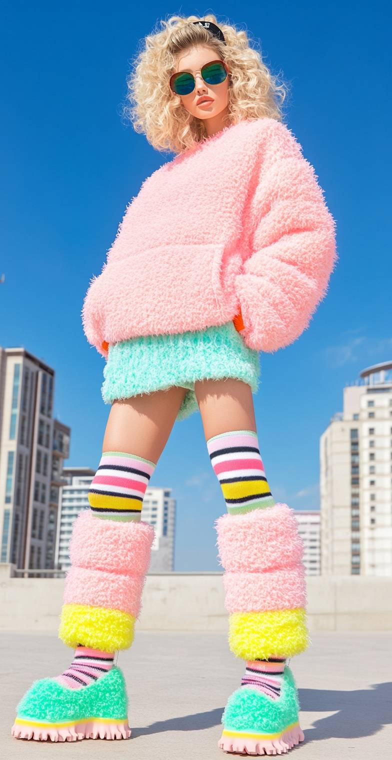 Супер стильные ботинки, неоновый розовый, неоновый голубой, неоновый желтый, неоновый зеленый, блондинка-супермодель позирует на улице в солнечный день, кадр крупным планом, одета в крутой модный свитер из мохера, юбку, полосатые носки, супер стильные ботинки, макияж в стиле высокой моды, супер кудрявые длинные черные волосы, повязка 90-х, свитшот большого размера с принтом, атмосферное редакционное настроение высокой моды.