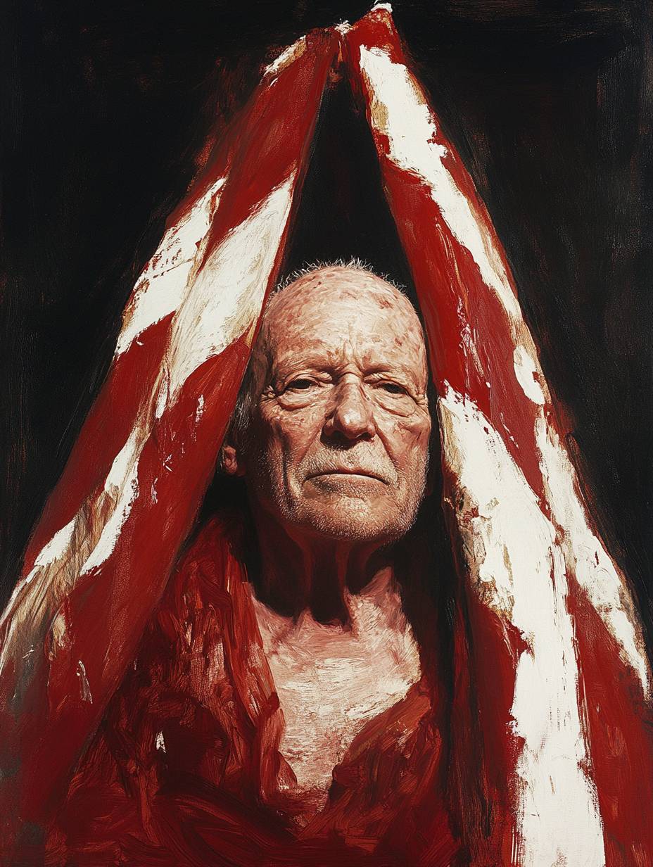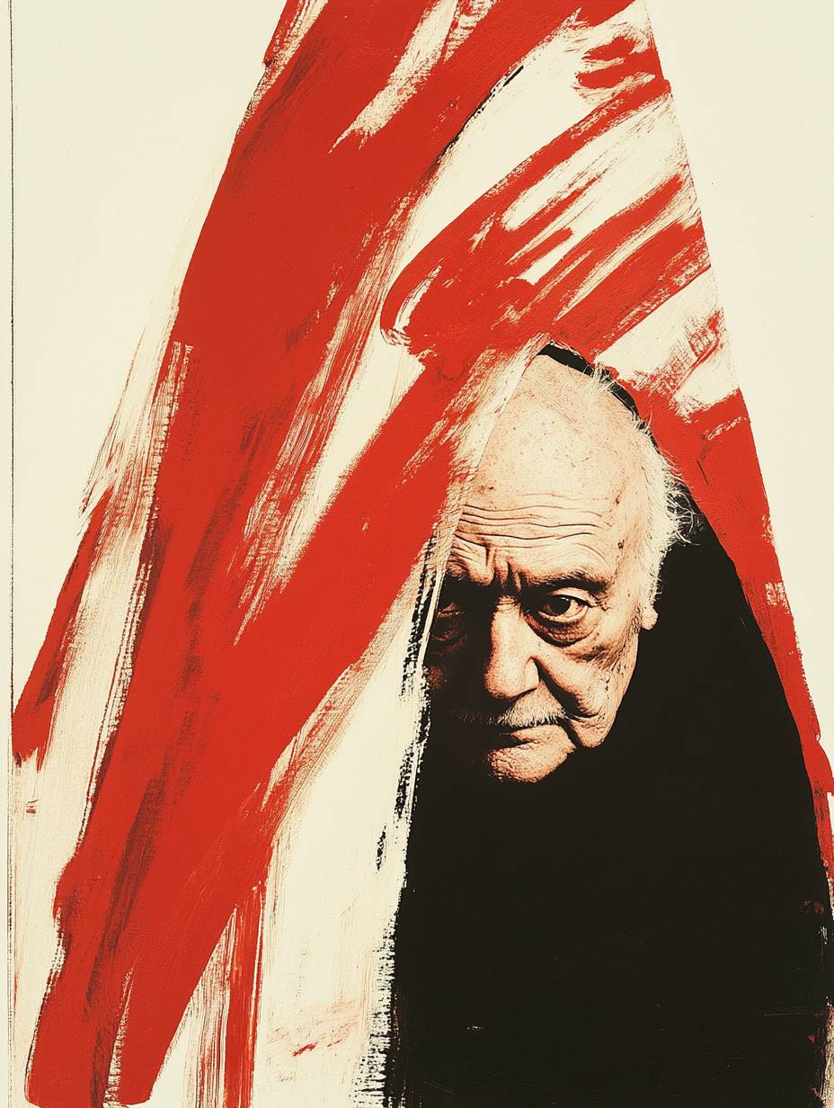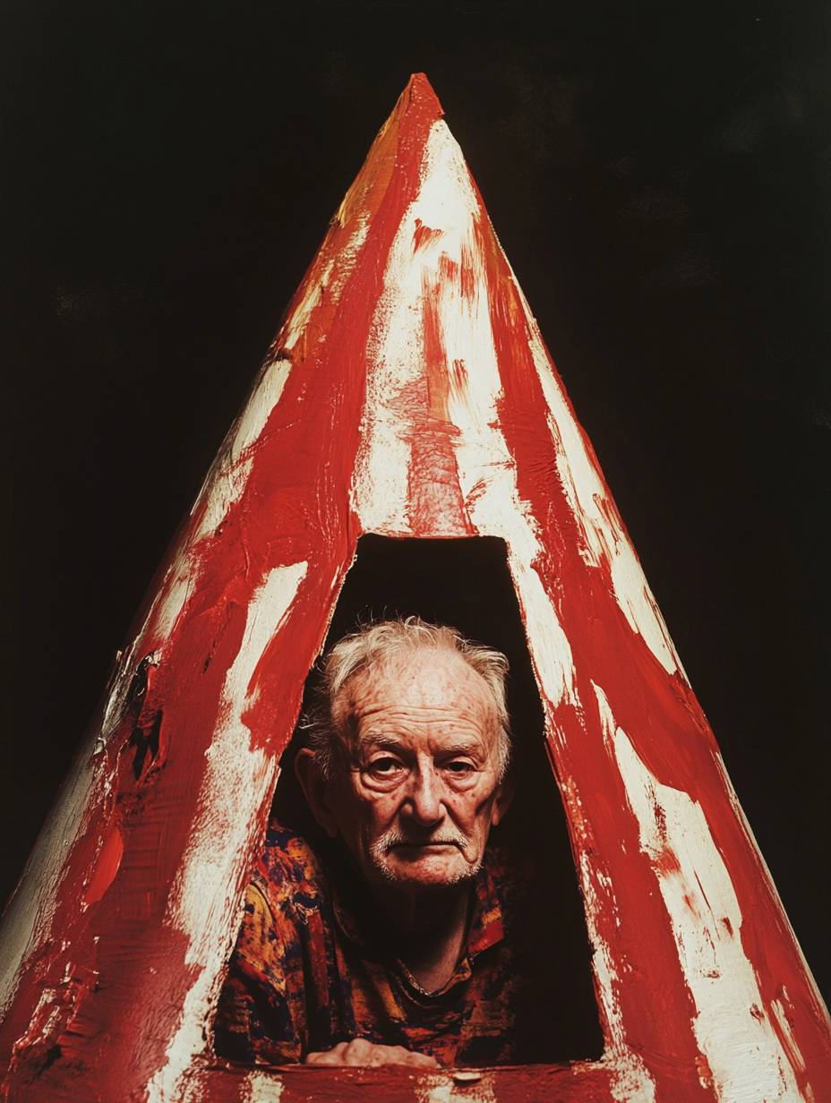 quirky illustration of an elderly figure peeking out from inside a striped, cone-shaped structure resembling a circus tent, wrinkled features, mischievous expression, geometric patterns, eccentric wisdom, exaggerated perspective on cone, subtle texture overlays, playful shadow casting, whimsical circus atmosphere, --ar 3:4 --style raw --sref 2667432155 --personalize rd9y55c --v 6.1