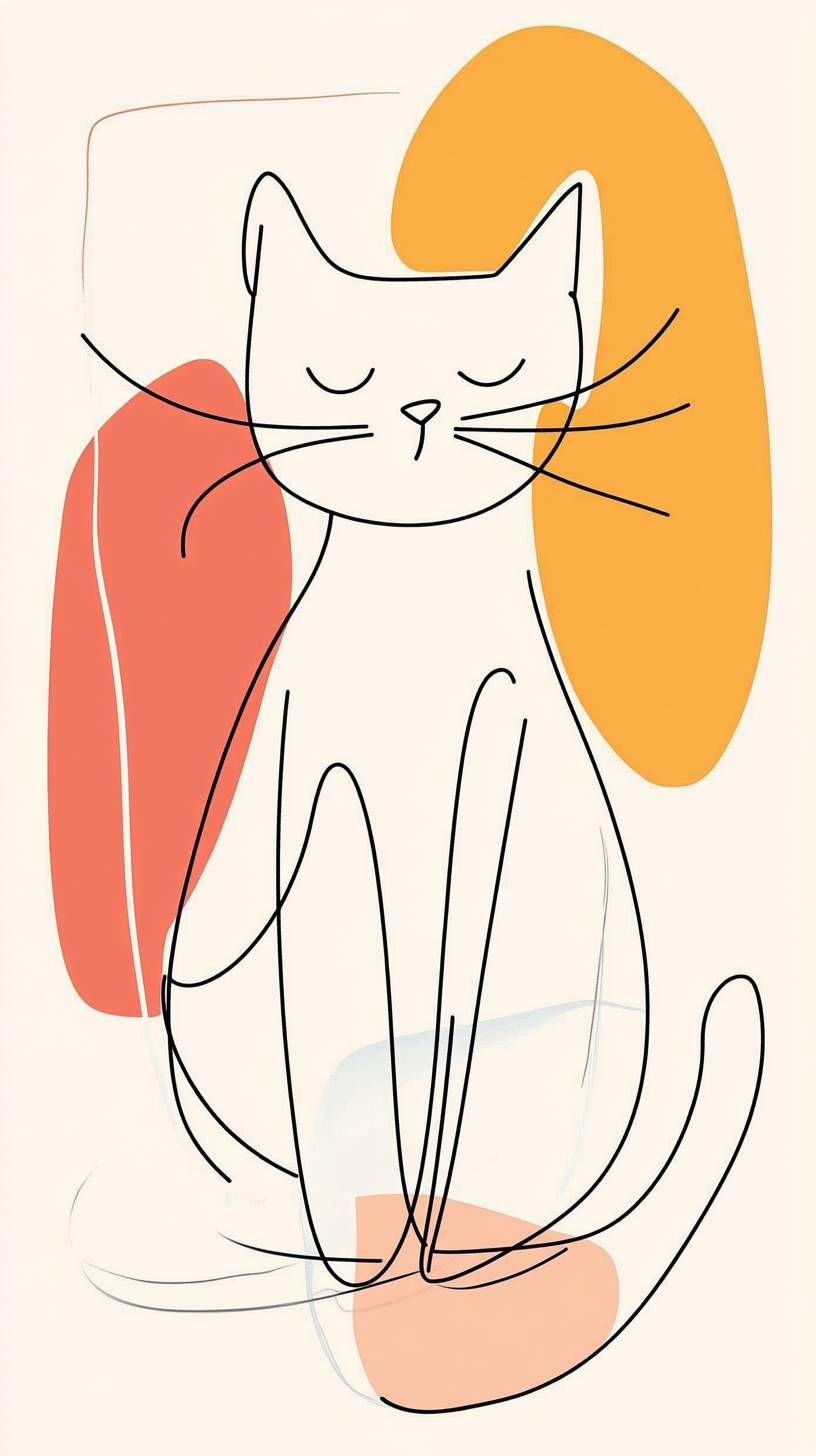 Портрет кота в полный рост в абстрактном минималистском плоском стиле (должен быть очень абстрактным), рисованный от руки граффити контур, с несколькими простыми линиями, очерчивающими его причудливое выражение и игривую позу. Высоконасыщенный фон дофамина чистого сплошного цвета с большим количеством белого пространства на изображении. Обои в высоком разрешении.