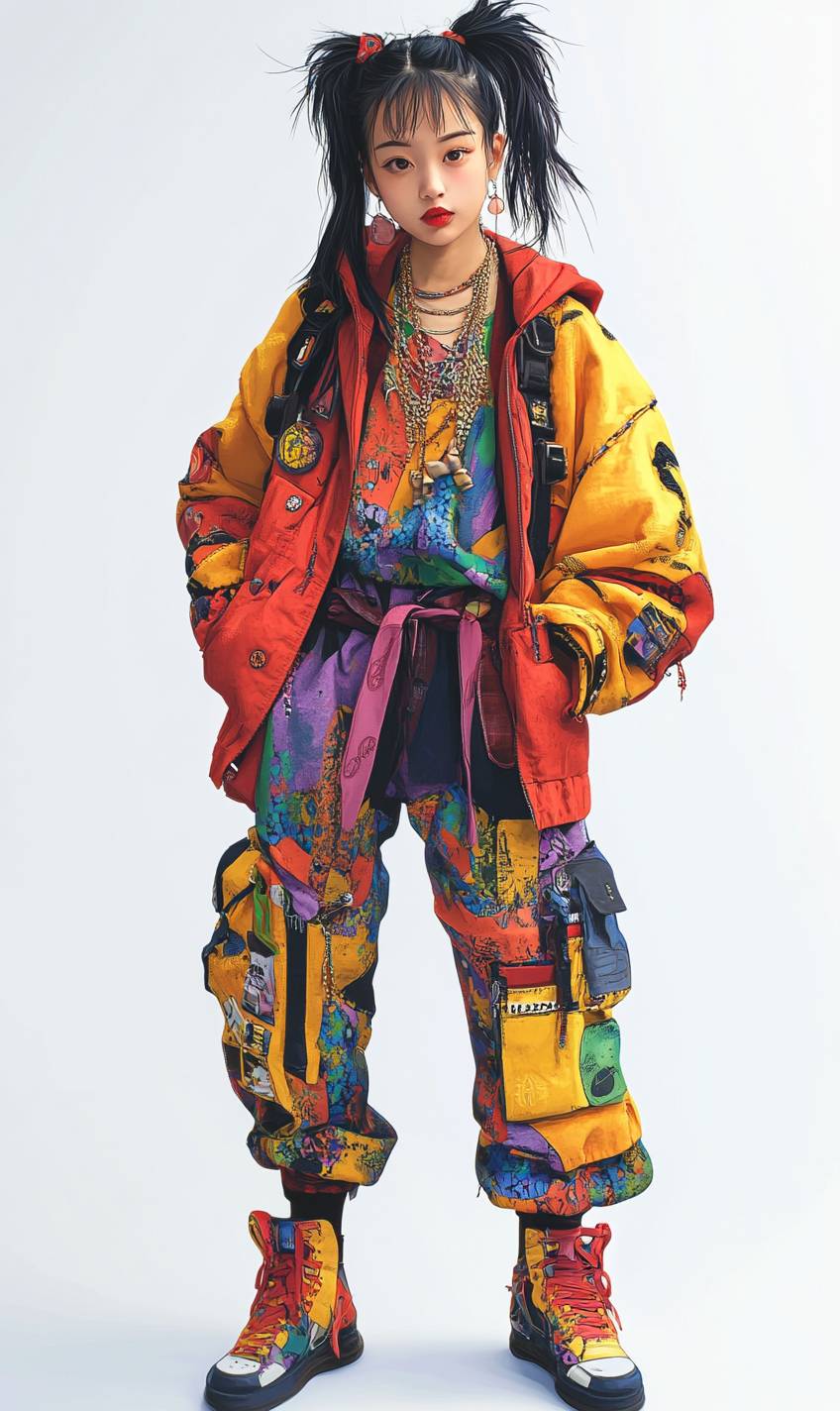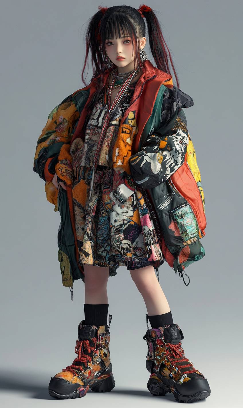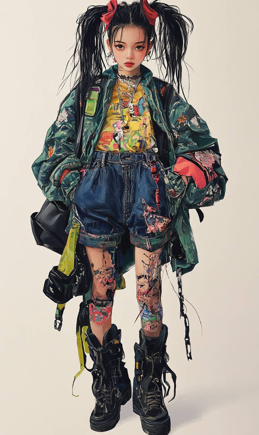Милая 16-летняя японская девушка с атмосферой сплетен запечатлена в реалистичном стиле на полном теле. Она одета в эклектичный наряд, подчеркивающий ее уникальное чувство моды, с сочетанием ярких цветов, узоров или нестандартных вещей. Ее поза выразительна и индивидуальна, отражая уверенность и личность. Ее кожа обладает слегка текстурированной качеством, добавляющим реализма. Фон также уникален и привлекает внимание, дополняя ее наряд и позу. Сцена подчеркивает ее молод charm и индивидуальность, изображенные в живом и детализированном ключе.