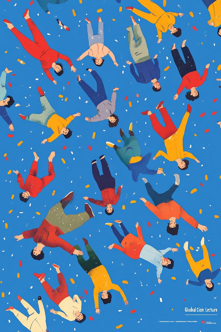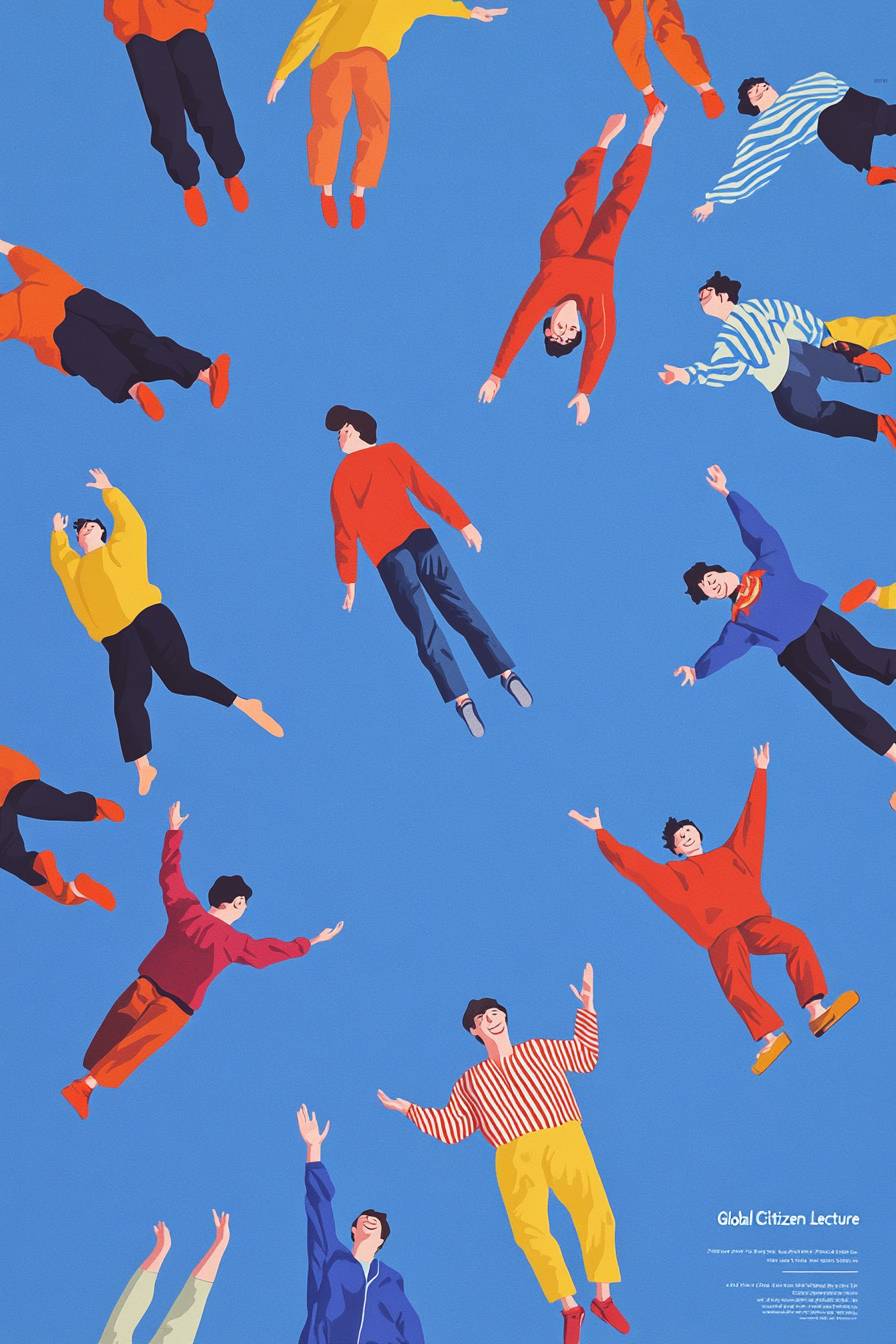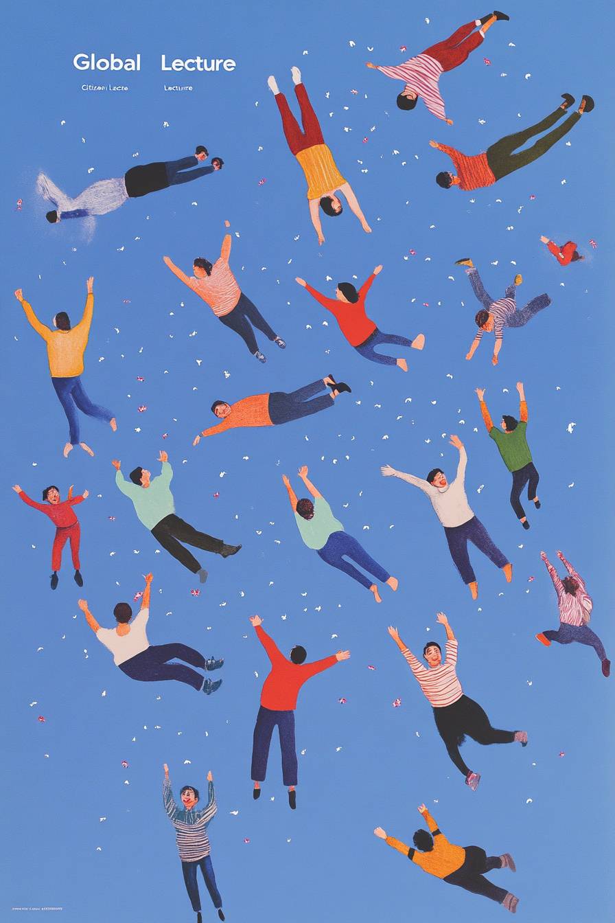 A poster with the words "Global Citizen Lecture" and illustrations of people in colorful, smiling while falling from sky, representing social progress towards utopia . The background is blue, symbolizing calmness. by John Holcroft for Yves Klein, minimalism Seed::10 --ar 2:3 --v 6.1