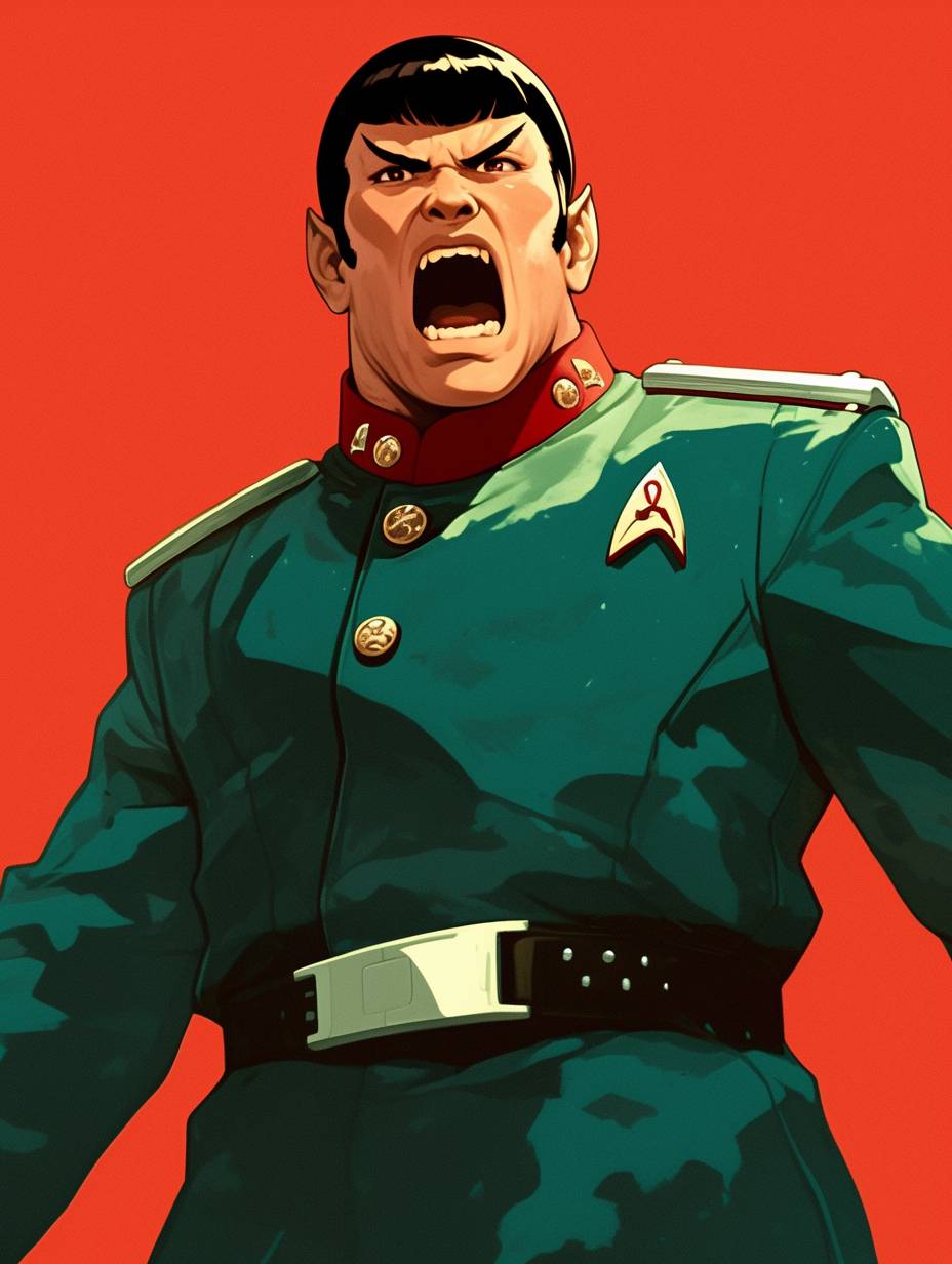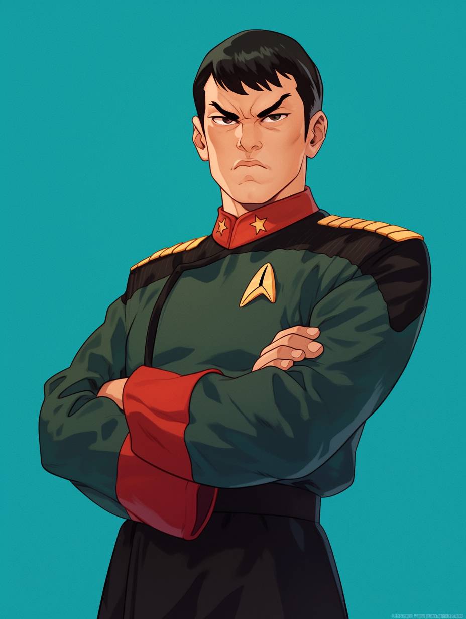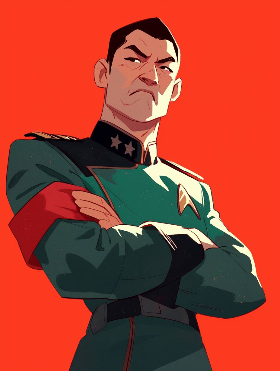 Портрет сердитого азиатского мужчины, одетого в форму адмирала «Звёздного пути», зеленый, красный, белый и черный униформы, в стиле карикатуры.