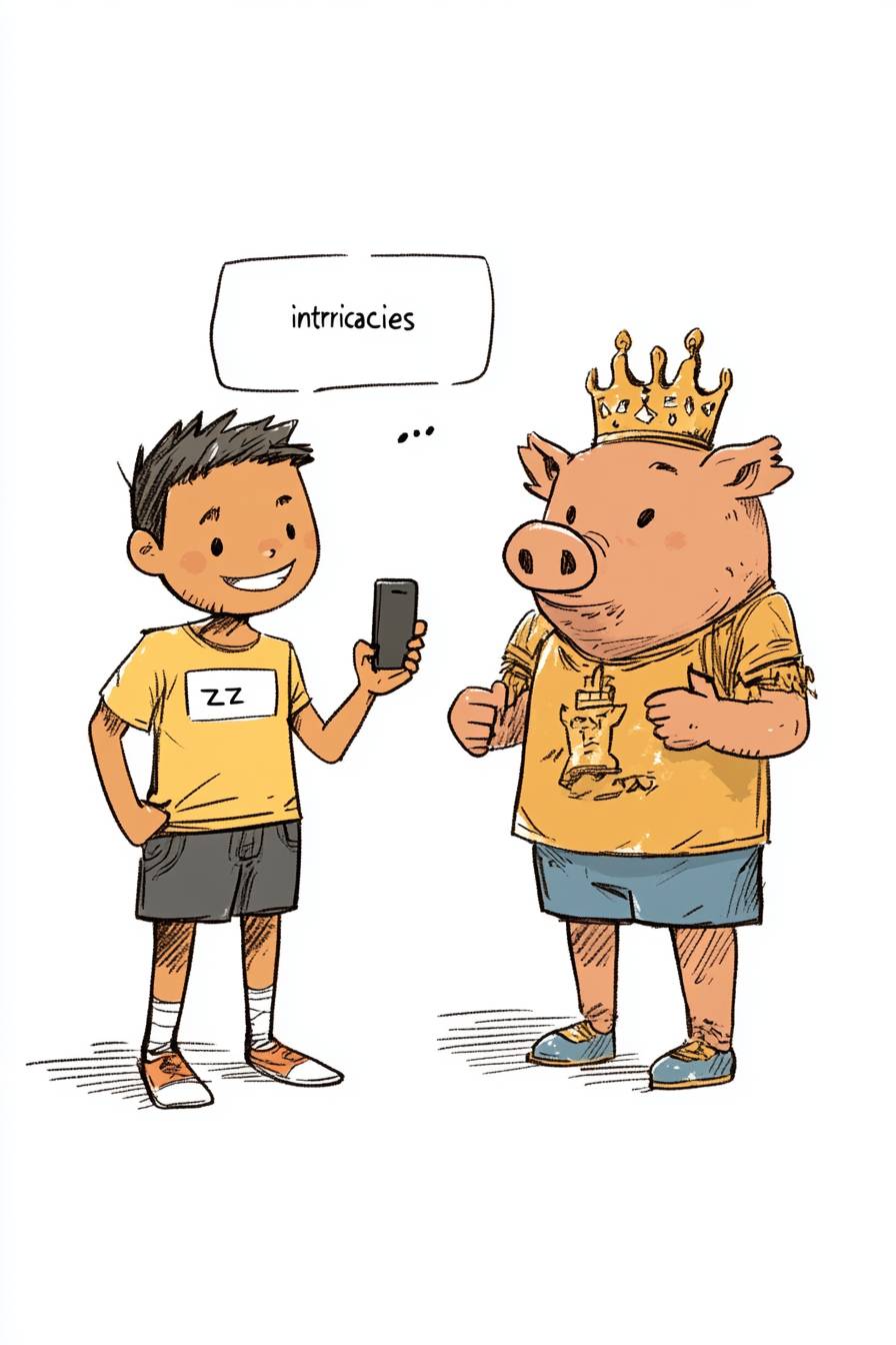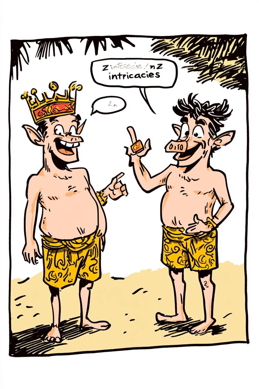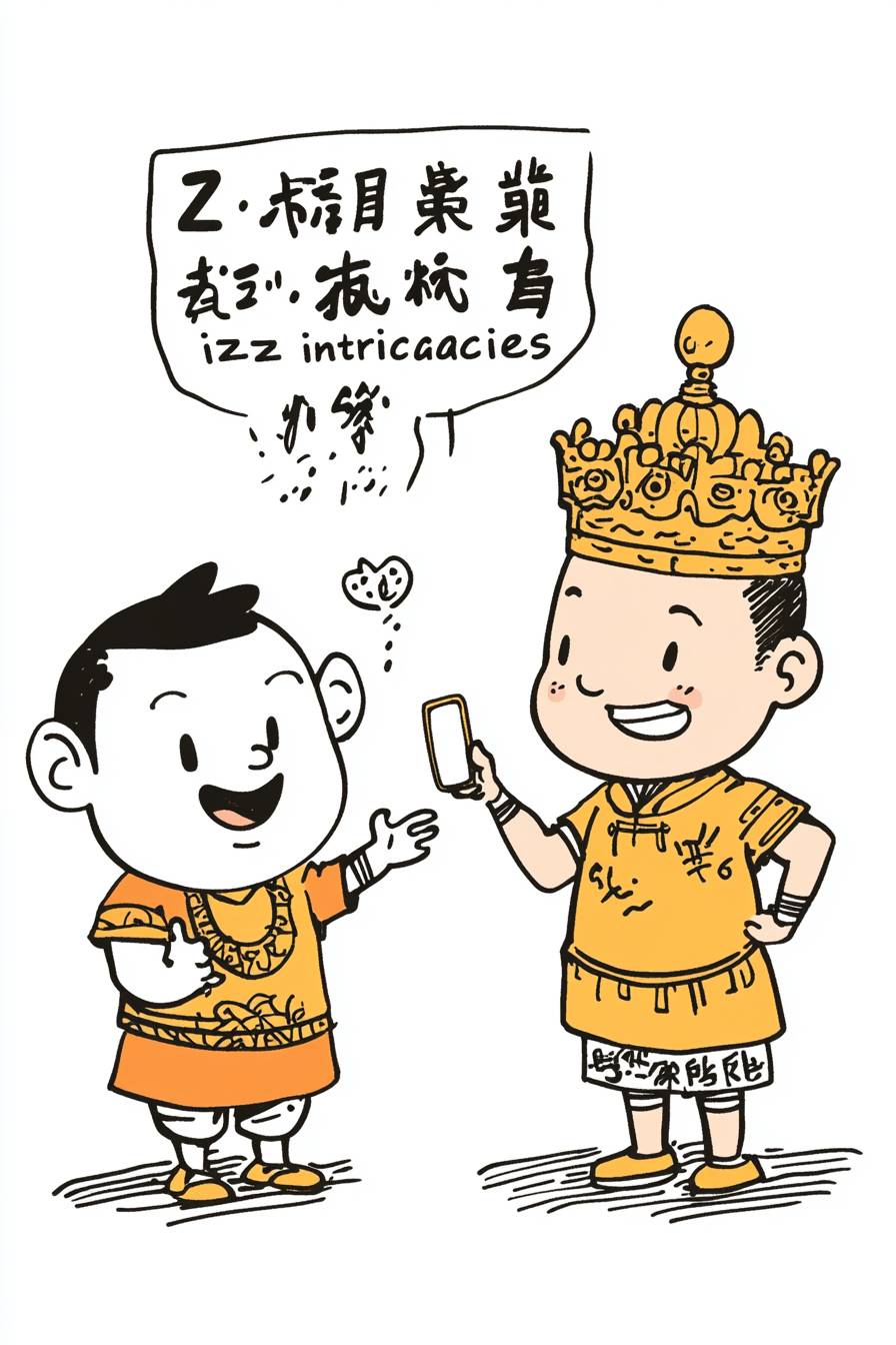 Cartoon, simple drawing of two people in the style of Chinese New Year comics. The first person says "z intricacies", and another character smiles while holding out his hand to make an iPhone gesture. A king with yellow stands next to him wearing crown and shorts. On white background. This is a cartoon comic page featuring characters from multiple poses. In one panel. It has text on top that reads 'This year will be great!'. Two boar heads. Wearing gold armor. Isolated on blank white backgrounds. Black outline lines --v 6.1 --ar 2:3