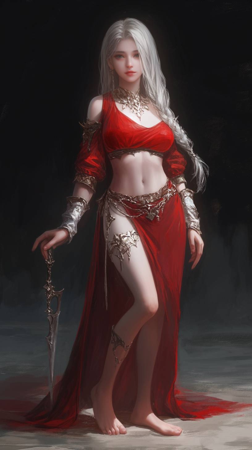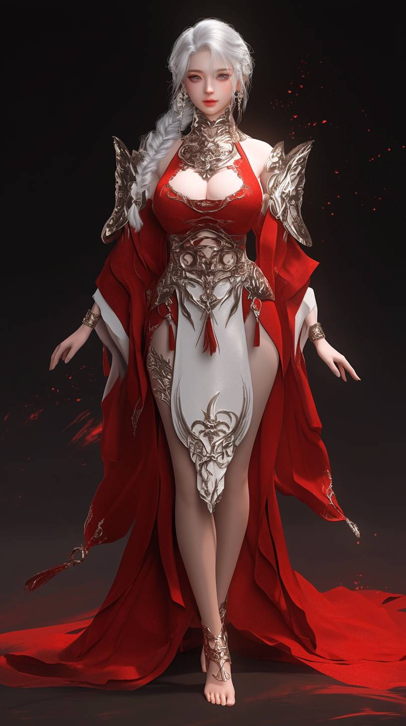 Большие области пустого пространства в стиле Wlop, грубая зернистая текстура, девушка в древнем стиле, идеальное лицо, красная одежда и белые волосы, выразительные глаза, босиком, непринужденные линии, контрастные визуальные эффекты, уникальный и смелый стиль, смелые линии, изысканный серебряный аксессуар на талии, дизайн персонажей для игр, рендеринг, Blender.