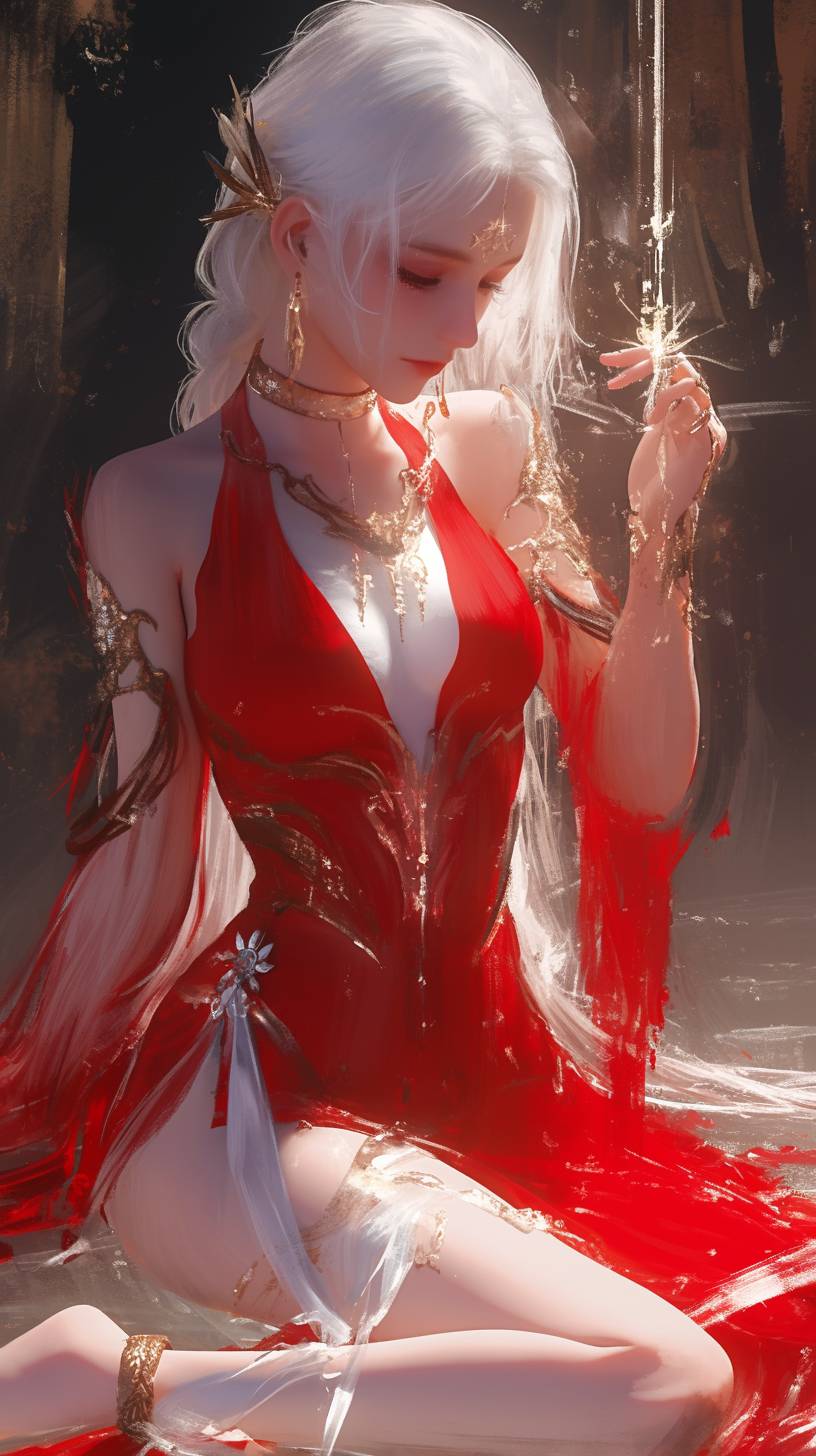 Large areas of blank space, in the style of Wlop, a rough grainy texture, a girl in ancient style, a perfect face, red clothes and white hair, expressive eyes, barefoot, carefree lines, contrasting visuals, a unique and bold style, bold lines, exquisite silver waist accessory, game character design, rendering, blender. --ar 9:16 --niji 6