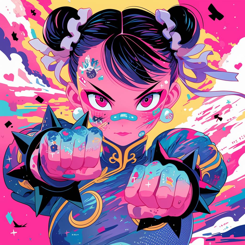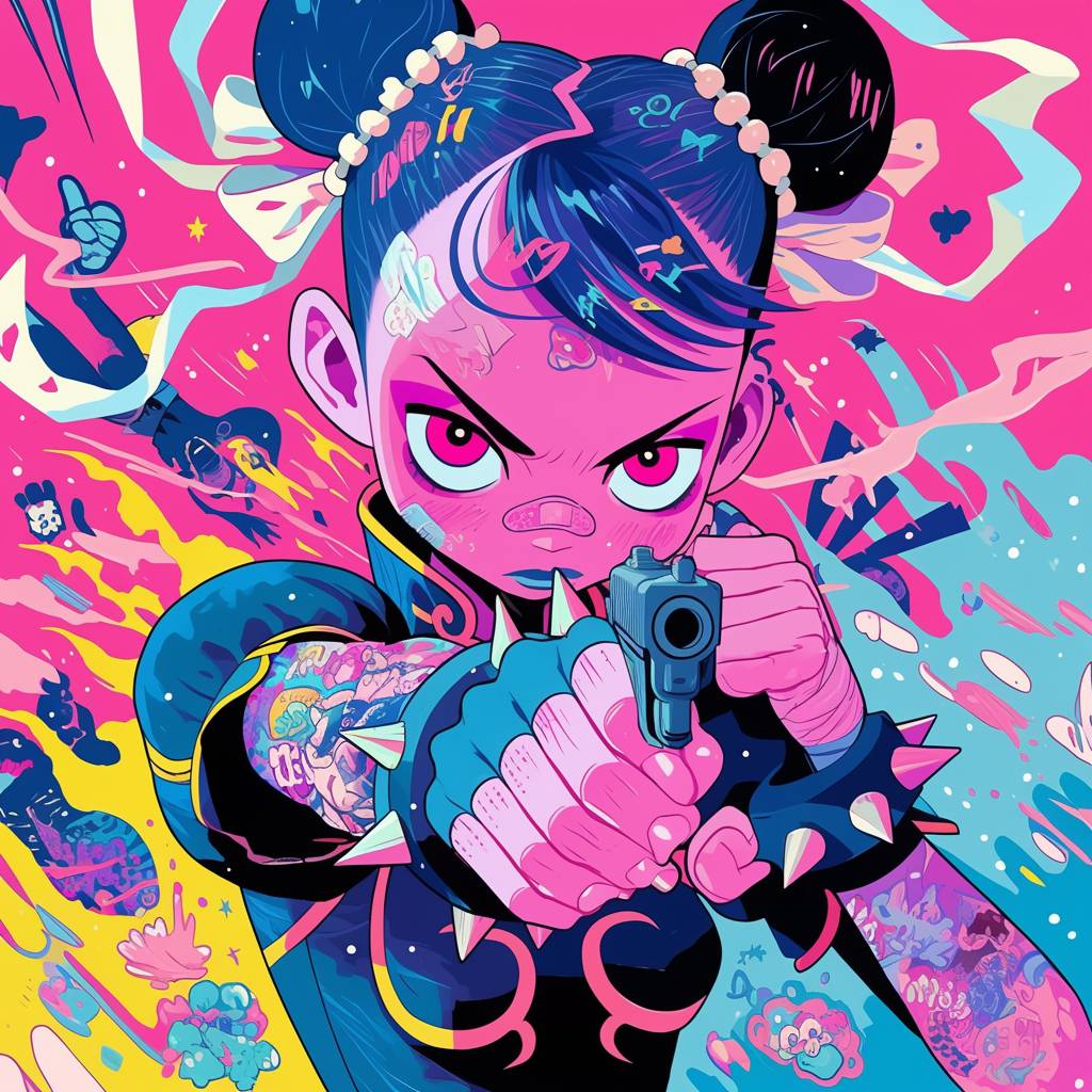 Детальная иллюстрация Чунь-Li, в стиле кибер-психопата, одетой в киберпанковский костюм и снаряжение, с деталями и цветами в стиле Джоджо, представлена в кинематографическом широком кадре, где Чунь-Li направляет пистолет на камеру, иллюстрация Хиройко Хараки, обложка комиксов.