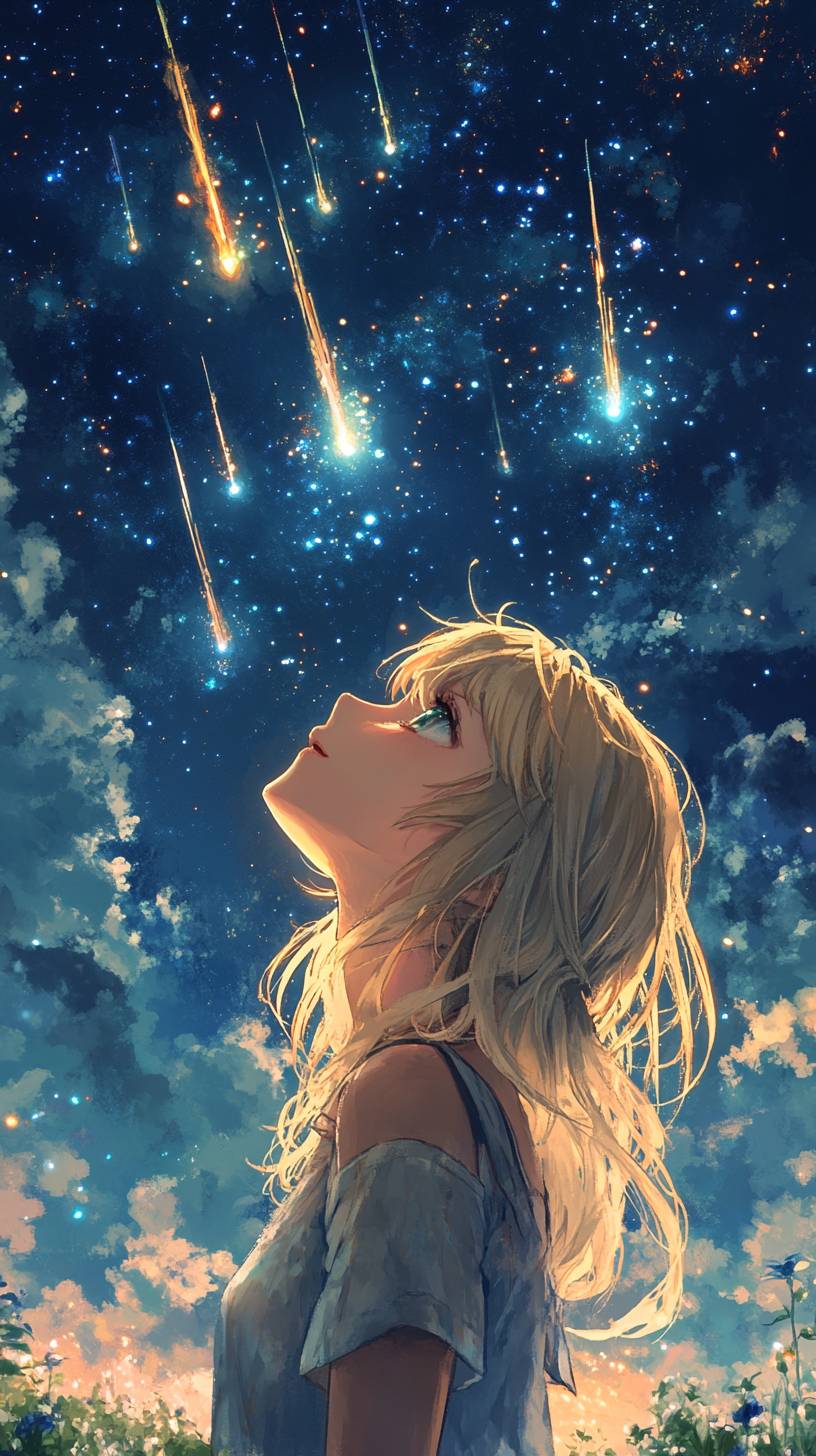 Стиль аниме для обоев на телефон, блондинка в возрасте 20 лет с чистой и красивой внешностью корейской идолки смотрит на небо. Ночное небо заполнено падающими звездами, изображенными в акварельном стиле.